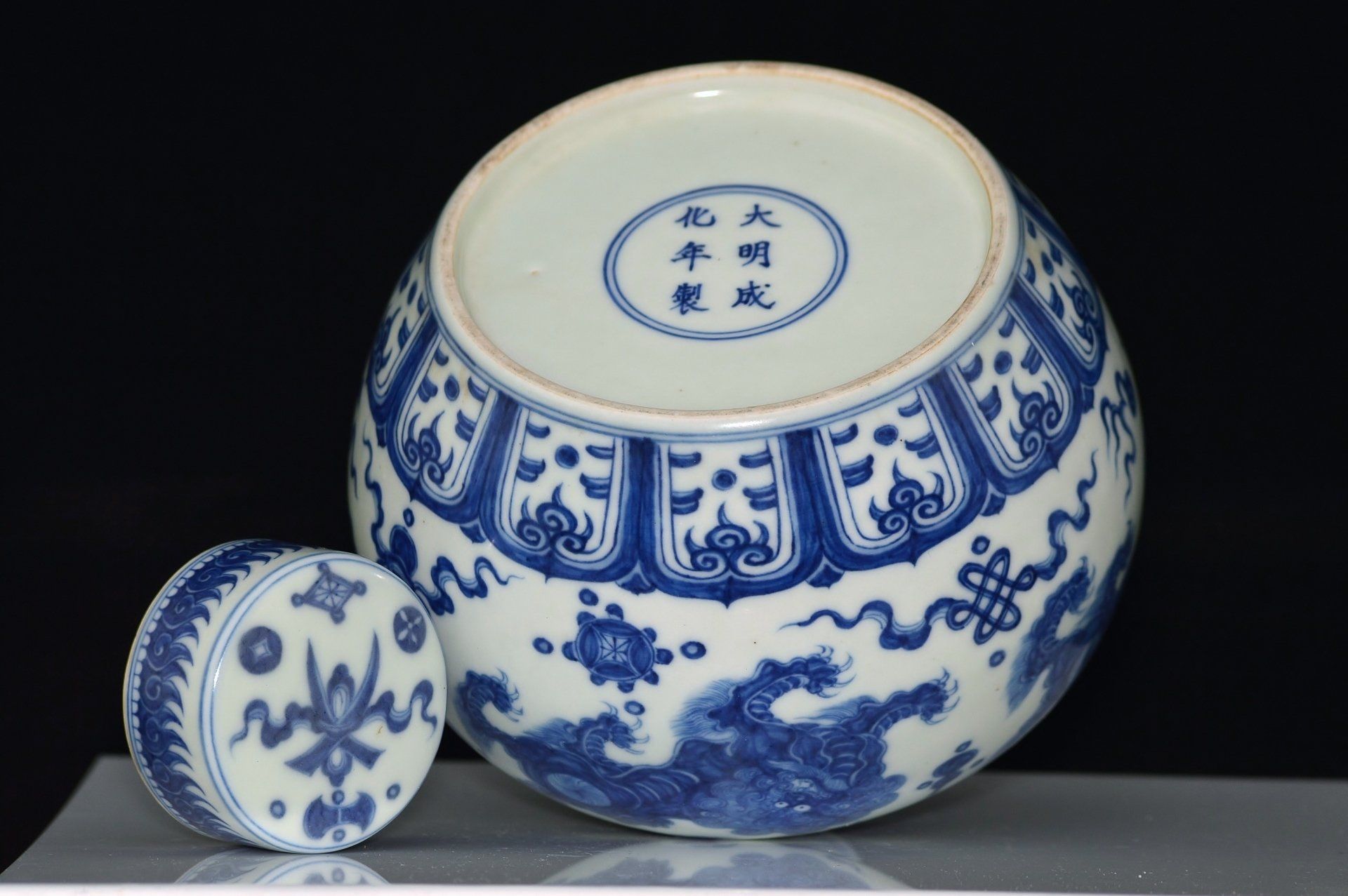 这件精美的明代成化款青花瓷狮子罐,是成化时期(1465-1487年)艺术的典范之作。罐高约5 1/8英寸,是备受推崇的成化瓷器的典型代表。其精湛的工艺展现了非凡的技艺和精准度,唯有亲眼鉴赏才能真正领略明代工匠的艺术造诣。查阅拍卖图录、学术著作和博物馆藏品,您很难在市场上找到与之媲美的成化瓷罐。此罐造型优美,色彩鲜艳,饰以精妙的自由笔触,笔法看似简约,实则精雕细琢。这种对细节的极致追求正是成化瓷器品质的体现。罐身饰有四尊佛狮和各种佛教符号。用珠宝放大镜观察,可以发现素坯有明显的剥落,这表明这件陶罐年代久远。在中国陶瓷中,成化时期的青花瓷最为珍贵,其标志性的钴蓝色调尤为引人注目。成化时期使用的钴蓝带有独特的黑色调,源自进口的萨马利蓝钴蓝,据信产自波斯,但具体来源尚不明确,且已超过五个世纪未再进口。此外,当地还使用一种名为皮塘的钴蓝。这两种钴蓝的混合运用,造就了成化瓷器精致的色彩,也正是这种色彩构成其美学特征的关键所在。这一时期的工匠技艺精湛,以细腻的线条勾勒轮廓,再以宽阔的笔触填充,展现出独特的构图手法。陶土的精炼和高温窑烧制常常造就一些独特的审美特征,例如大型器皿底部的斑驳纹理,或在反射光下可见的波纹状釉面。这种釉面质地细腻,且在放大镜下可见细小均匀的气泡,因此极易辨认。总之,真正的成化青花瓷代表了明代陶瓷艺术的巅峰,而这件罐子正是这一辉煌历史的见证。