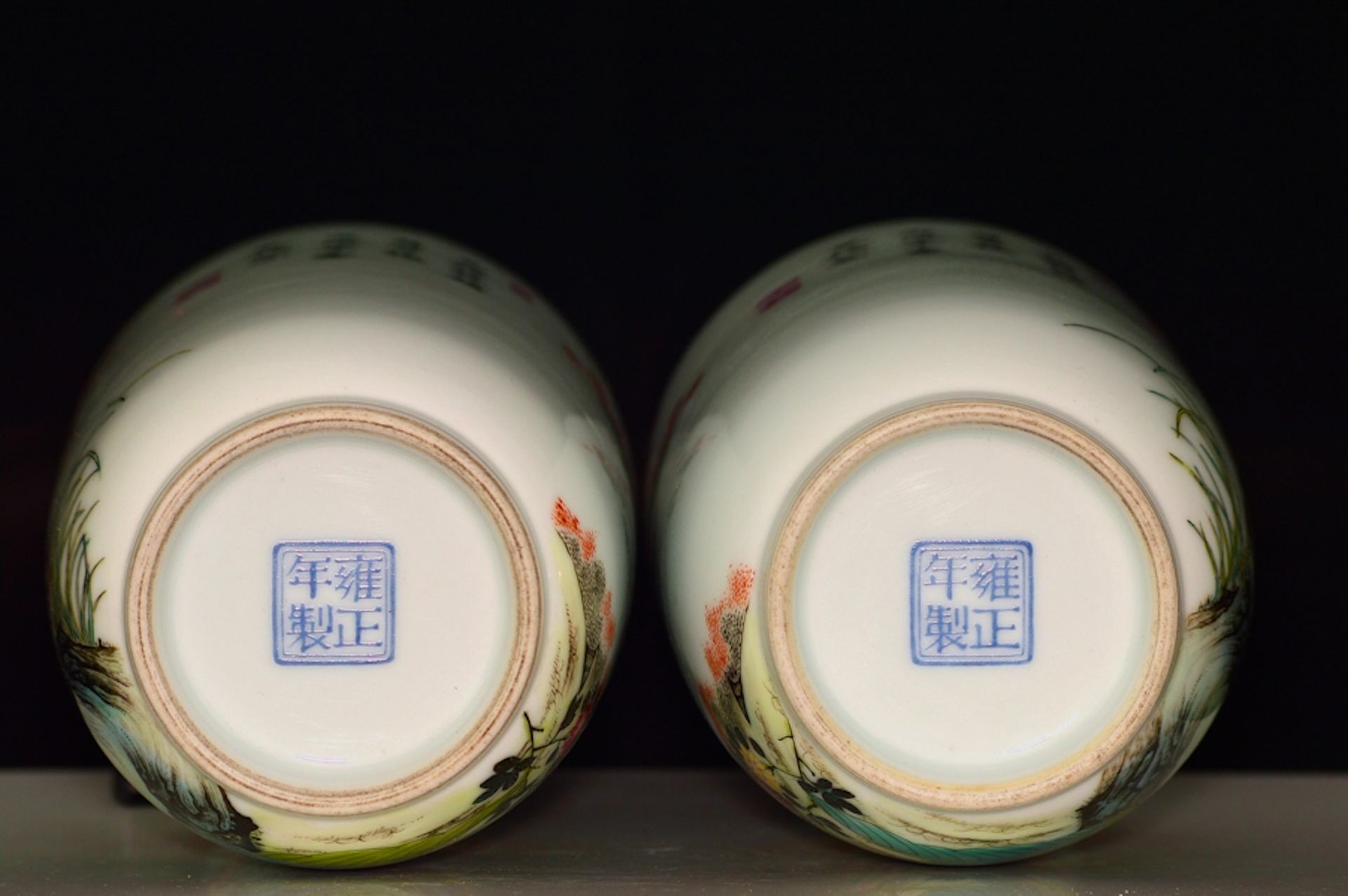 这些精美的珐琅彩瓷瓶胎体极薄,于雍正时期(1723-1735年)在北京紫禁城内装饰而成。这些瓷瓶采用珐琅彩绘制,据说雍正皇帝亲自监督了瓷器的制作。制作这些瓷瓶需要极高的技艺和控制力。仔细观察,您就能领略真正的中国陶瓷杰作的风采。仔细观察,放大观察叶子、花朵和枝条,您会发现其中的细节、色彩和明暗对比,正是这些赋予了瓷瓶平衡感和层次感。这些瓷瓶的素烧部分有剥落,这证明它们年代久远。收藏家必须学会辨别一件普通瓷器与一件伟大作品或杰作之间的区别。大多数清代瓷器,如果您仔细观察,就会发现它们是由技艺不精的艺术家绘制的,因此显得扁平,缺乏平衡感、细节和层次感。注意细节、色彩平衡和明暗处理,这将有助于您观察和理解它们之间的差异。这些花瓶造型精致,饰以枝条、盛开的梅花和飞鸟图案。雍正法兰嘎彩的色彩运用独具特色,其柔和的粉彩色调尤其在粉色系中体现得淋漓尽致,使这些瓷器极易辨认。瓶底镌刻有一首诗,并钤有三枚印章。瓶底的“雍正”四字款由北京的彩绘师以蓝釉双方格纹饰添加。这对花瓶并非完全相同,这在雍正瓷器中十分常见。花瓶上的飞鸟图案极其精细,仅羽毛的描绘就耗费了上千笔细线,仅用放大镜才能观察到。放大照片,您就能看到鸟儿身上细小的笔触,它们的身体宽度仅约1/2英寸。艺术家的技艺和控制力令人惊叹。这些器物的品质堪称精湛,您可以查阅拍卖目录、书籍、博物馆,看看能否找到比这更好的雍正花瓶。这对花瓶