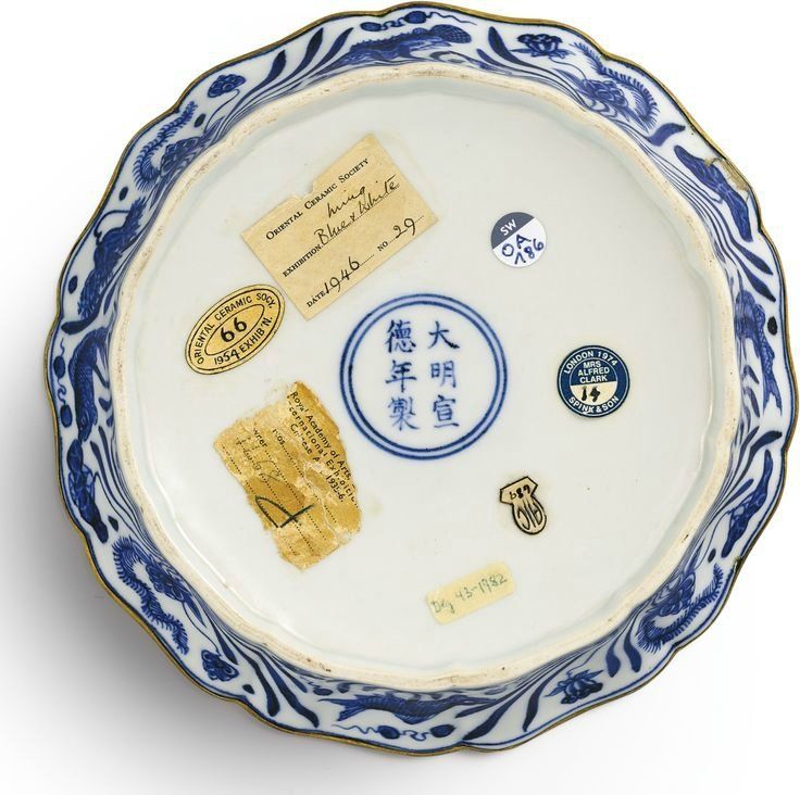 佳士得 2019年5月29日在香港售出这件直径10/3/4英寸的蓝白莲花碟,价格约为 465,000 美元 这件器皿侧面有款识,底部未上釉。这些腐败的拍卖行欺骗所有收藏家,因为他们没有机会购买世界上最稀有、最精美的藏品。此外,由于拍卖行将最精美的藏品排除在拍卖之外,普通收藏家根本不知道他们的藏品在市场上的地位或价值所在。
