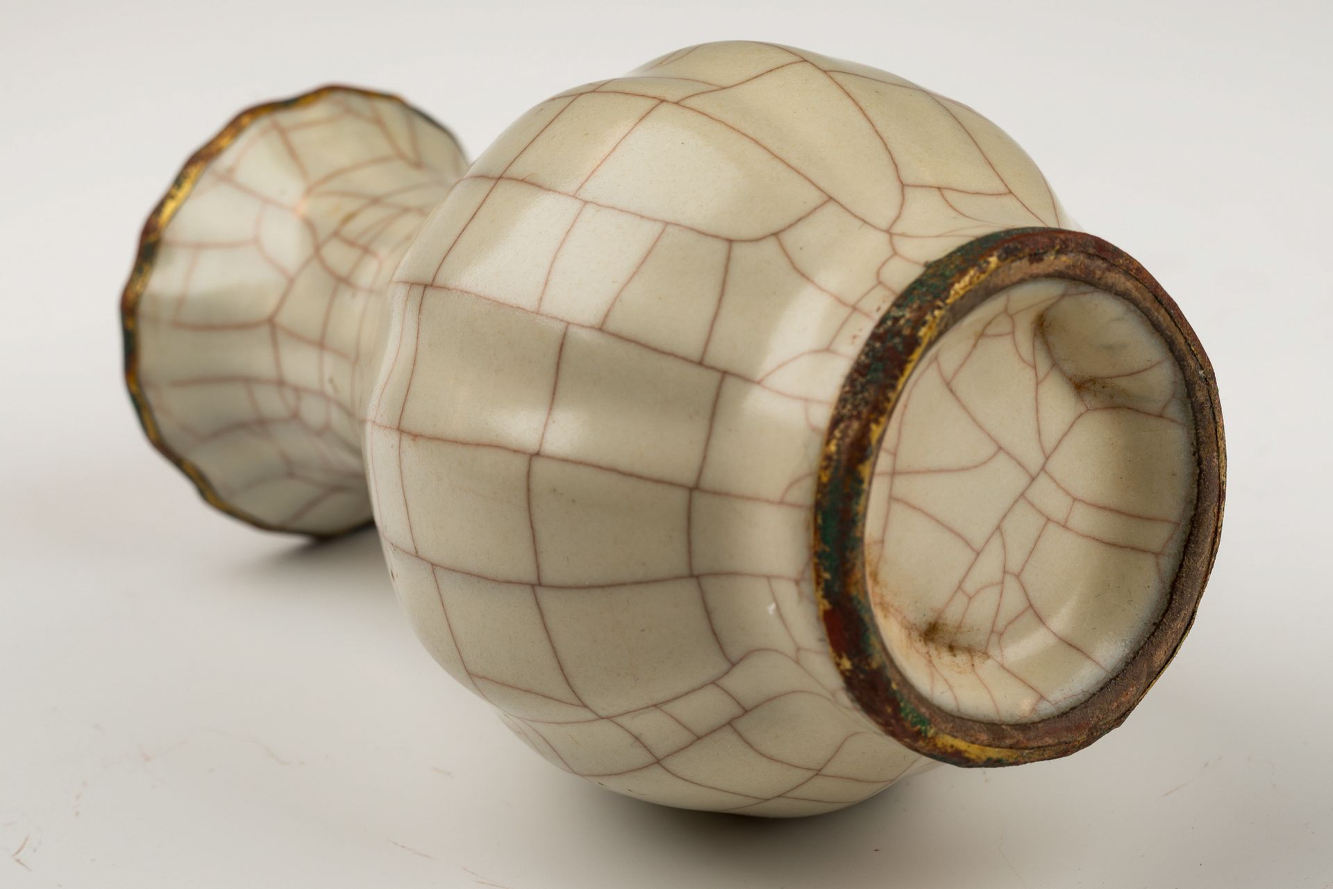 这件精美的南宋官窑时期冠窑纹瓶,堪称帝制时代艺术与工艺的典范。瓶身施以龟裂纹釉,瓶口及瓶底均饰以鎏金纹带。鎏金纹带表面呈现出独特的腐蚀痕迹,层层叠叠的赤铜矿和青绿色的球状孔雀石渗入鎏金铜带的孔隙中。这种独特的腐蚀不仅印证了瓶身的年代久远,更成为其真伪的可靠鉴别手段,其可靠性甚至超越了热释光(TL)检测——这一论断已被艺术专家学者广泛认可。此外,瓶底铁质圈足呈深褐色,这是烧制工艺的痕迹,圈足本身也由深褐色陶土制成。这件器物的历史背景十分引人注目。金军入侵后,北宋被迫于公元1127年迁都杭州,建立南宋王朝。此花瓶高约5又3/4英寸,是一件重要的文化遗产。
