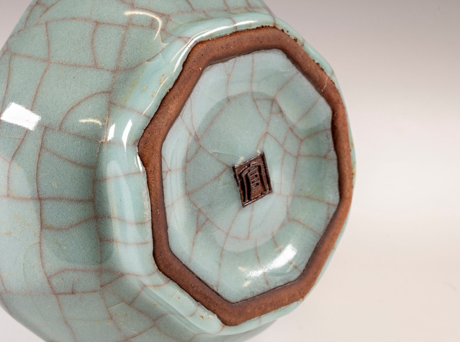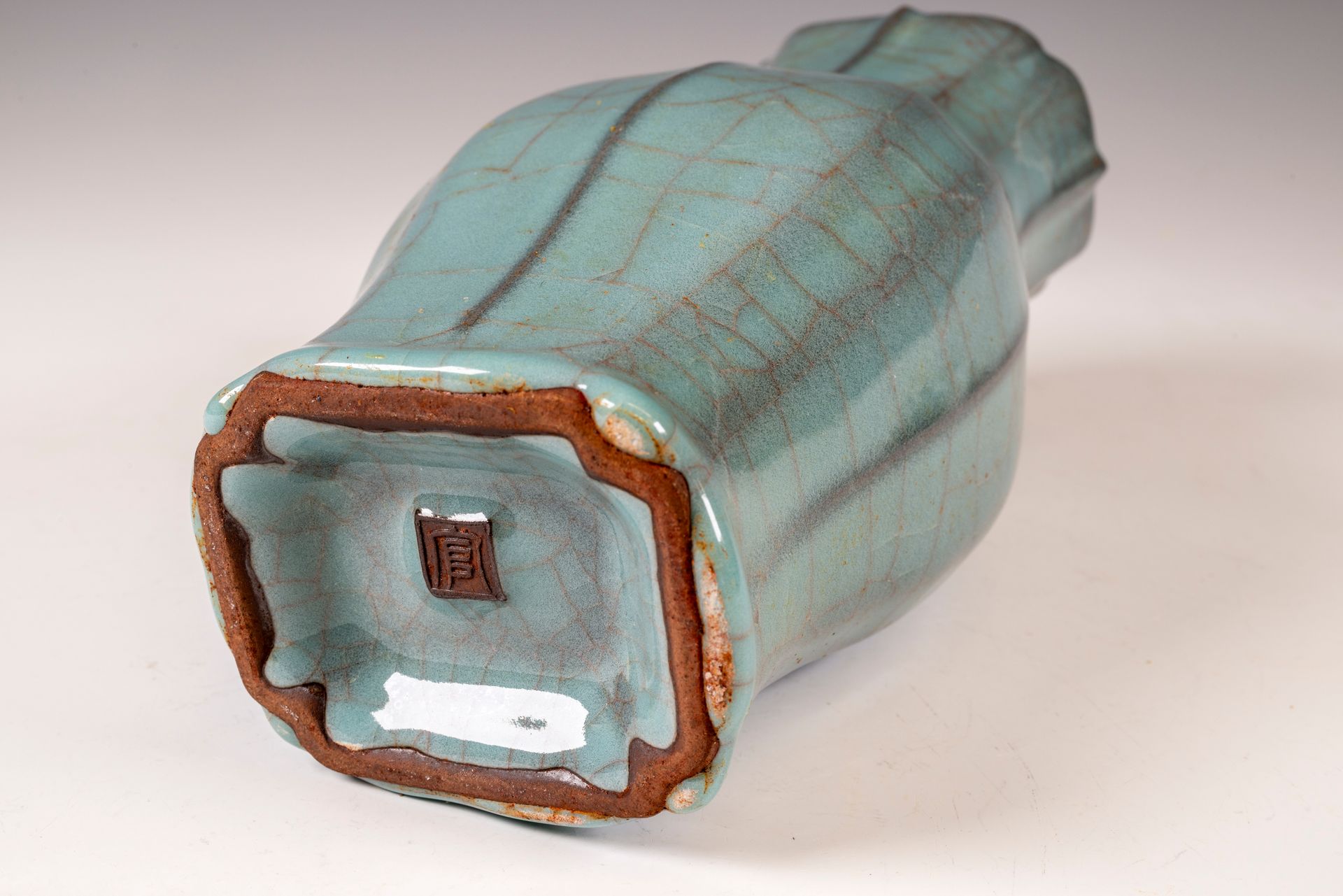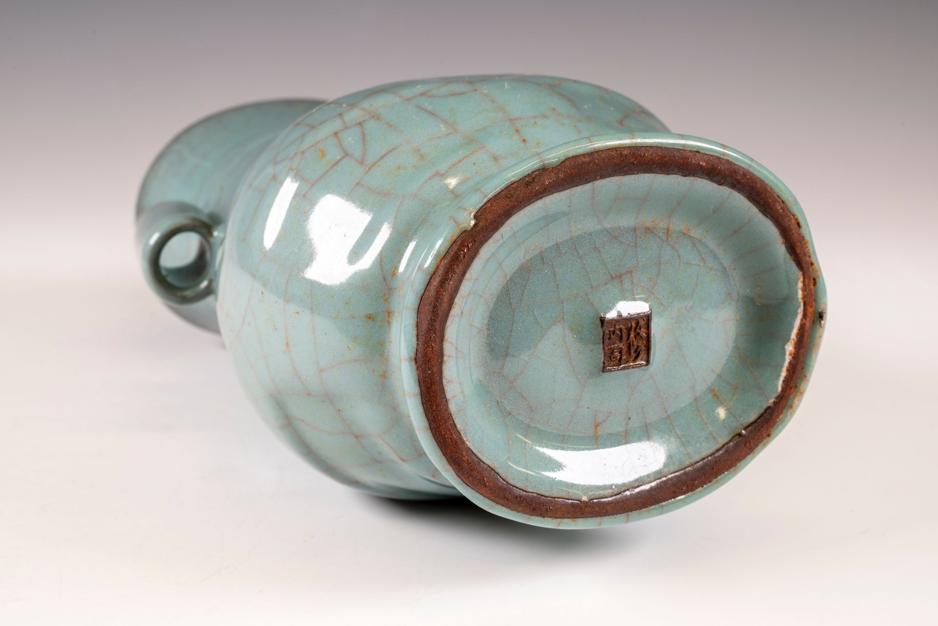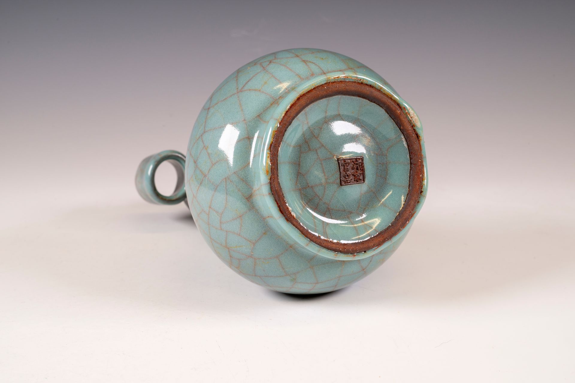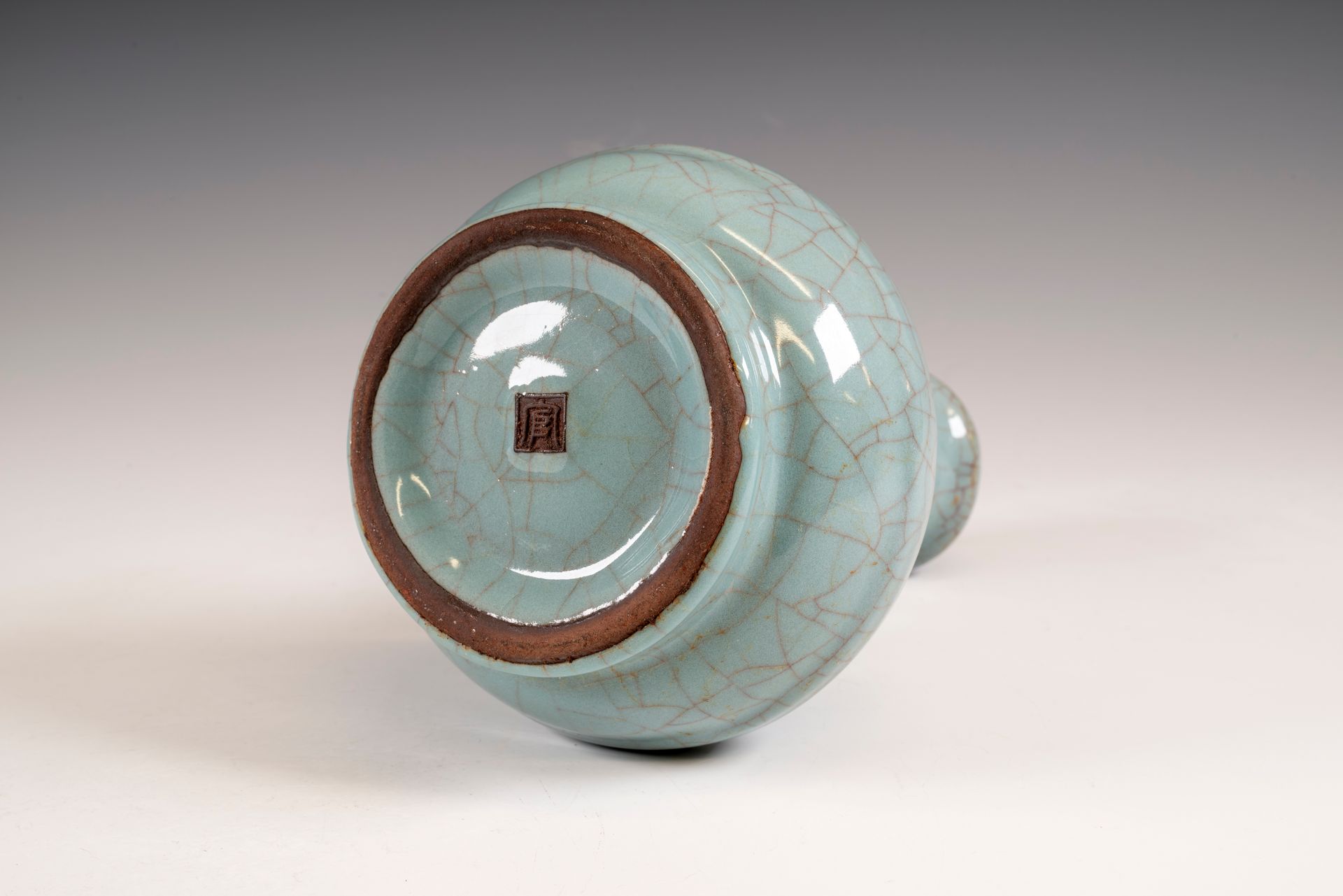 纵观世界各地著名机构的藏品,恐怕很难找到比下图所示的南宋关尧棱纹瓶更为精美绝伦的杰作。这件非凡的器物据信出自著名的秀尼寺内窑。瓶身施以厚重的浅蓝色釉,略带一丝绿意,这是通过多次施釉和烧制而成。厚实的釉层在口沿处明显变薄,露出下方深赭棕色的素烧胎体,表面还带有细腻的龟裂纹。瓶身造型匀称,展现了陶艺大师精湛的技艺。此类器物的特点是胎体精细,明显薄于釉层。此外,瓶底醒目地刻有官方款识,证实了其真品身份。金军入侵后,北宋朝廷于公元1127年迁都杭州,南宋王朝由此建立。