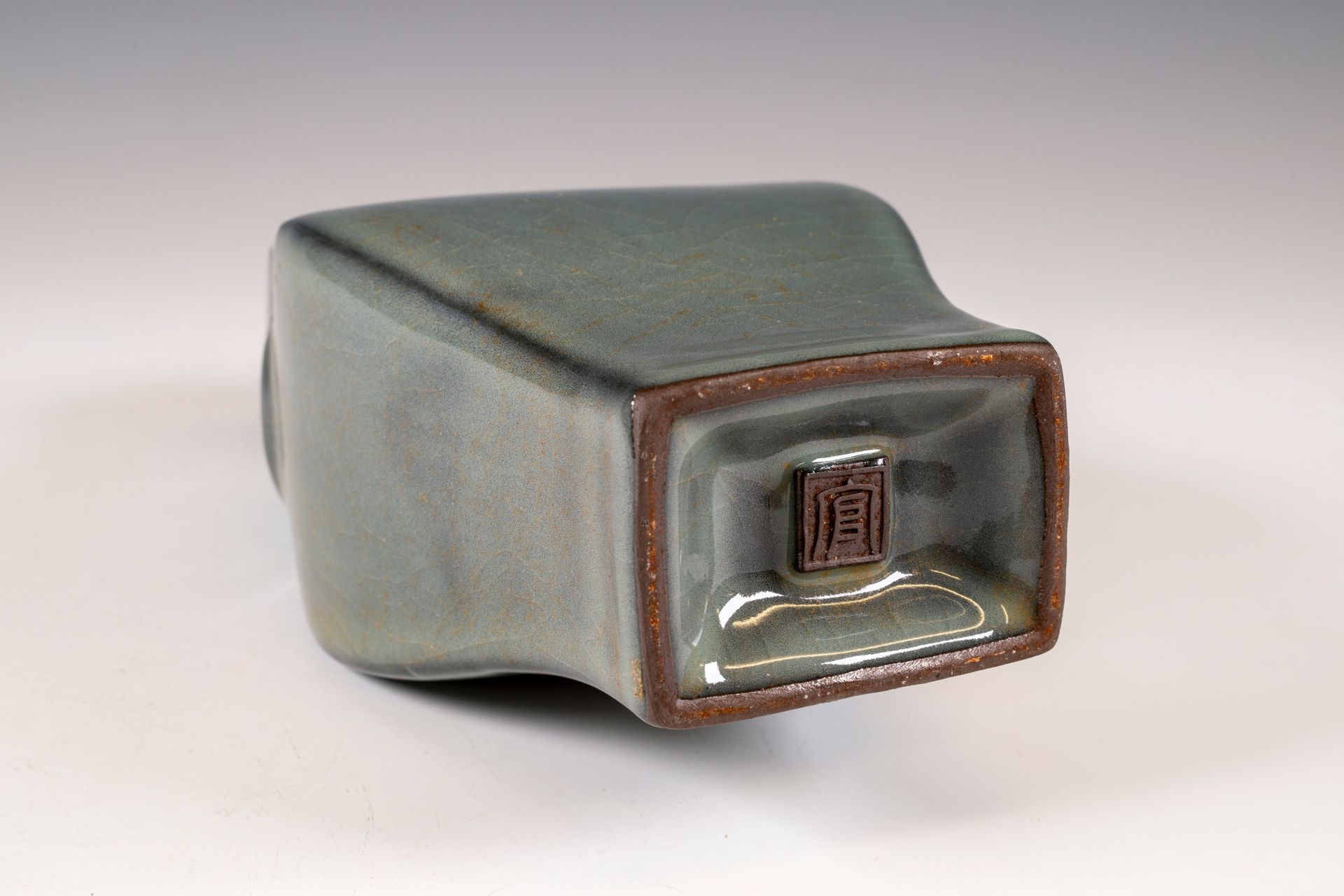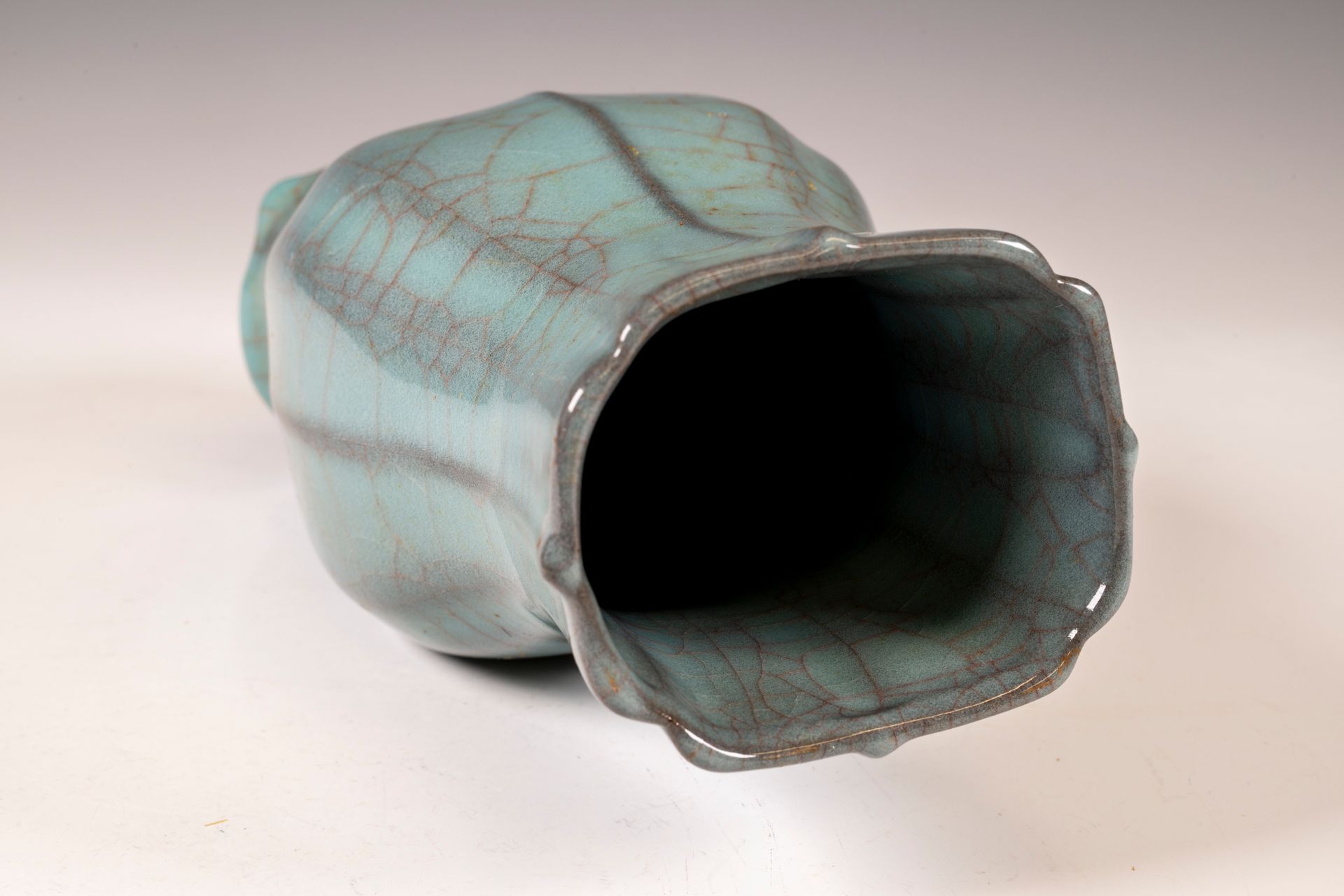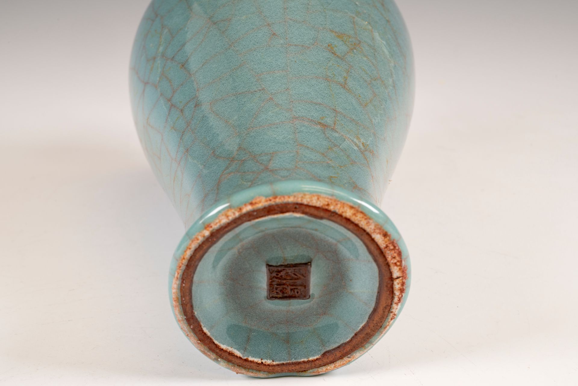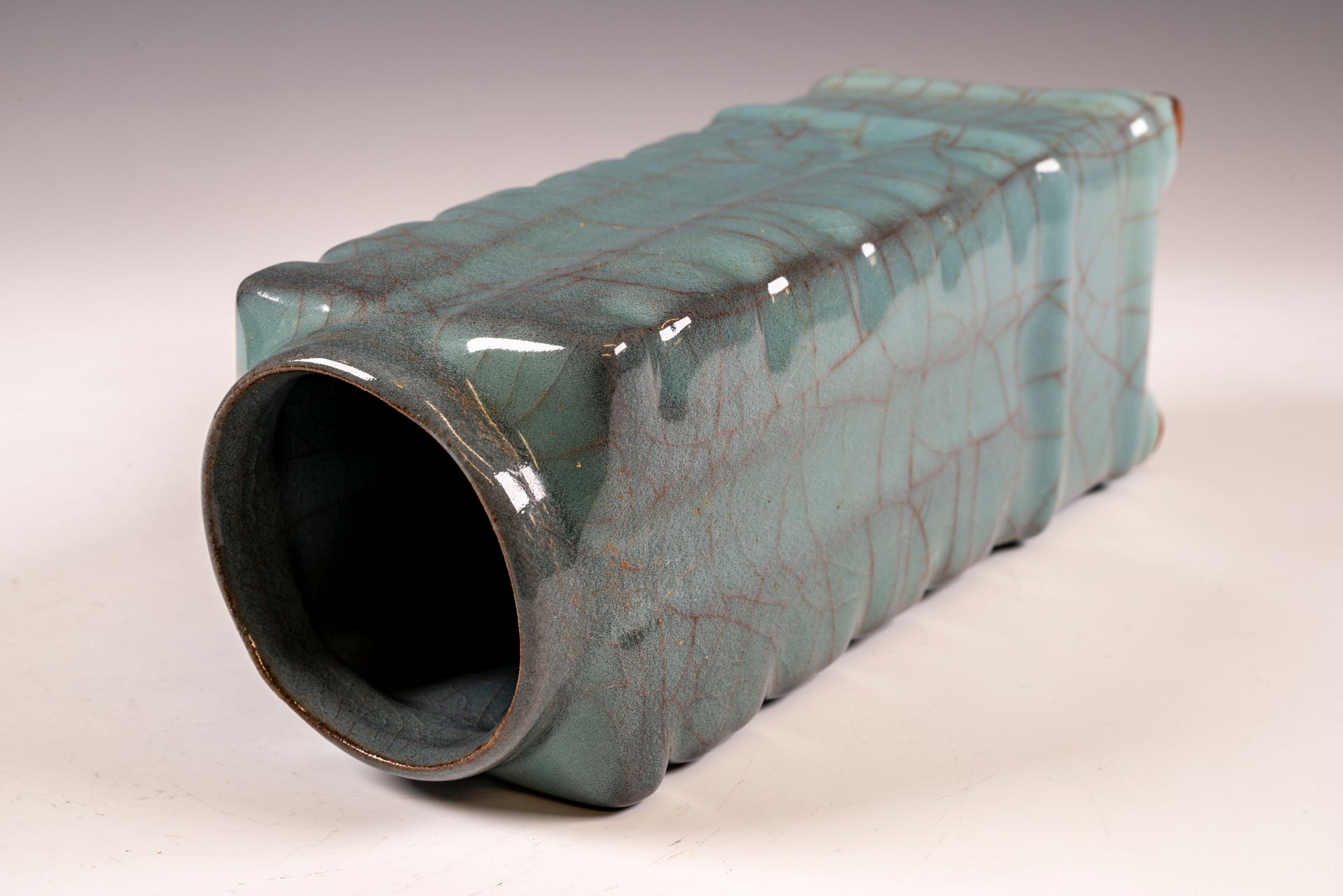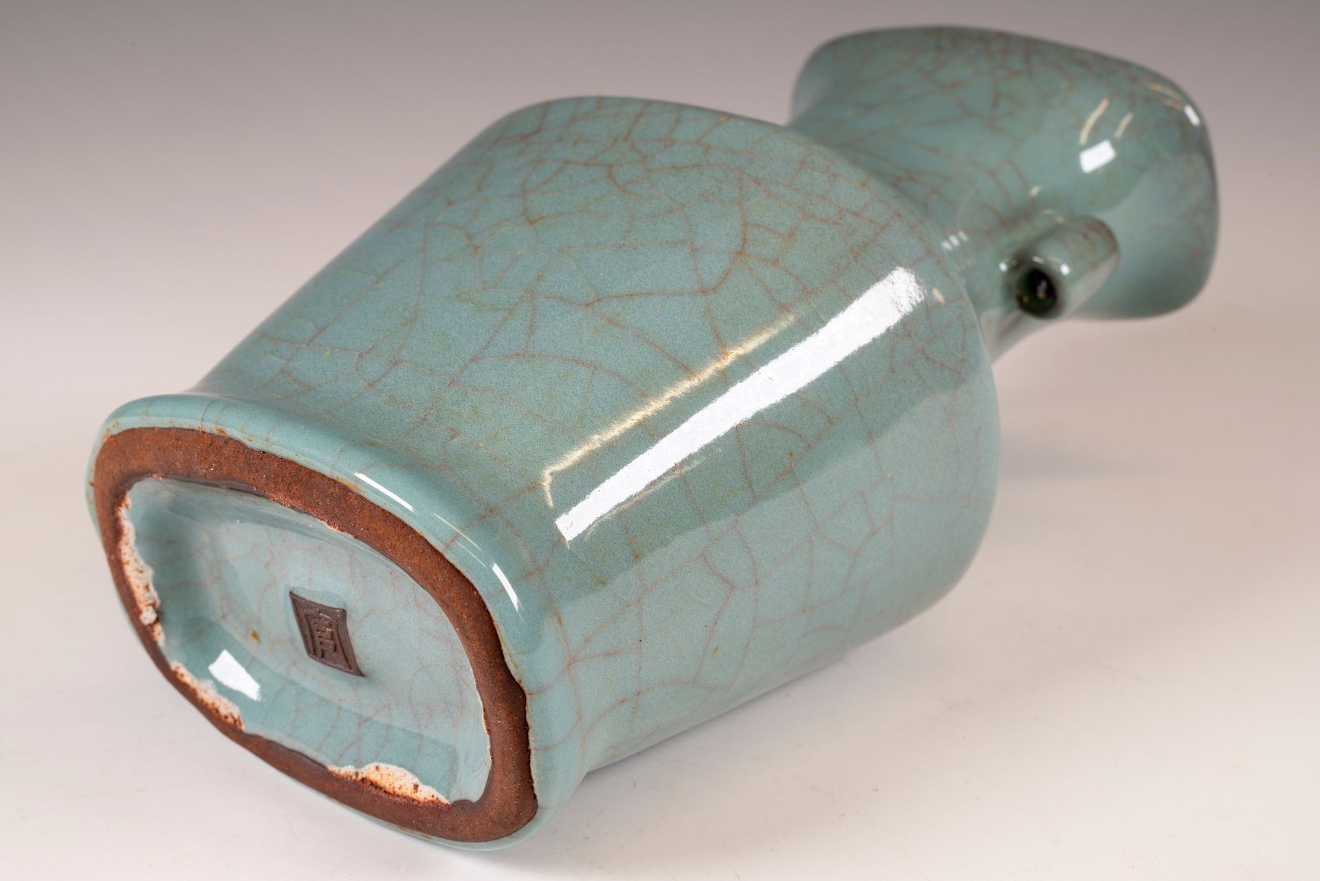 纵观世界各地著名机构的藏品,恐怕很难找到比下图所示的南宋关尧棱纹瓶更为精美绝伦的杰作。这件非凡的器物据信出自著名的秀尼寺内窑。瓶身施以厚重的浅蓝色釉,略带一丝绿意,这是通过多次施釉和烧制而成。厚实的釉层在口沿处明显变薄,露出下方深赭棕色的素烧胎体,表面还带有细腻的龟裂纹。瓶身造型匀称,展现了陶艺大师精湛的技艺。此类器物的特点是胎体精细,明显薄于釉层。此外,瓶底醒目地刻有官方款识,证实了其真品身份。金军入侵后,北宋朝廷于公元1127年迁都杭州,南宋王朝由此建立。