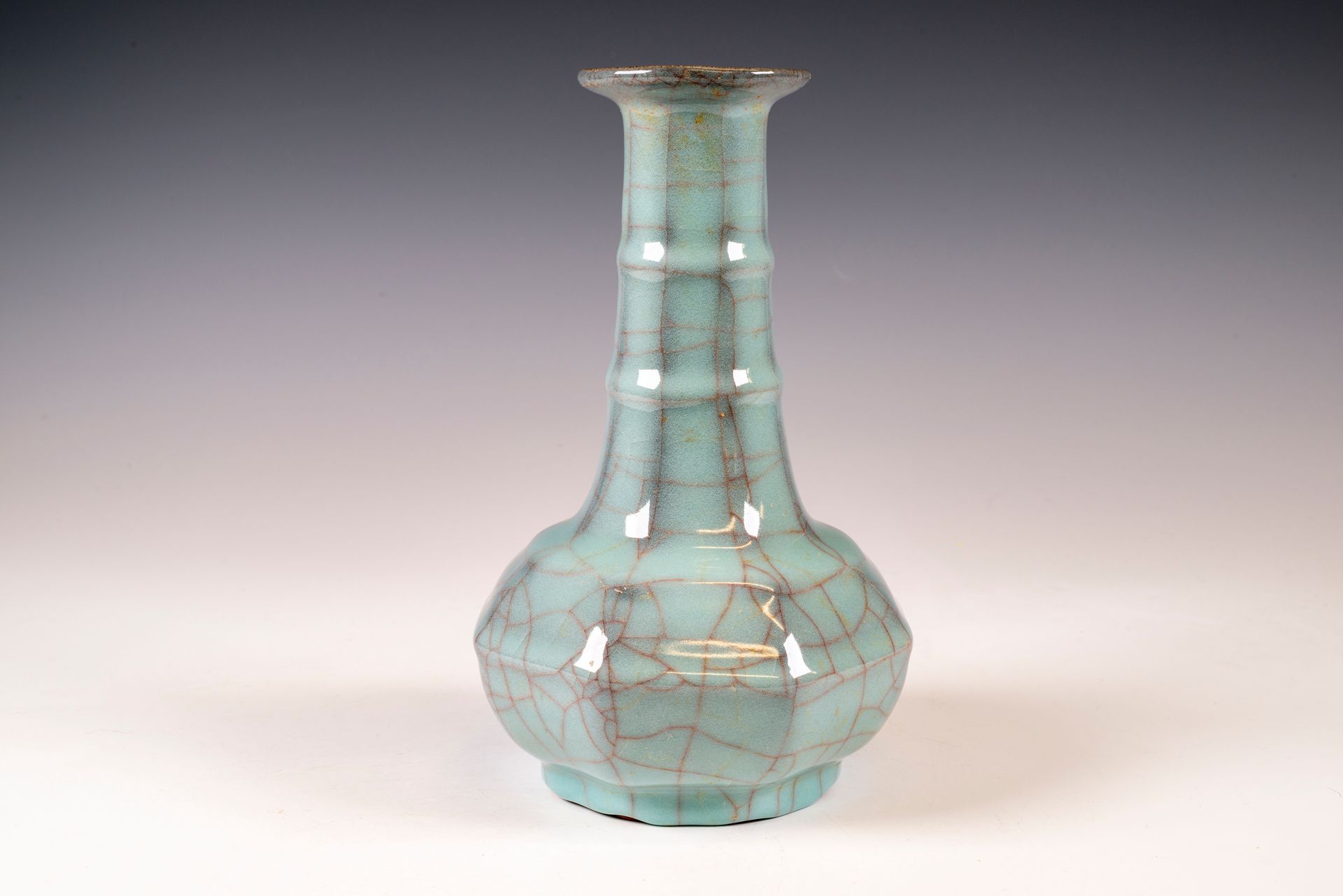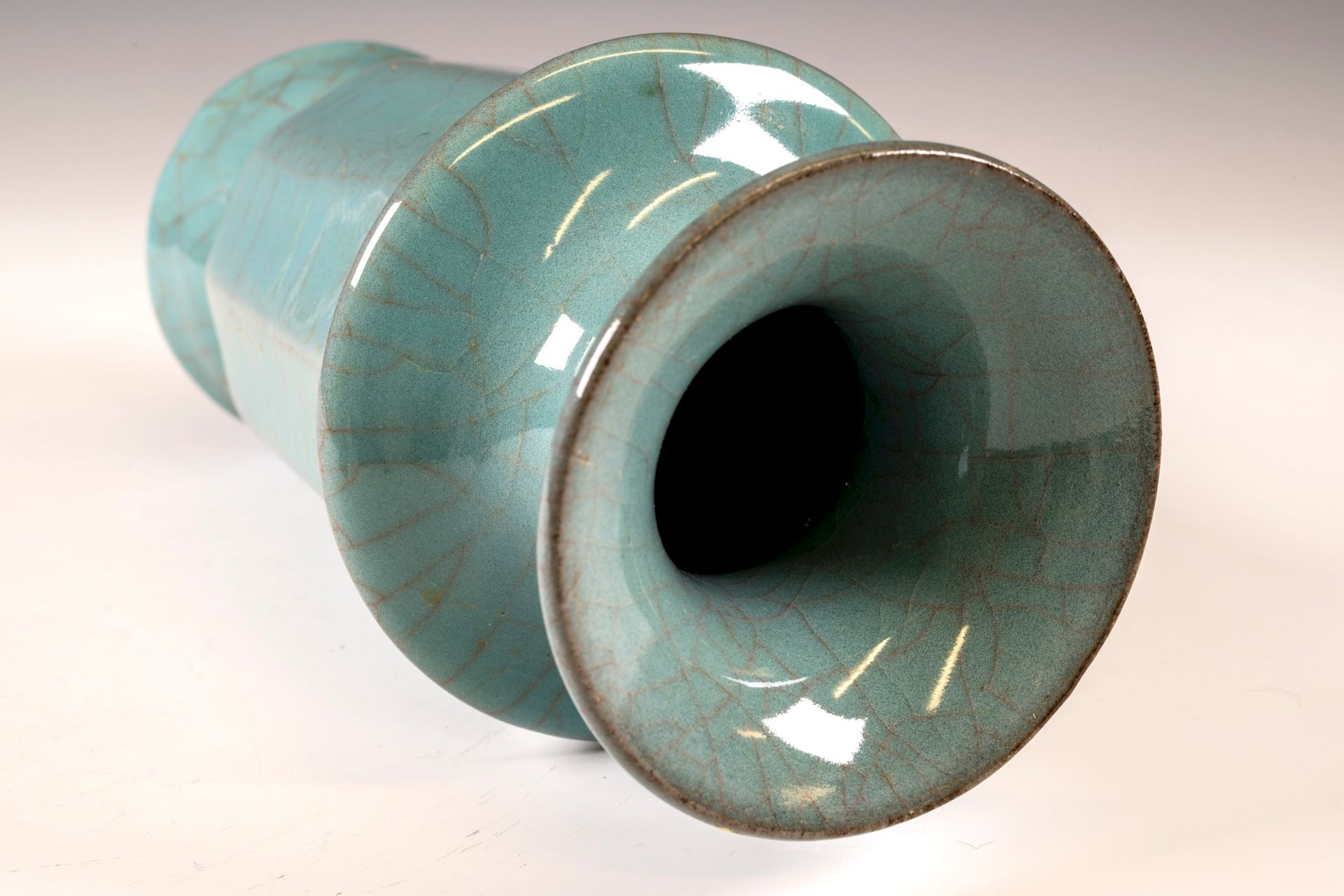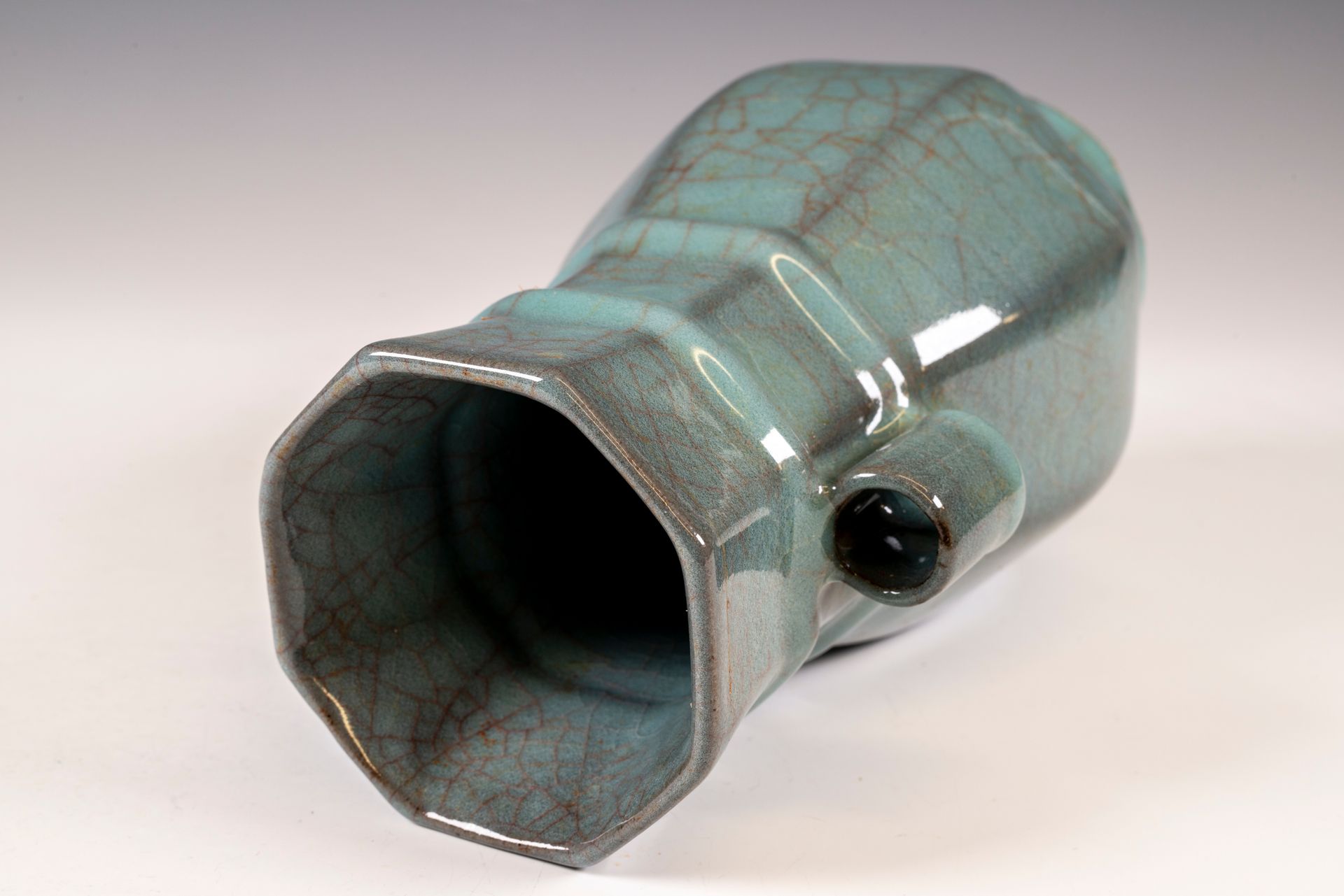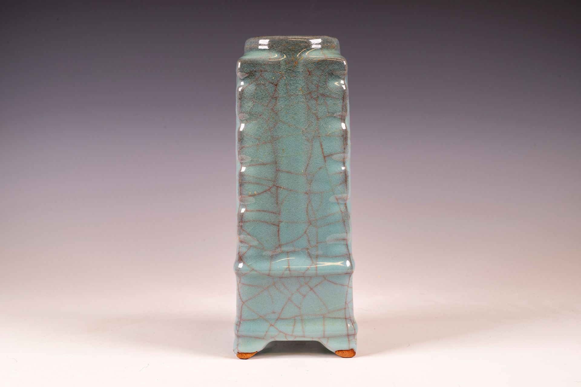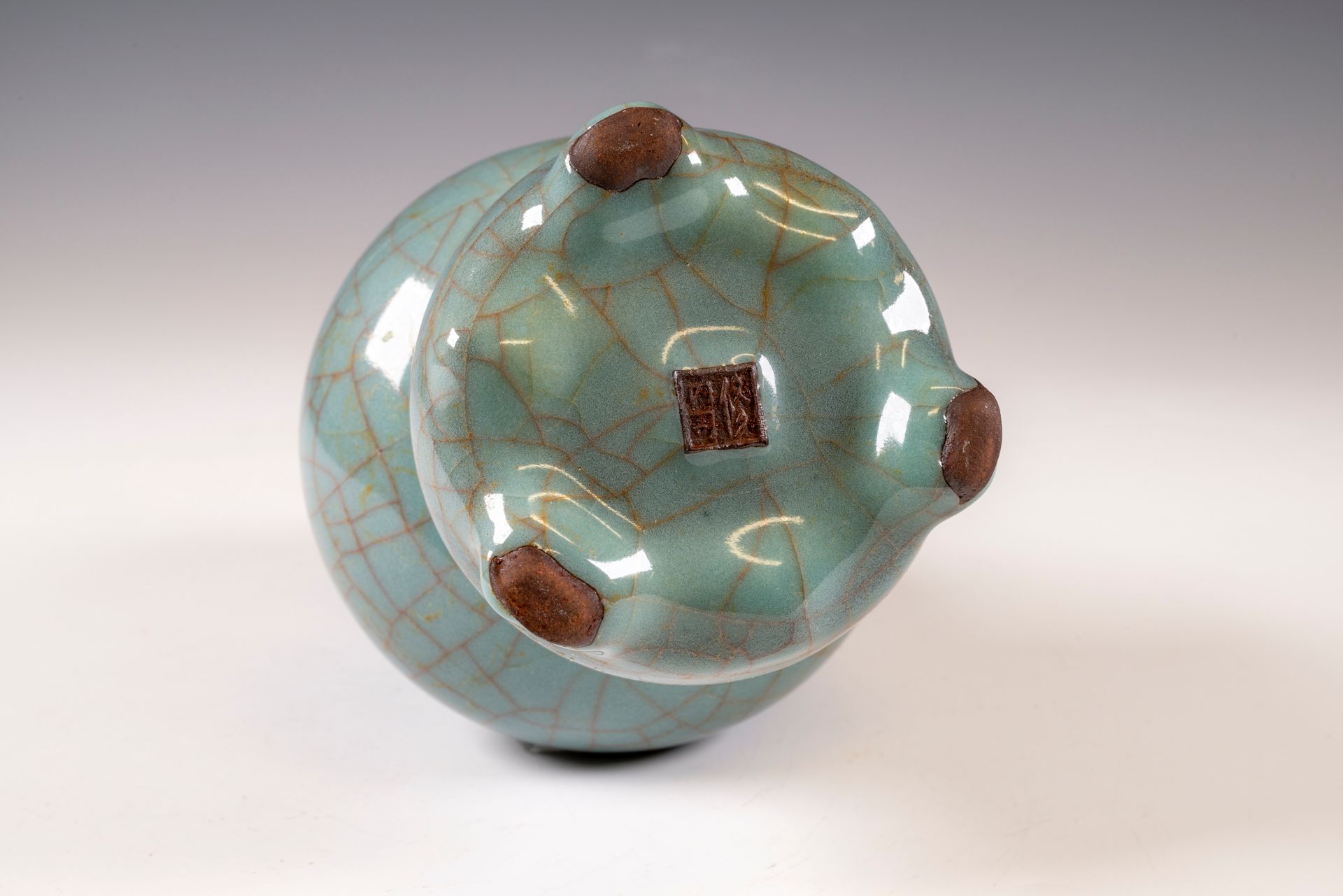 纵观世界各地著名机构的藏品,恐怕很难找到比下图所示的南宋关尧棱纹瓶更为精美绝伦的杰作。这件非凡的器物据信出自著名的秀尼寺内窑。瓶身施以厚重的浅蓝色釉,略带一丝绿意,这是通过多次施釉和烧制而成。厚实的釉层在口沿处明显变薄,露出下方深赭棕色的素烧胎体,表面还带有细腻的龟裂纹。瓶身造型匀称,展现了陶艺大师精湛的技艺。此类器物的特点是胎体精细,明显薄于釉层。此外,瓶底醒目地刻有官方款识,证实了其真品身份。金军入侵后,北宋朝廷于公元1127年迁都杭州,南宋王朝由此建立。