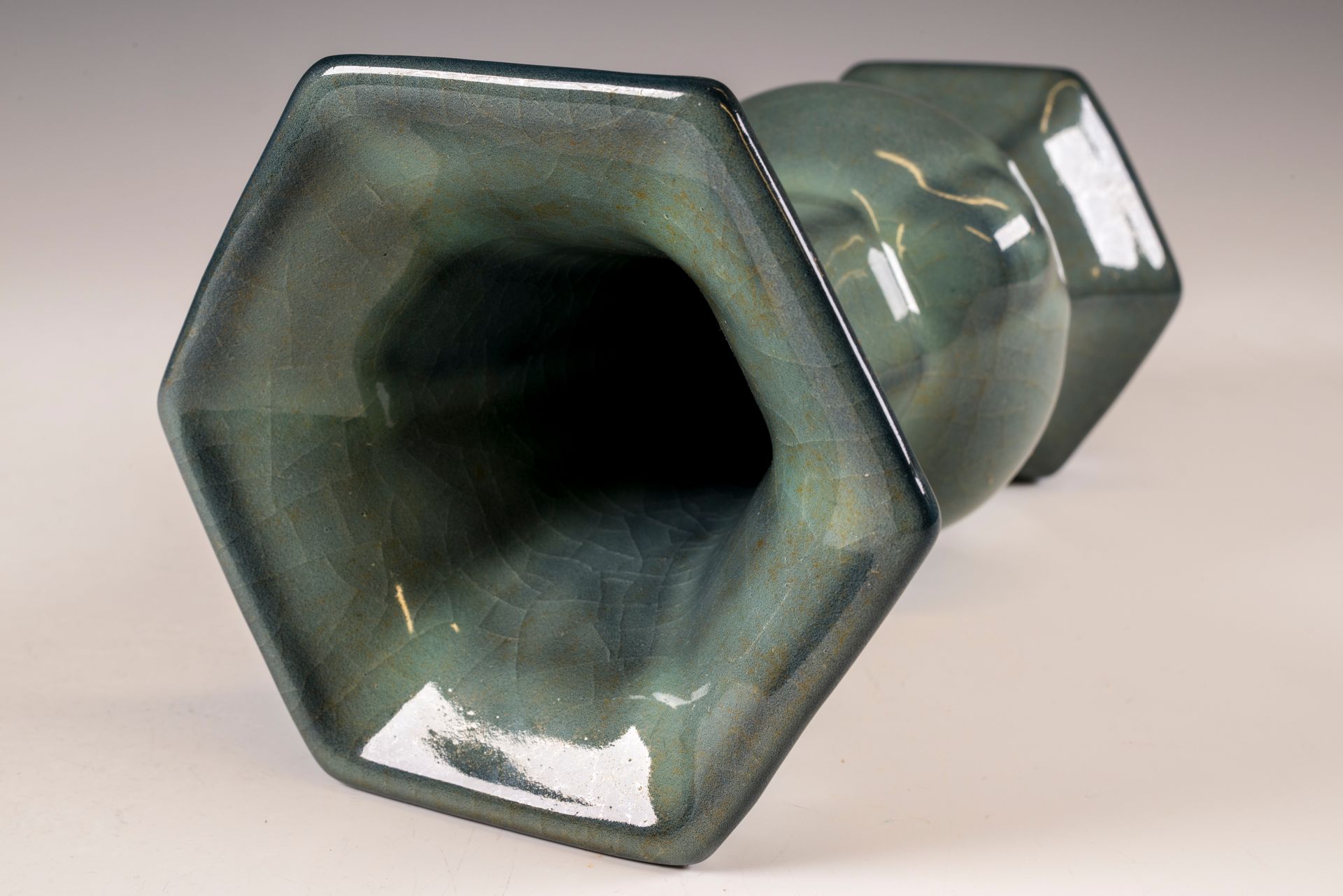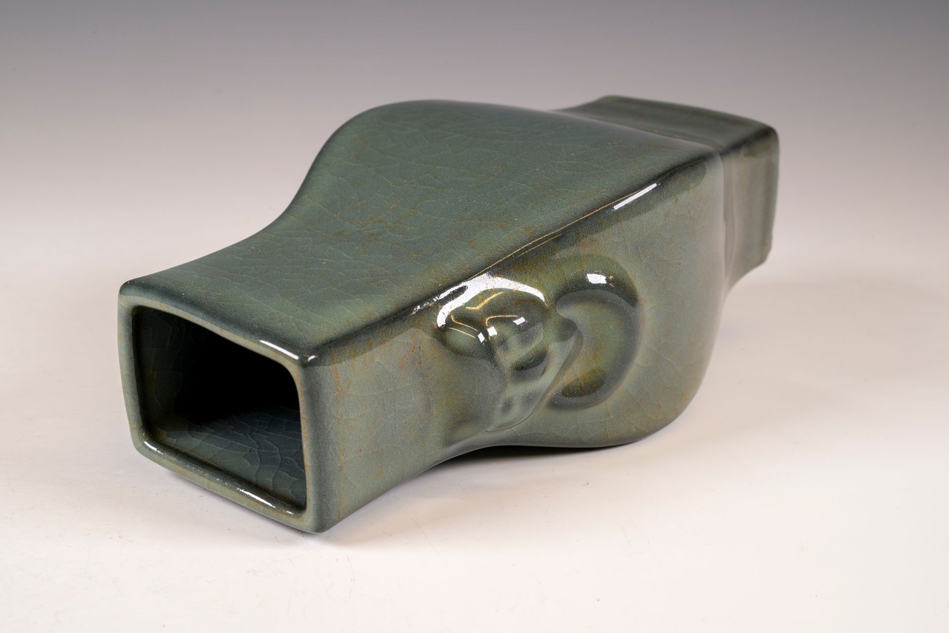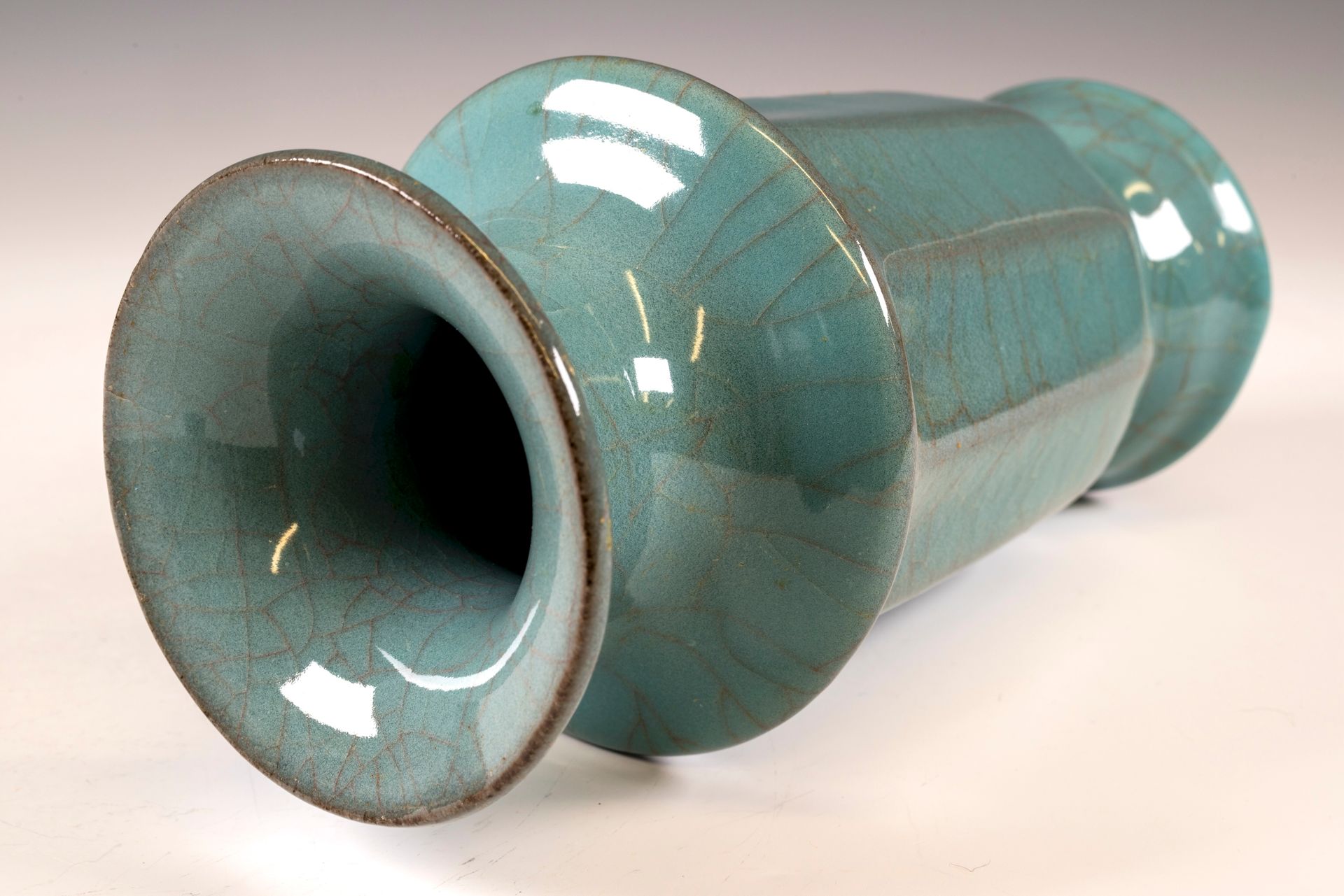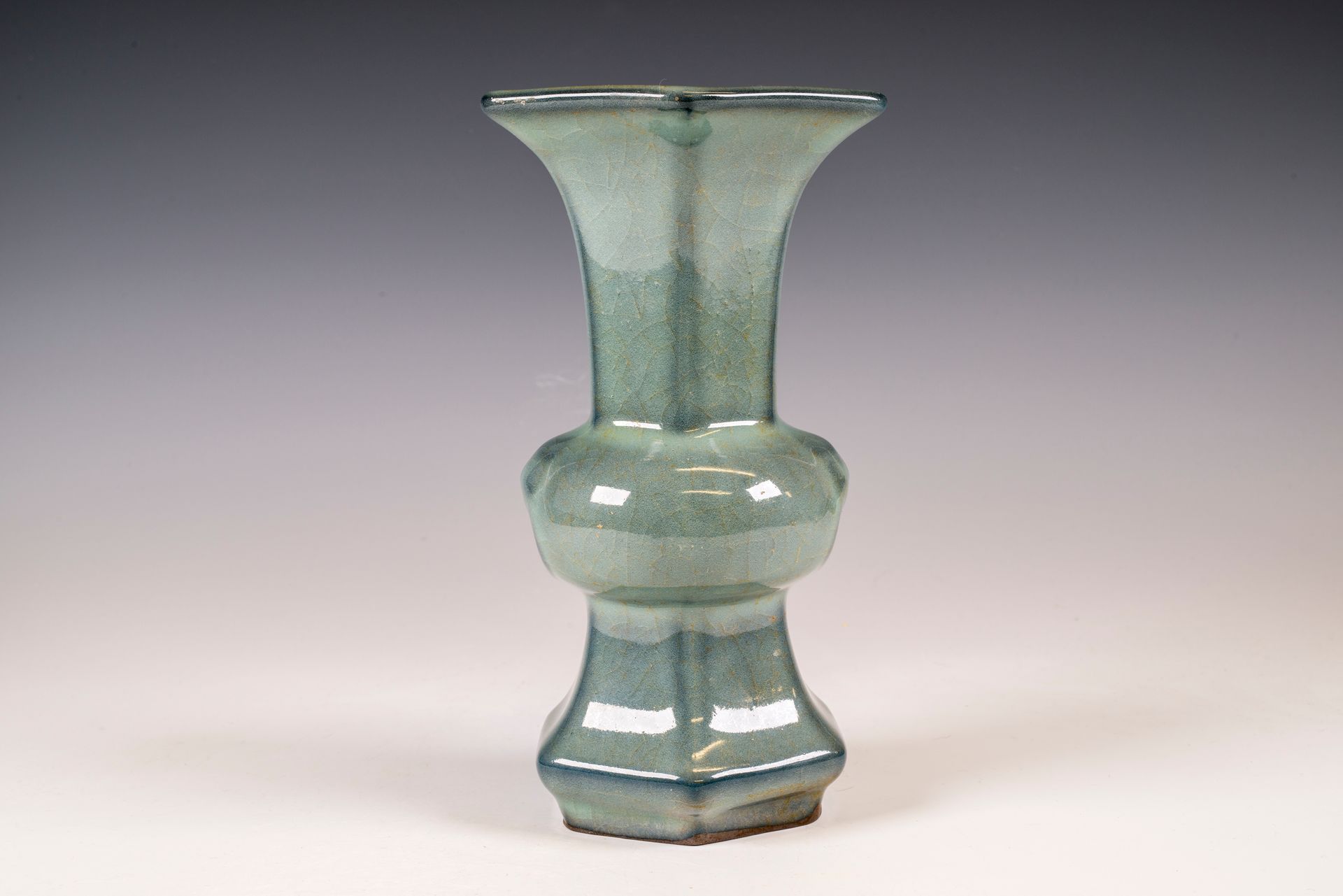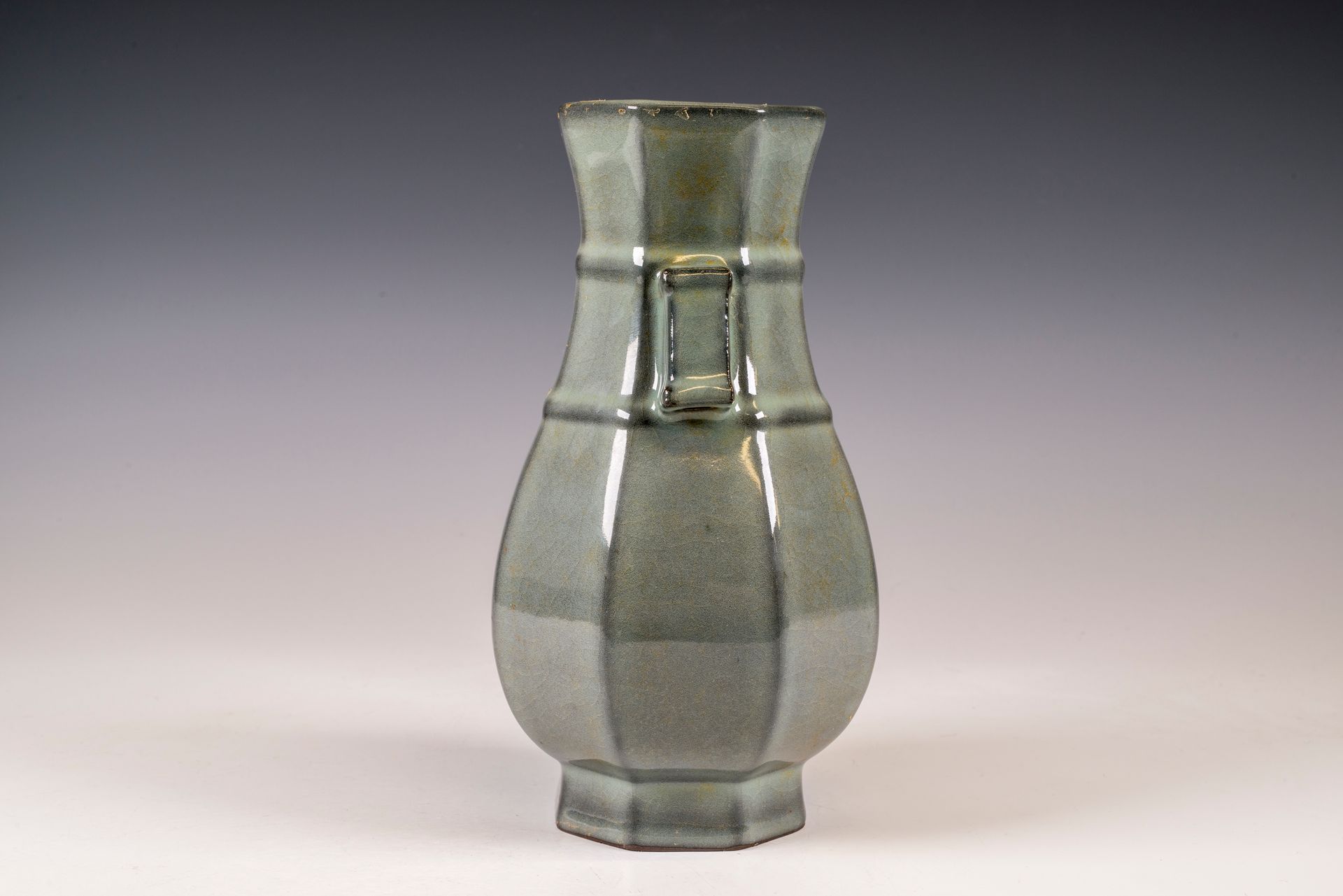 纵观世界各地著名机构的藏品,恐怕很难找到比下图所示的南宋关尧棱纹瓶更为精美绝伦的杰作。这件非凡的器物据信出自著名的秀尼寺内窑。瓶身施以厚重的浅蓝色釉,略带一丝绿意,这是通过多次施釉和烧制而成。厚实的釉层在口沿处明显变薄,露出下方深赭棕色的素烧胎体,表面还带有细腻的龟裂纹。瓶身造型匀称,展现了陶艺大师精湛的技艺。此类器物的特点是胎体精细,明显薄于釉层。此外,瓶底醒目地刻有官方款识,证实了其真品身份。金军入侵后,北宋朝廷于公元1127年迁都杭州,南宋王朝由此建立。