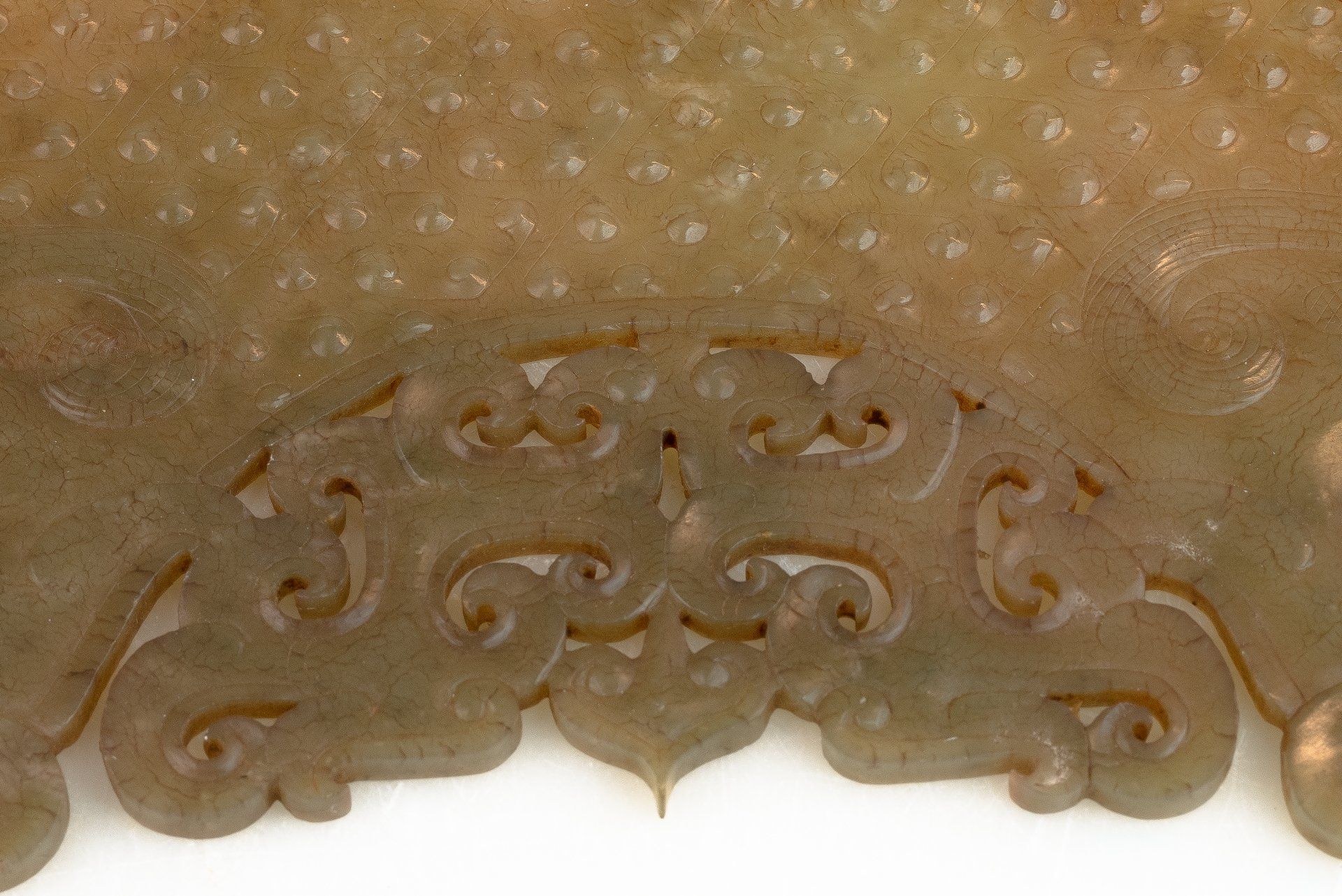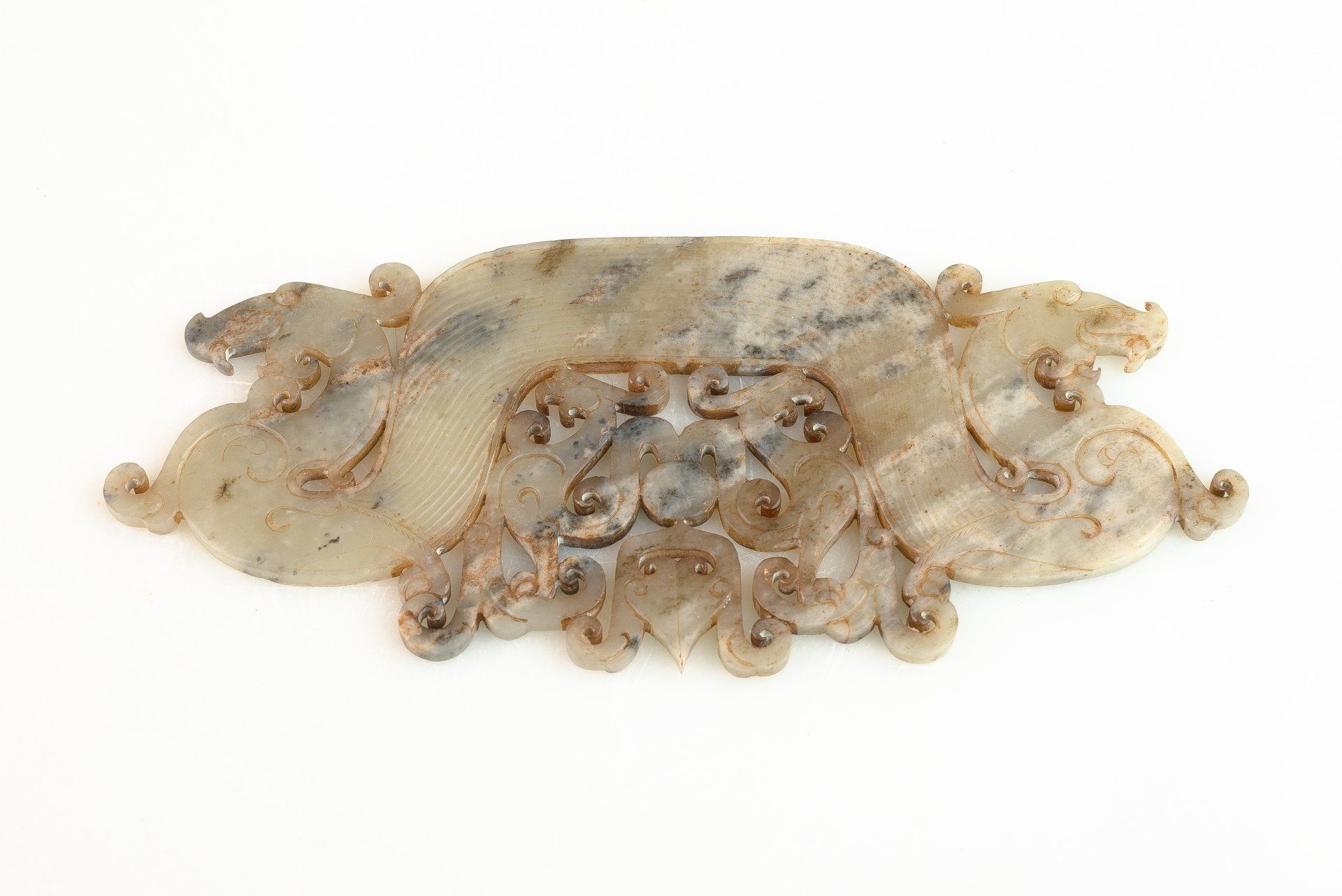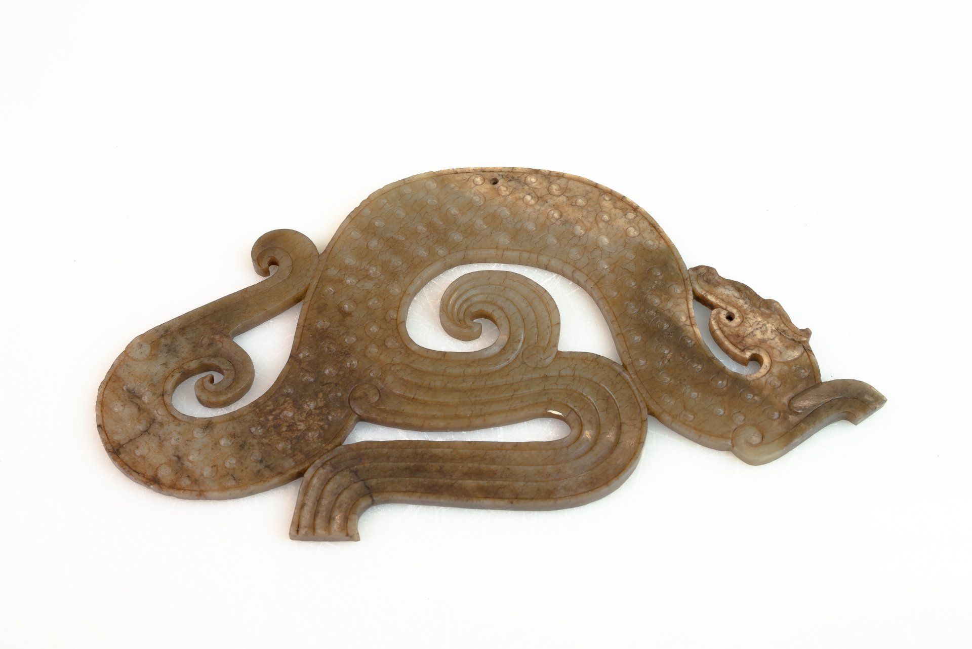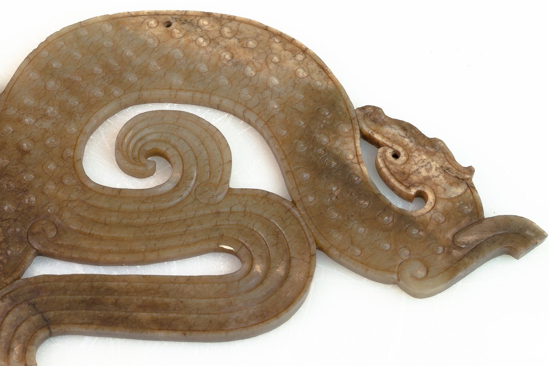 这件精美的玉双龙黄吊坠,出自东周战国时期,堪称当时艺术造诣的典范。吊坠呈弧形,饰以双龙头,并精雕细琢,纹理交错于镂空云纹之上。材质为半透明的青玉,其中夹杂着棕褐色内含物,使整件作品呈现出浓郁的棕褐色调。其精湛的雕刻工艺令人叹为观止,足以证明其为一件真正的东周时期作品。吊坠上细致入微的线条仿佛是经过精心雕琢而成,这种技法在东周时期的玉器中极为罕见,仅在最精美的玉器上才能见到。由于细节精妙绝伦,观赏者必须借助珠宝放大镜才能充分领略其精妙之处。工匠们究竟是如何达到如此精细的技艺,至今仍是一个谜。有理论认为,玉雕可能使用了类似刀具的金刚石尖端工具。玉的硬度堪比钢铁,因此,在不损坏这种体积较大、质地脆弱的宝石的情况下,从玉上取下细小的碎片是一项惊人的技艺。这一谜团一直困扰着研究玉雕的学者,尤其是在中国其他历史时期未发现类似技法的情况下。这件黄氏玉佩可追溯至战国时期(公元前476年—公元前221年),长约9又1/8英寸,顶端有一个用于悬挂的小圆锥形孔。