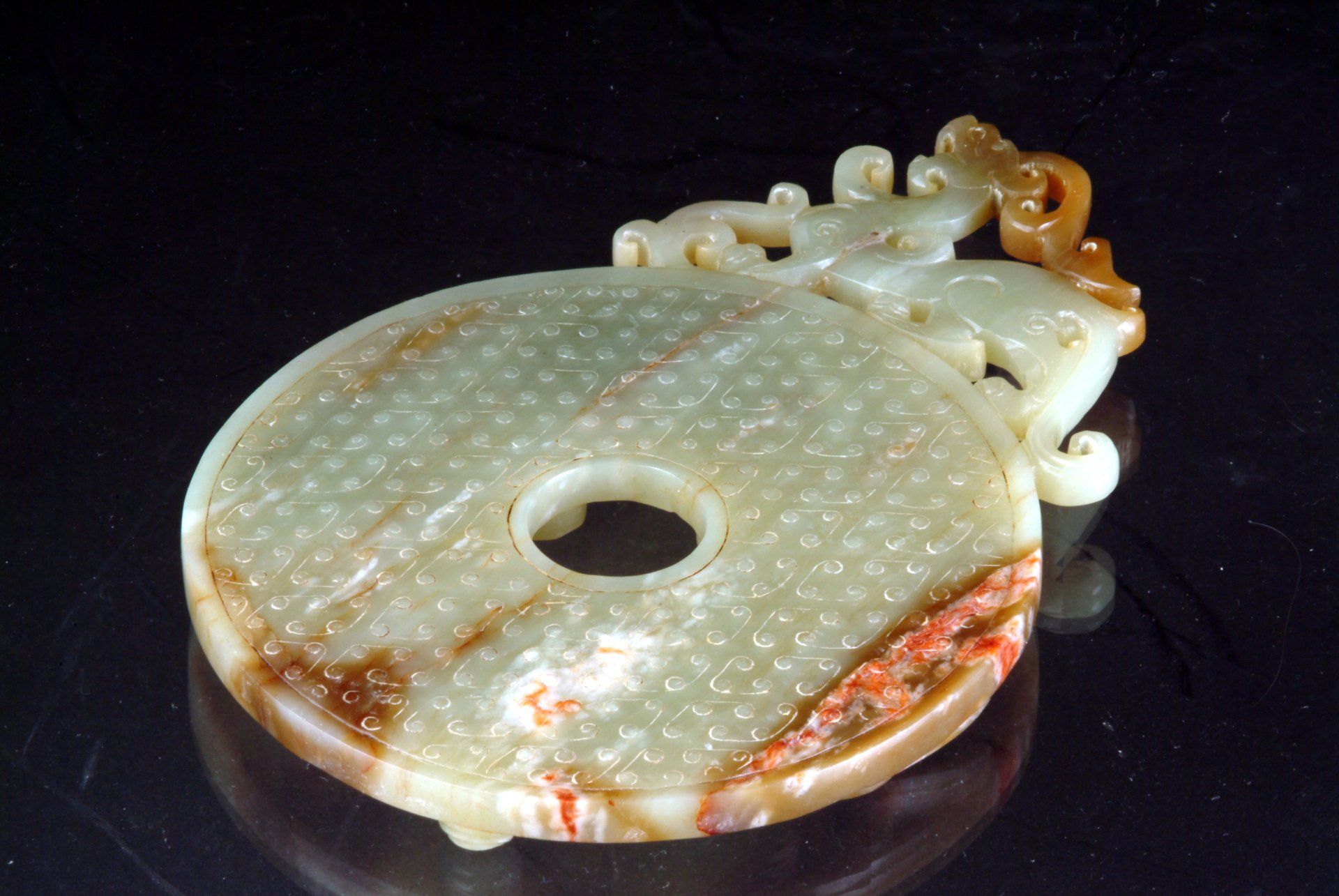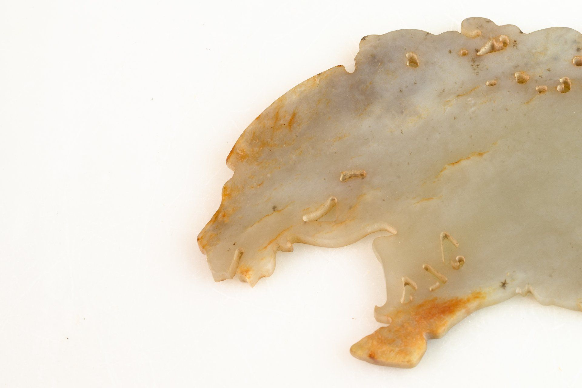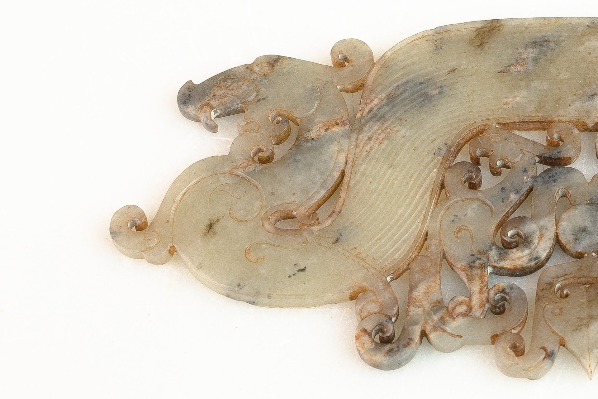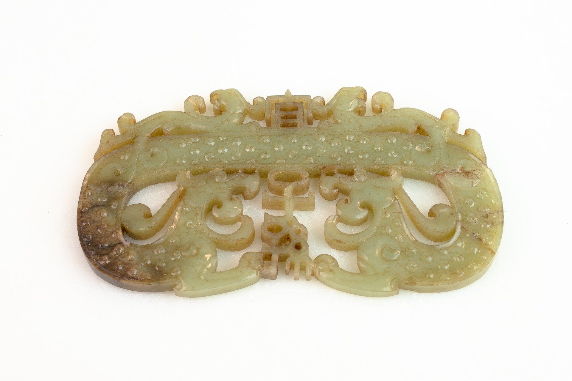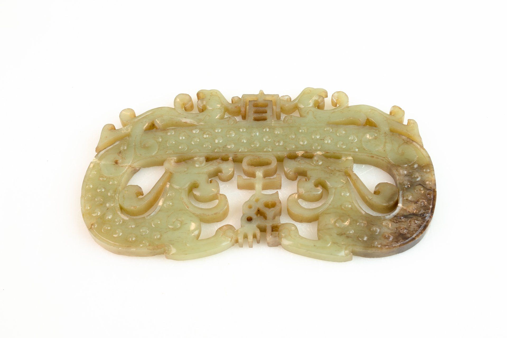 这件精美的玉双龙黄吊坠,出自东周战国时期,堪称当时艺术造诣的典范。吊坠呈弧形,饰以双龙头,并精雕细琢,纹理交错于镂空云纹之上。材质为半透明的青玉,其中夹杂着棕褐色内含物,使整件作品呈现出浓郁的棕褐色调。其精湛的雕刻工艺令人叹为观止,足以证明其为一件真正的东周时期作品。吊坠上细致入微的线条仿佛是经过精心雕琢而成,这种技法在东周时期的玉器中极为罕见,仅在最精美的玉器上才能见到。由于细节精妙绝伦,观赏者必须借助珠宝放大镜才能充分领略其精妙之处。工匠们究竟是如何达到如此精细的技艺,至今仍是一个谜。有理论认为,玉雕可能使用了类似刀具的金刚石尖端工具。玉的硬度堪比钢铁,因此,在不损坏这种体积较大、质地脆弱的宝石的情况下,从玉上取下细小的碎片是一项惊人的技艺。这一谜团一直困扰着研究玉雕的学者,尤其是在中国其他历史时期未发现类似技法的情况下。这件黄氏玉佩可追溯至战国时期(公元前476年—公元前221年),长约9又1/8英寸,顶端有一个用于悬挂的小圆锥形孔。