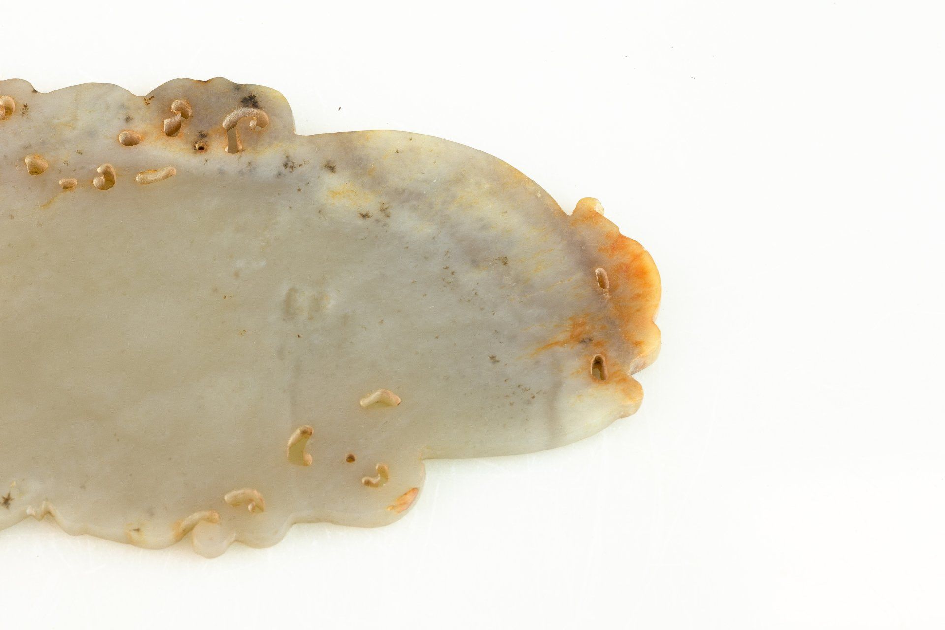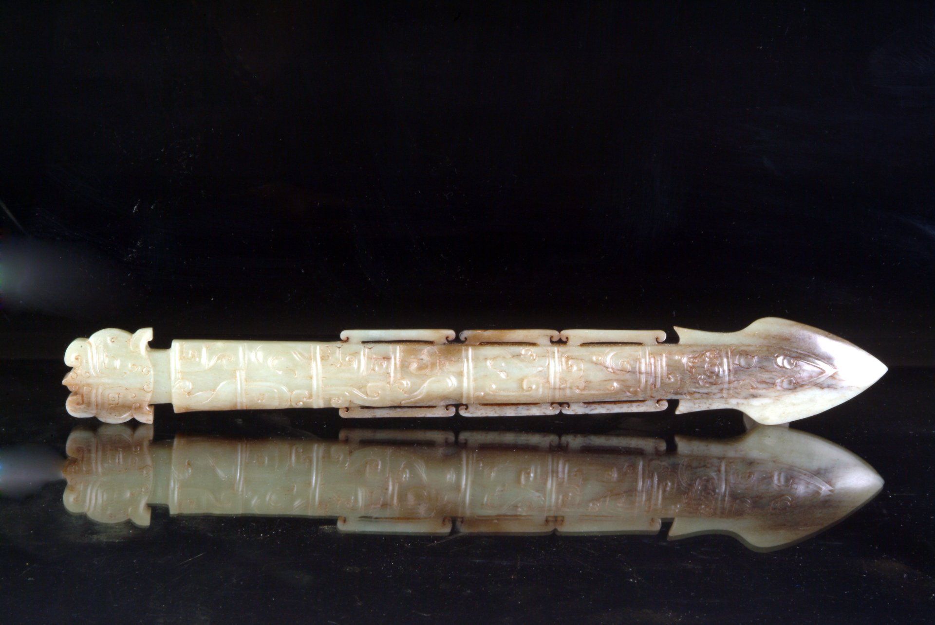 这件出土于战国时期东周的精美玉器,堪称工艺精湛的典范。这件玉坠名为“黄”,造型优美,呈弧形,两侧各雕刻着一个精雕细琢的龙头,饰以纹理丰富的云纹。玉质为半透明的青玉,内部含有大量内含物,使其呈现出棕褐色调,并有局部钙化痕迹。雕刻技艺精湛,无可挑剔,无疑是这一时期的真品。细腻的线条仿佛经过精心雕琢,分块雕刻而成——这种精湛的技艺仅在东周最精美的玉器中才能见到。如此精细的工艺,需要借助放大镜才能仔细观察。这件玉器所用工具的具体情况至今仍是个谜,引发了人们的诸多猜测。有人推测,制作者使用了类似刀具的金刚石尖端工具。鉴于玉石的硬度堪比钢铁,如何在不造成崩裂、开裂或断裂的情况下雕刻出如此精细的细节,一直是玉雕研究学者们津津乐道的难题。值得注意的是,这种精湛的工艺在中国历史的其他时期都未曾出现过。这件黄玉,制作于战国时期(约公元前476年至公元前221年),长约9.25英寸,底部有一个用于悬挂的小圆锥形孔。