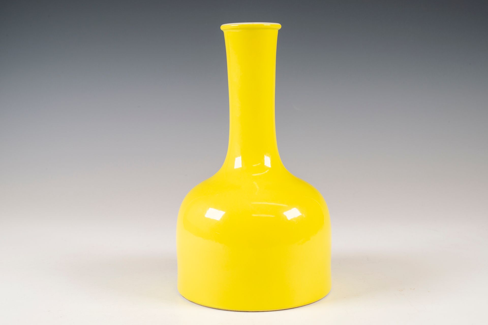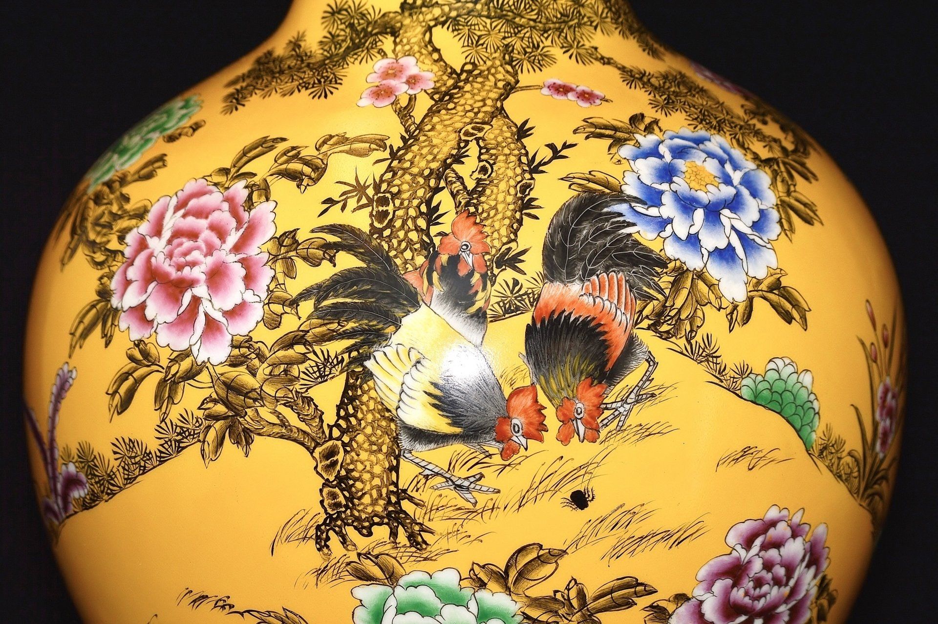 这件清代乾隆款鸡纹瓶呈卵圆形,以醒目的黄地为特色。瓶身绘有栩栩如生的三只公鸡、蝴蝶、飞鸟以及各种色彩缤纷的花卉。瓶底镌刻有优美的诗句及三个款识。整件作品以流畅的笔触为主,部分区域则以精湛的笔法展现细腻的刻画。收藏家需要仔细鉴赏这件作品,尤其要注意细节、色彩平衡和明暗处理,这些都有助于展现其整体的层次感和和谐感。了解普通瓷器与精品或杰作之间的区别,是瓷器收藏艺术的关键所在。仔细观察清代瓷器,常常会发现艺术水平的差异,有些作品可能由于缺乏平衡和细节而显得平淡,这表明作者的技艺略逊一筹。乾隆款识位于画面中央,这是乾隆御制瓷器的典型特征。乾隆时期被誉为中国瓷器生产的鼎盛时期。这件椭圆形花瓶工艺精湛,虽有岁月痕迹,包括素烧胎剥落,更印证了其年代久远。花瓶高约17.5英寸。