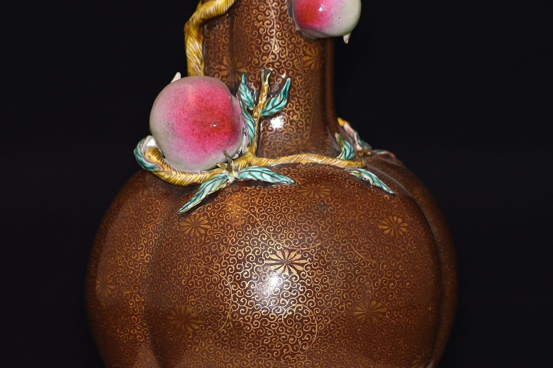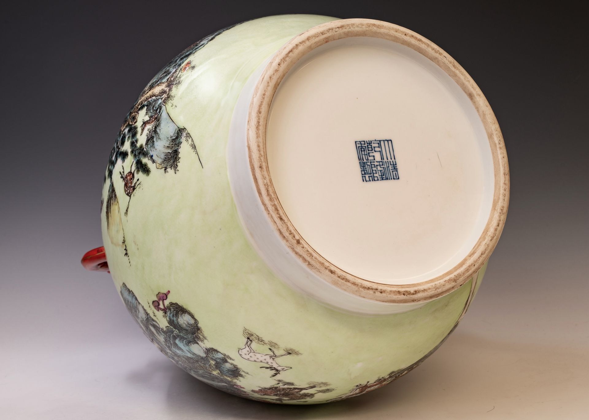 我们荣幸地向您呈献一件极为罕见且精美绝伦的清代粉彩壶,其制作工艺精湛,具体而言,出自乾隆年间,壶底青花六字款识可追溯至1736年至1795年。此件珍品饰以连贯的纹饰,描绘了一群鹿在精心描绘的自然山水间悠然漫步的景象。笔触细腻,色彩运用精妙,栩栩如生地刻画了岩石、树木和鹿群,展现出令人惊叹的写实性和艺术造诣。细节之处更是精雕细琢,栩栩如生的鹿毛描绘出鹿群嬉戏、休憩、玩耍的姿态,与华贵的黄绿色背景相得益彰。嶙峋的岩石地貌上点缀着姿态优美的盘根错节的松树、挂满桃子的枝头以及色彩斑斓的灵芝,更添生机盎然之美。一条河流蜿蜒流淌于群山之间,为这件作品增添了深邃的意境和灵动的动感。花瓶的把手设计成风格化的蜚龙造型,并以铁红和金色珐琅彩绘,更显其恢弘大气。通过对藏品、博物馆藏品和拍卖结果的考察,可以明显看出,这件花瓶堪称世界现存最精美的百鹿瓶之一,甚至可能是独一无二的典范之作。这件精美绝伦的花瓶高19英寸。 ppjrs
