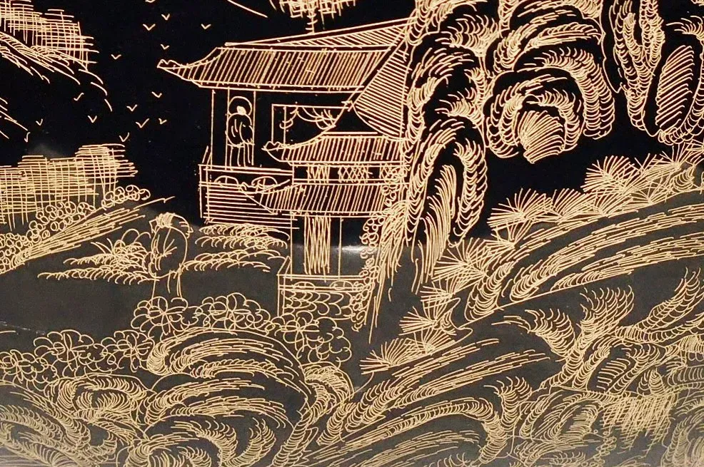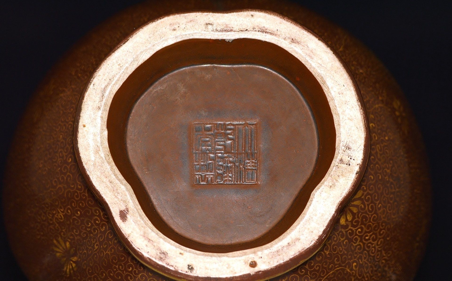 这件精美绝伦的乾隆款镜黑釉碗,年代约为1736年至1795年,碗身饰以精细的刻画,描绘了建筑与山水纹饰,并以金线点缀,更显匠心独运。此碗堪称目前市面上同类器物中的佼佼者。我们建议您查阅各类拍卖图录及参考资料,寻找与之媲美的黑釉器物;您或许难以找到任何一件能与此件杰作相媲美的作品。每一道刻线都精细入微,纤细如发丝。此碗的艺术之美难以通过照片完全展现,唯有亲眼所见,方能领略其制作所需的非凡技艺和精湛掌控。碗的造型优美,碗沿釉面自然过渡,隐约可见洁白的素烧胎。对于有志于收藏的藏家而言,更应学习如何区分品质上乘的器物与真正的艺术瑰宝。仔细观察许多清代器物,往往会发现它们出自技艺稍逊的工匠之手,导致整体构图、细节和层次感有所欠缺。而对细节、色彩平衡和明暗处理的关注,对于欣赏这些细微之处至关重要。乾隆款识与碗的正面齐平,这是乾隆时期的惯例,而乾隆时期被公认为是中国瓷器艺术的巅峰时期。此碗直径约为9又3/16英寸。