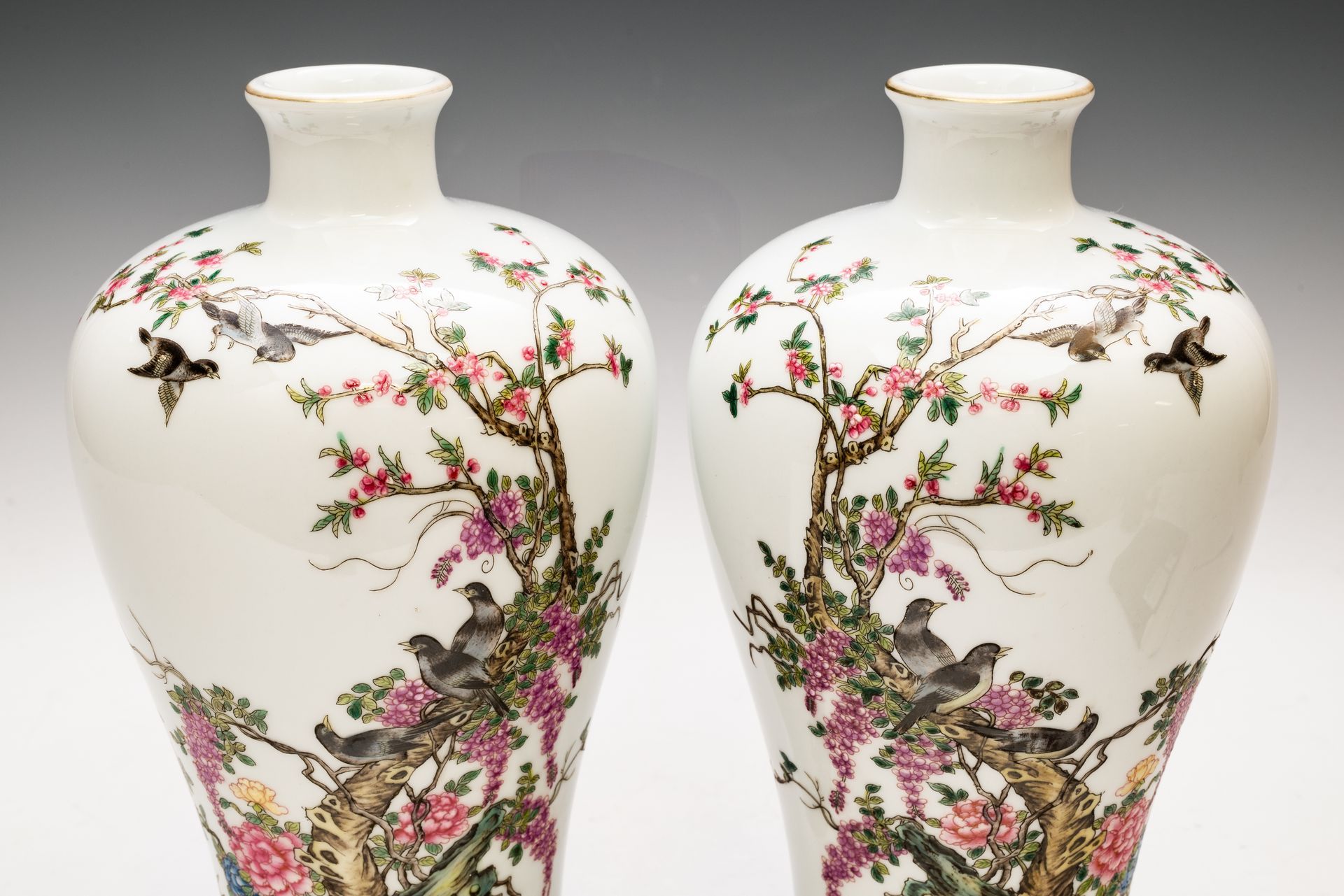 这两件精美绝伦的法兰嘎彩珐琅瓶,工艺精湛,彩绘细腻,出自雍正时期(1723年至1735年)北京紫禁城。瓶身采用法兰嘎彩技法制作,据称由皇帝亲自监督。制作这些花瓶需要极高的技艺和精准度。瓶身饰以枝繁叶茂的梅花和喜鹊,展现了雍正时期独特的色彩运用。瓶底镌刻一首诗,并钤有三枚印章。此外,瓶底还饰有雍正时期双方格“豫治”四字青花款识,表明其为北京瓷器匠人所制。值得注意的是,这两件花瓶并非完全相同,这也是雍正瓷器的典型特征。胎体剥落的痕迹进一步佐证了其年代。艺术家精湛的技艺和对作品的掌控力显而易见。这些器物的品质堪称卓越;即使仔细查阅拍卖图录、学术出版物和博物馆藏品,也未必能找到与这对雍正时期独特的法兰嘎彩瓶相媲美的作品。每只瓶高约10英寸。ppjrs