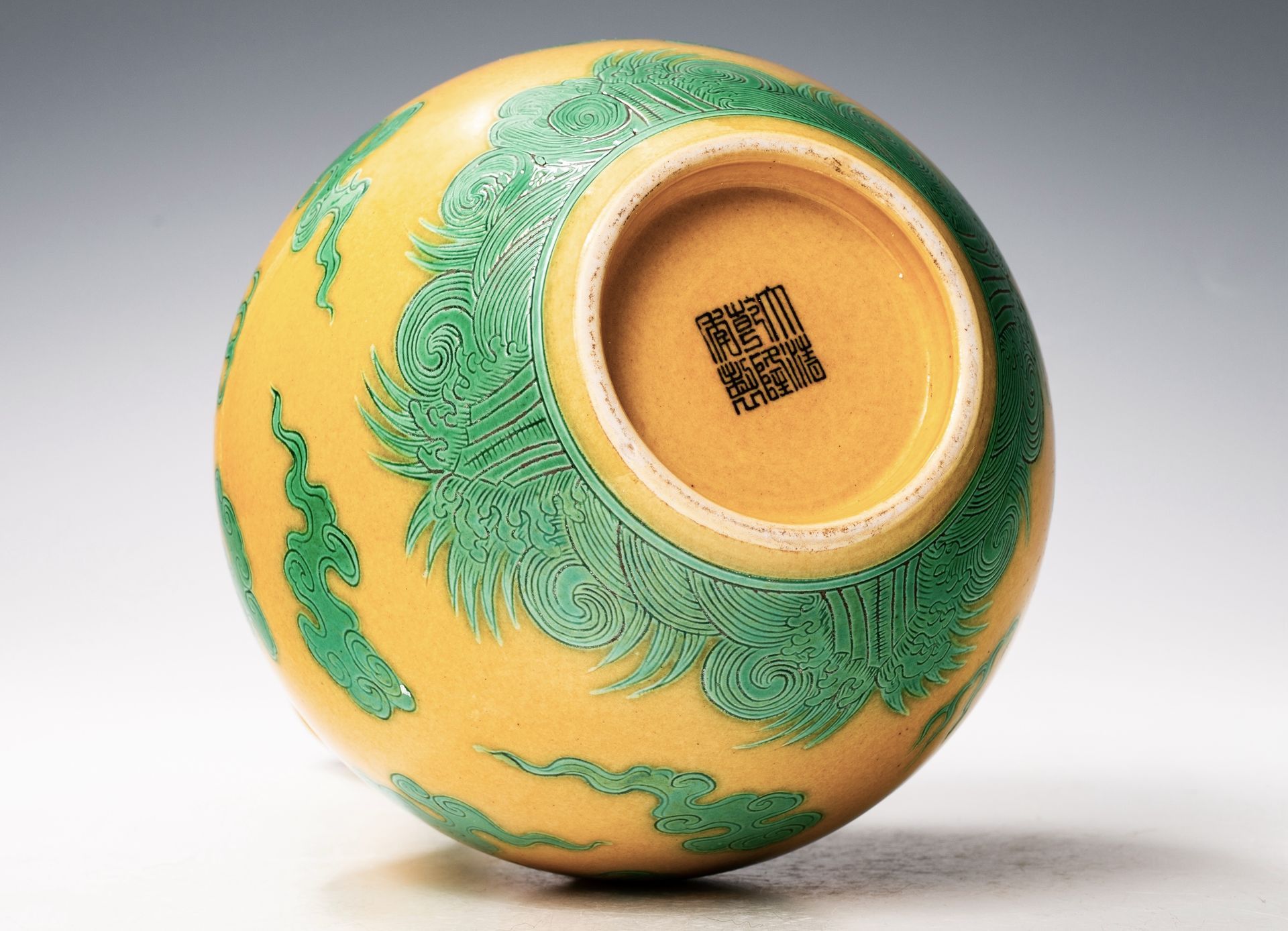 这件清代康熙珐琅彩碗造型精美,纹饰雅致。碗底以浓郁的红宝石色为地,饰以绚丽多彩的珐琅彩,包括柔和的粉色和黄色,如瀑布般倾泻而下,点缀于花卉图案之上,翠绿的色调更衬托出藤蔓和叶片的生机盎然。尤其值得一提的是,这件作品在色彩平衡和明暗处理上都展现出精湛的技艺。珐琅彩釉的典型特征是细小的釉裂纹,这件碗也具备这一特征,从素烧釉面的剥落痕迹可以看出,这进一步印证了其真实性和年代。此外,这件碗也充分展现了珐琅彩釉色泽的绝妙之美。更重要的是,碗底刻有康熙四字珐琅款“玉芝”款识,并以双方框环绕,确认了其出处。这件康熙时期的碗做工精湛,直径约 6 3/16 英寸,是任何收藏的绝佳补充。 ppjrs