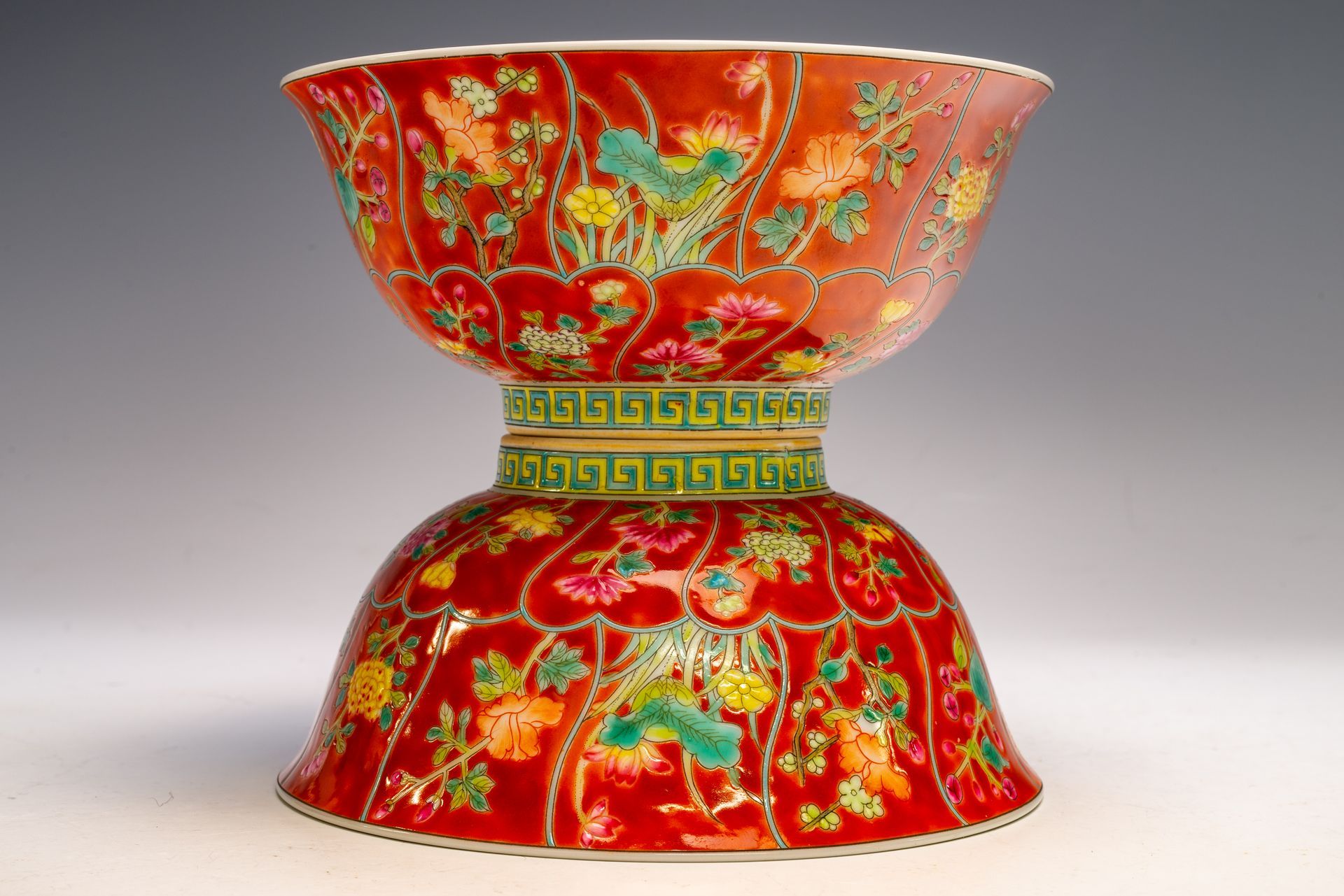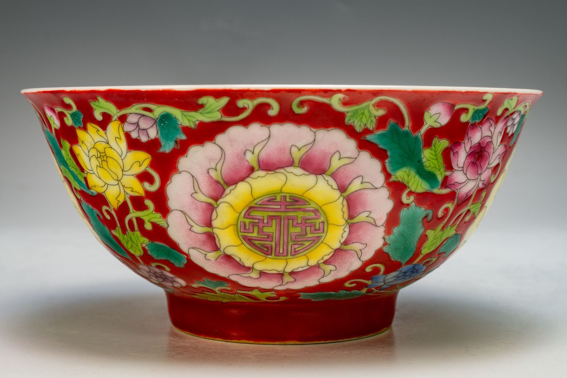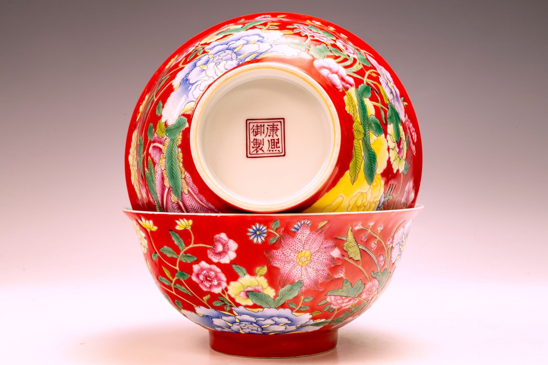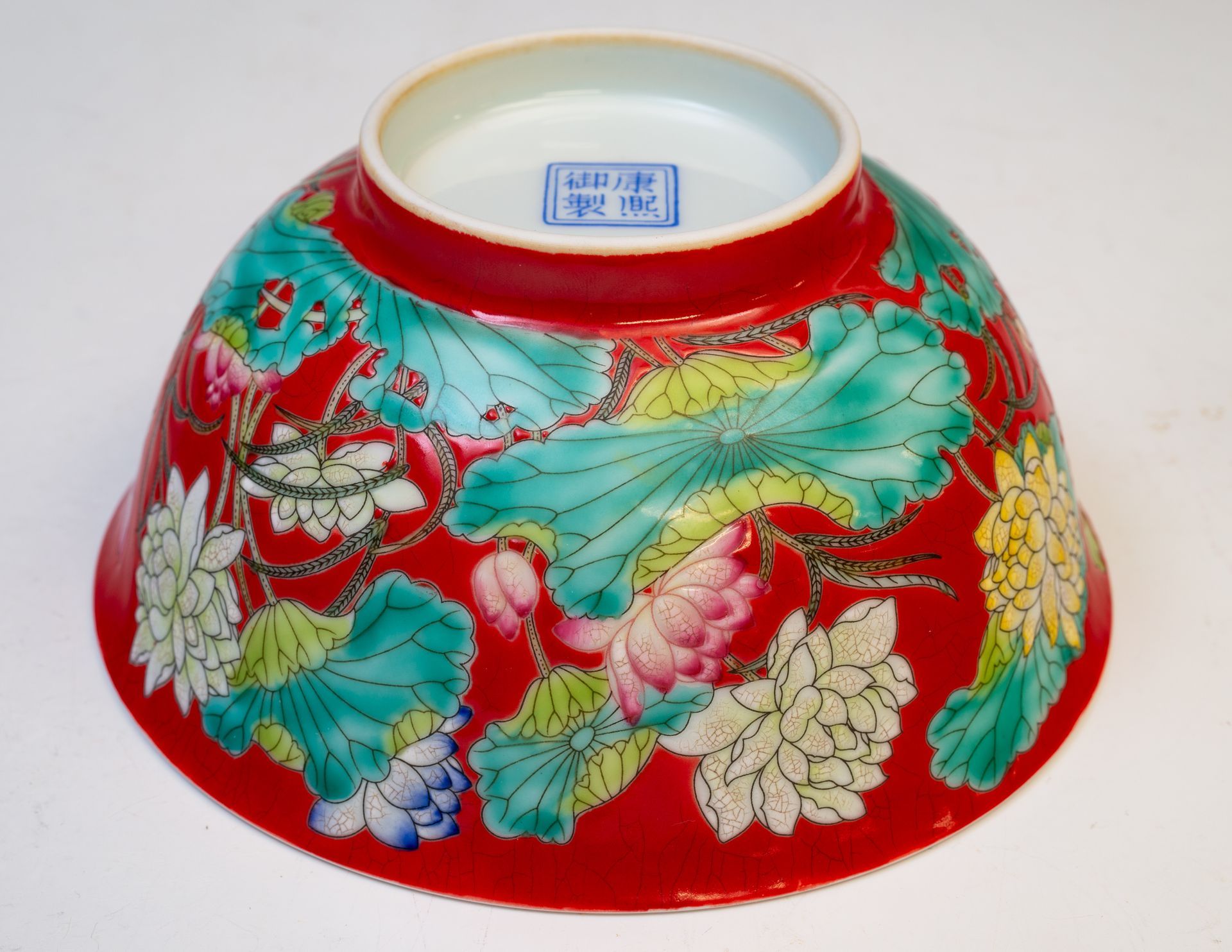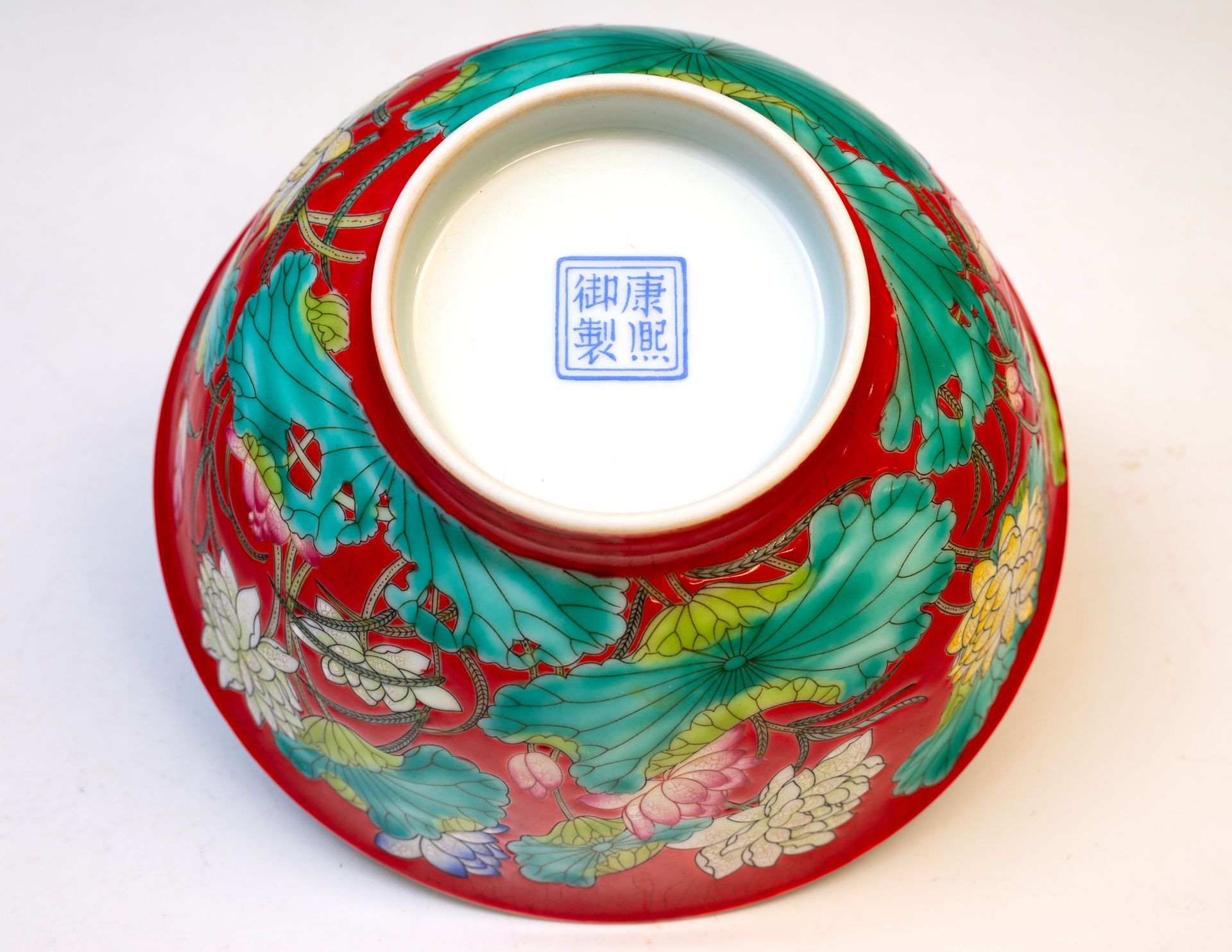 康熙年间红地法兰彩莲花碗,碗底有双方框内青花四字“玉芝款”,清代御制。
