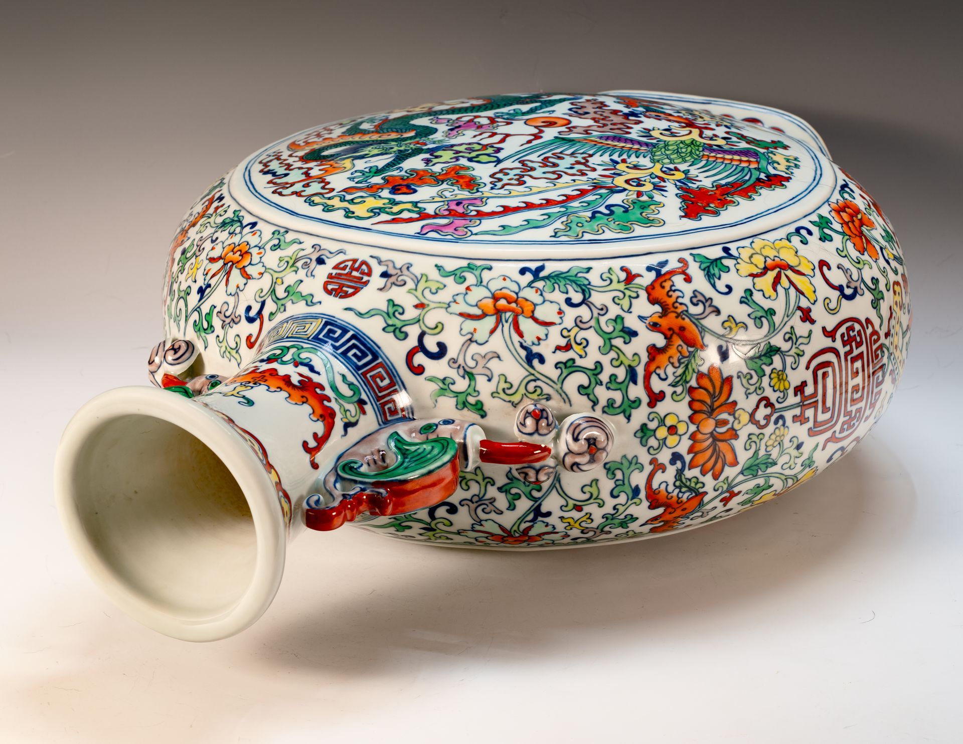 **中国古董瓷器:清乾隆款粉彩山水瓶** 我们荣幸地向您呈现一件极为罕见且精美绝伦的乾隆款粉彩山水瓶(1736-1795年)。此瓶器型为壶形,饰以伊斯兰瓷砖艺术风格的纹样,这种风格在乾隆时期的部分瓷器中有所体现。瓶身彩绘精美,工艺精湛,饰有两幅细致入微的山水画,描绘了宁静祥和的山谷。每幅画均以双凤凰图案环绕,更添美感。款识巧妙地与主画对齐,符合乾隆御瓷的典型特征。乾隆时期被誉为中国瓷器生产的巅峰时期,具有重要的历史和艺术价值,而这件瓶身正是这一时期瓷器艺术的典范之作。瓶高约27厘米。如果您对这件杰出的作品有任何疑问,请随时与我们联系。