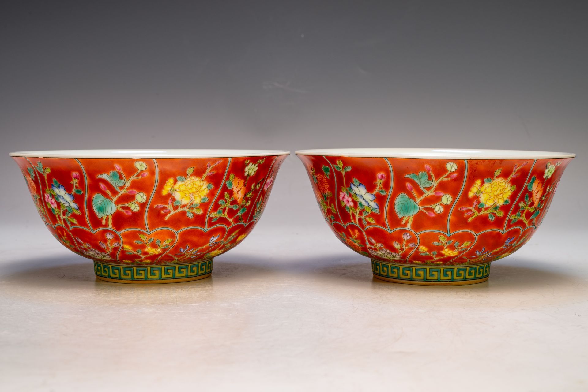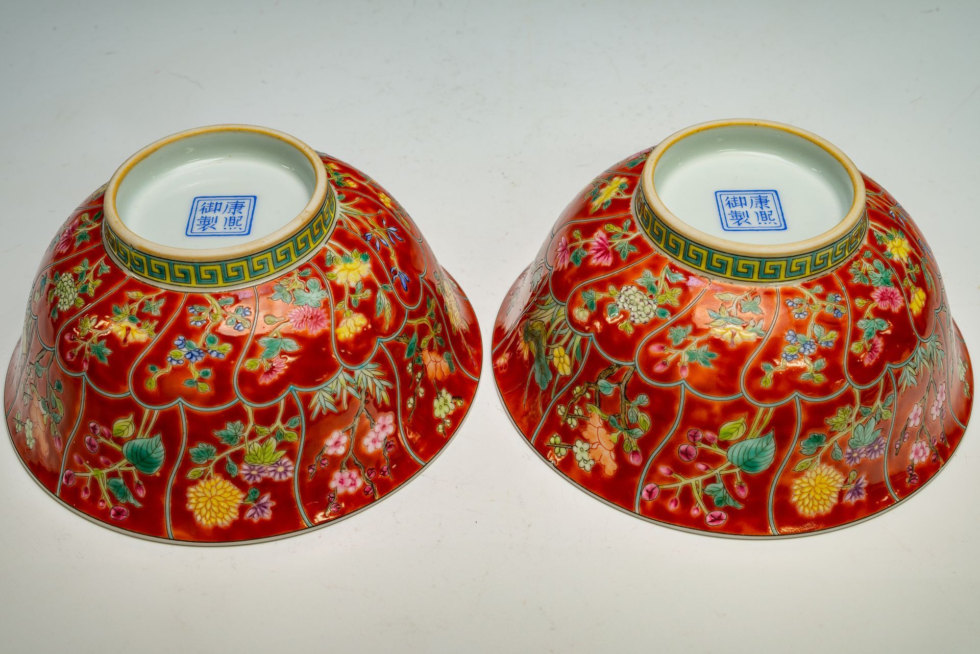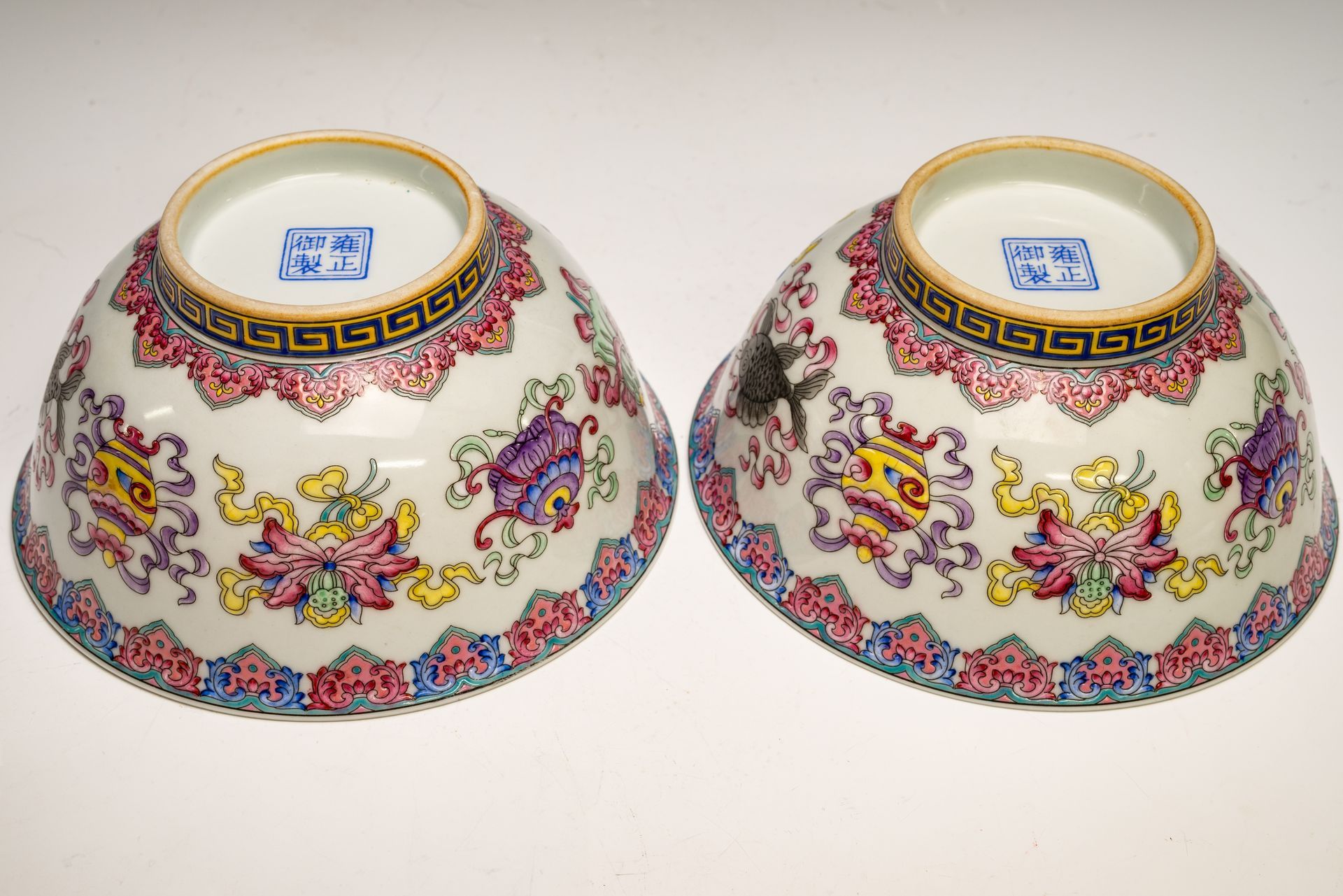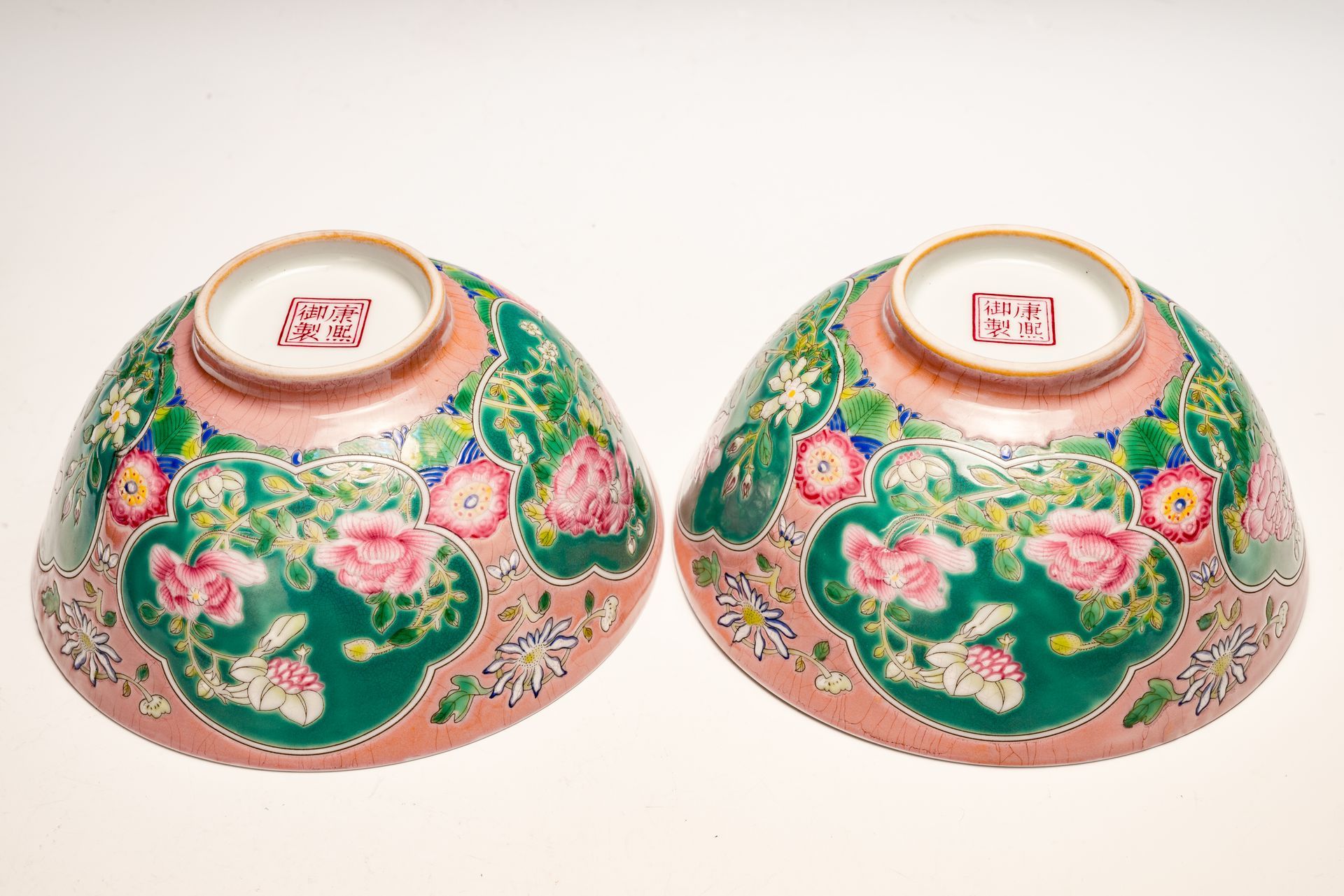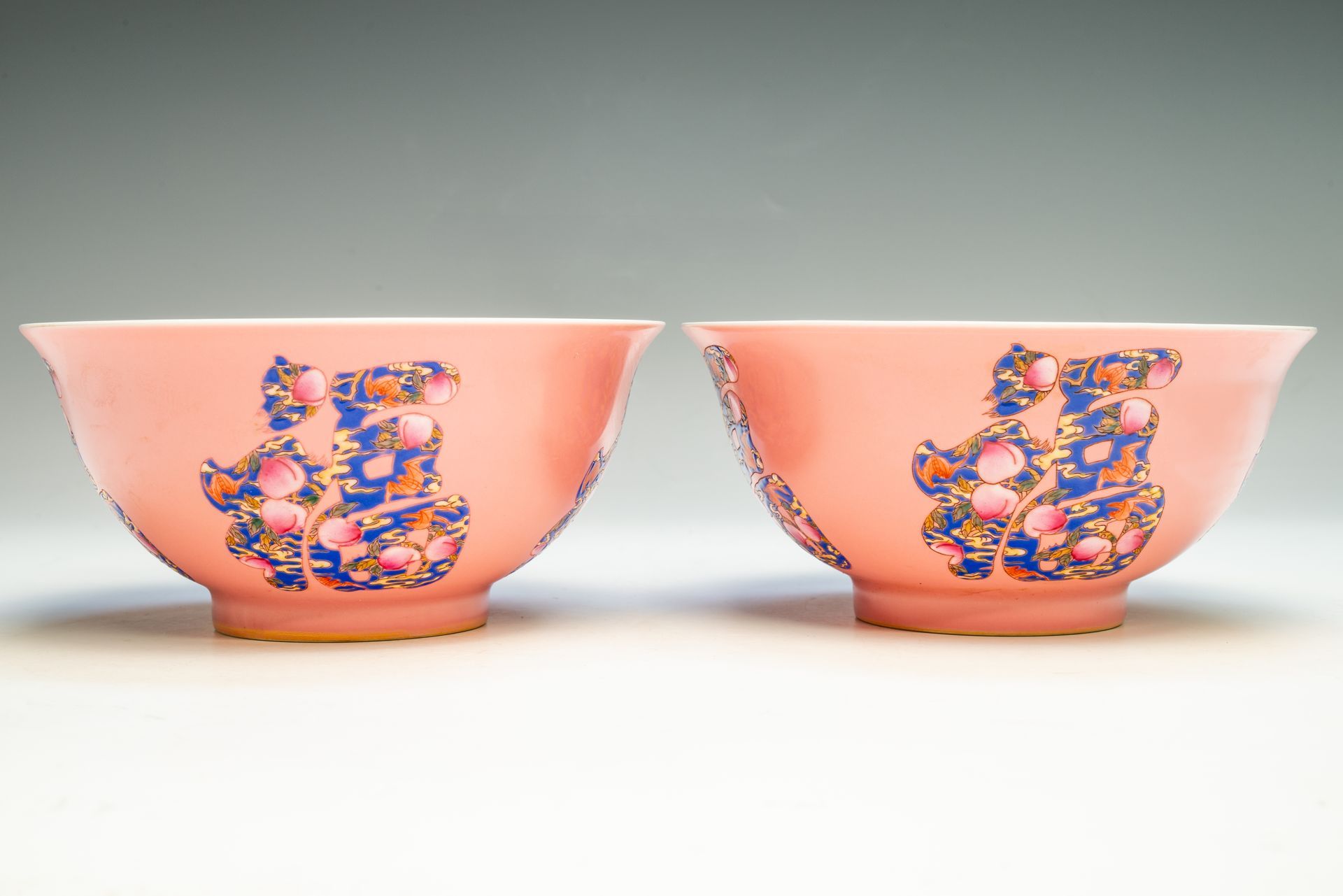 一对清康熙时期粉地珐琅彩碗,碗底有双方框,内有紫红色四字“玉治款”及“康熙年”字样。