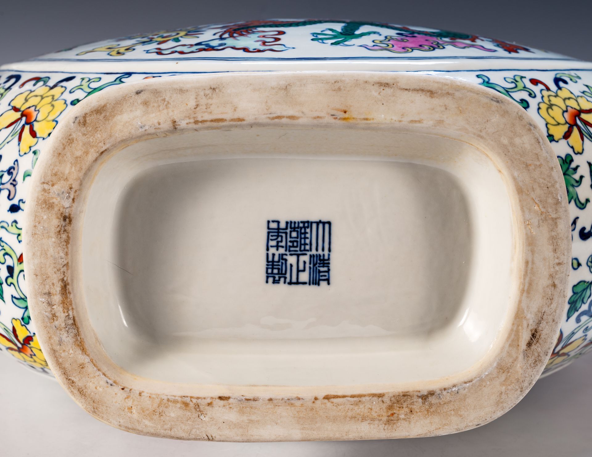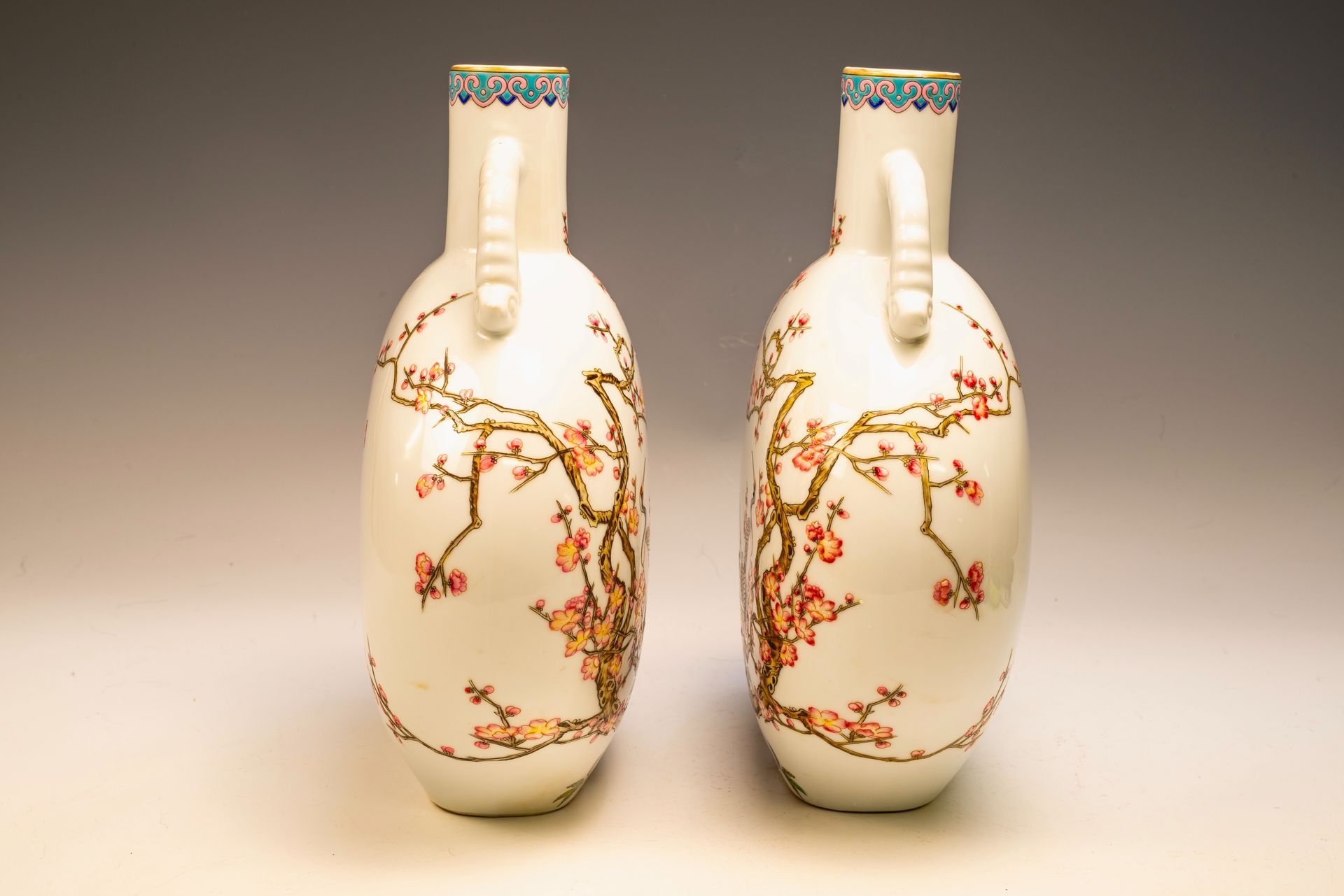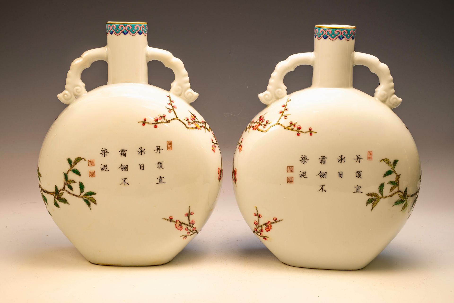 珐琅彩月形瓶以其精湛的工艺和艺术造诣而闻名,于雍正年间(1723年至1735年)在北京紫禁城内精心制作而成。这些器物代表了装饰艺术的巅峰之作,其珐琅彩工艺精湛绝伦,很可能是在皇帝的直接监督下完成的。每个月形瓶的制作都要求极高的技艺和精准度。瓶身饰以繁复的枝条、桃花、仙鹤和喜鹊纹样。瓶底镌刻诗句和三枚印章,更添文化底蕴。瓶底双方框内有“雍正”四字珐琅款识,清晰地表明了这些器物出自北京著名珐琅彩工匠之手。值得注意的是,这些月形瓶在设计上略有不同,这是雍正瓷器典型的特征,也因此更显其独特性。坯体上的剥落痕迹进一步印证了它们的历史价值和年代。艺术家精湛的技艺体现在每一个细节之中,使这些月形瓶成为同类器物中的杰出代表。对于眼光独到的收藏家而言,建议参考拍卖图录、学术文献和博物馆藏品,以评估可能存在的类似雍正法兰嘎彩月形瓶的稀有程度。这对月形瓶高约10.5英寸。
