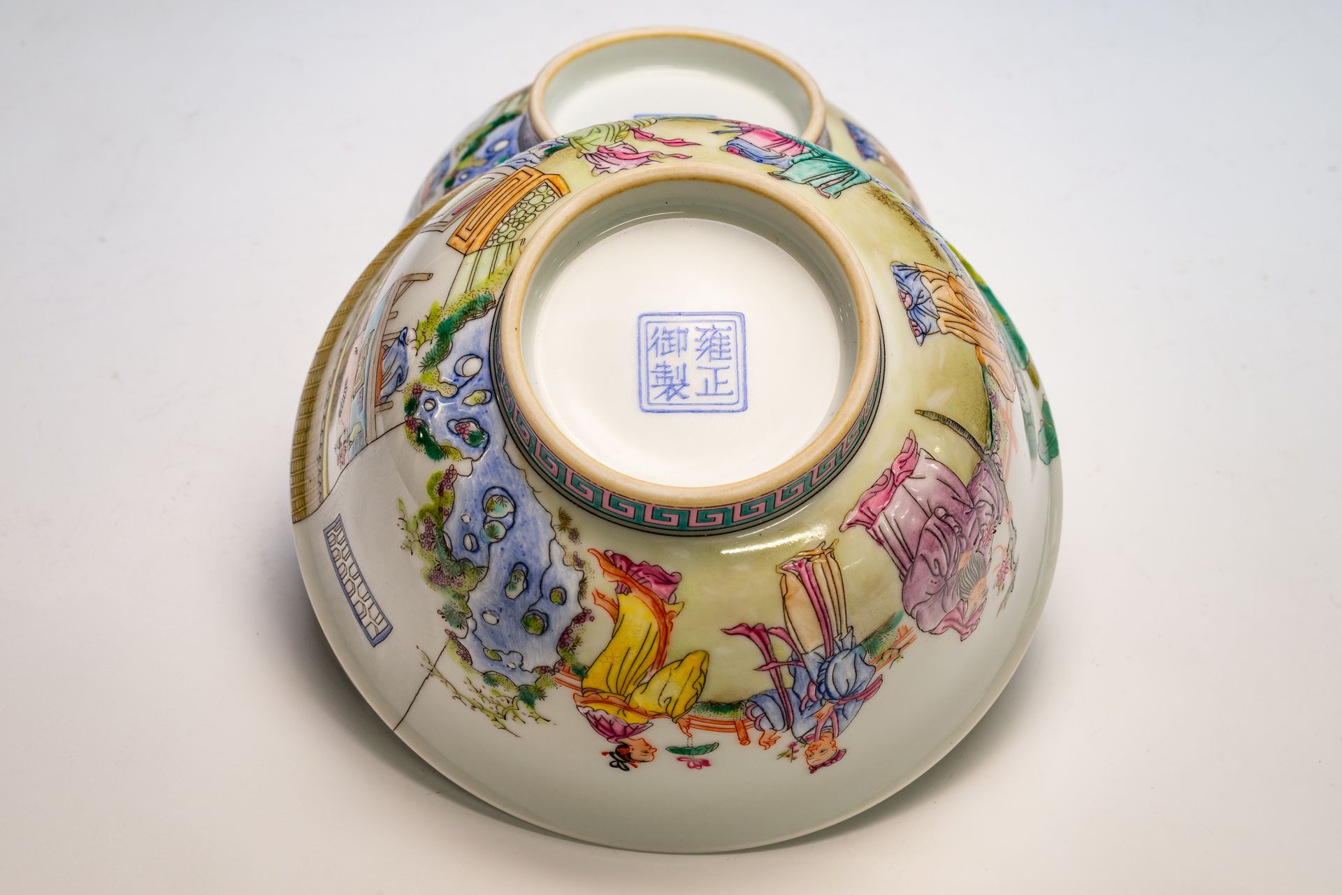 这对清代雍正故事碗造型精美,带有款识,确为雍正时期真品。碗身造型精巧,采用珐琅彩彩绘,色彩鲜艳,细节繁复。每只碗都绘有一则中国传统故事,人物形象栩栩如生,充分展现了珐琅彩彩绘的艺术特色。碗底以青花双方框绘有“雍正玉治”四字款识,是品质和真品的标志。值得一提的是,这对碗的细节刻画、色彩平衡和明暗处理都十分考究。需要注意的是,素坯略有剥落,这是年代久远的标志;而珐琅彩釉面仅有轻微的开裂,这也是珐琅彩瓷器常见的特征。整体而言,色彩依然绚丽夺目。每只雍正碗的直径约为6又1/4英寸。.ppjrs