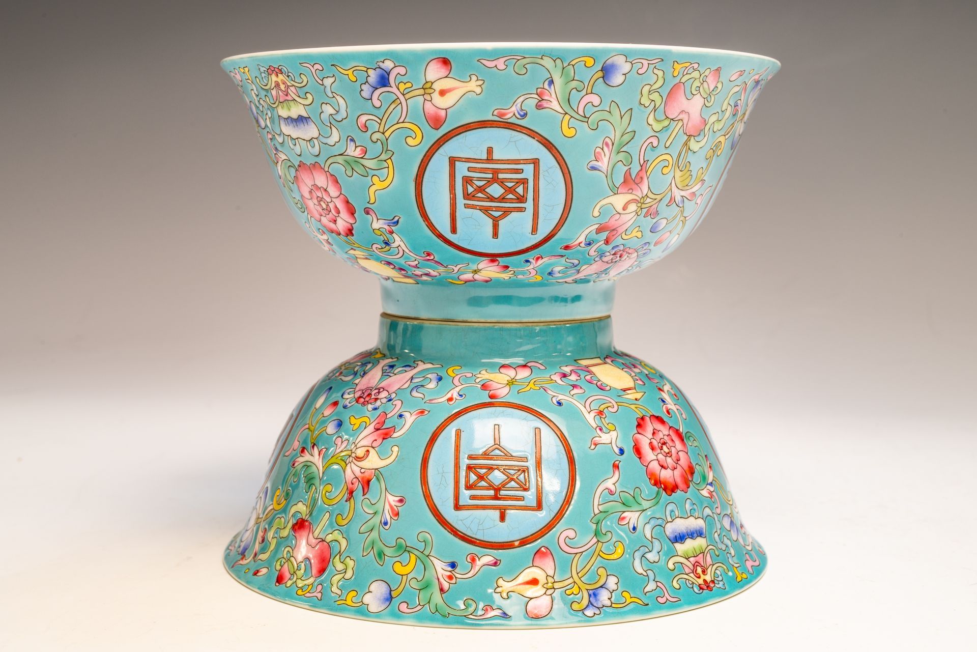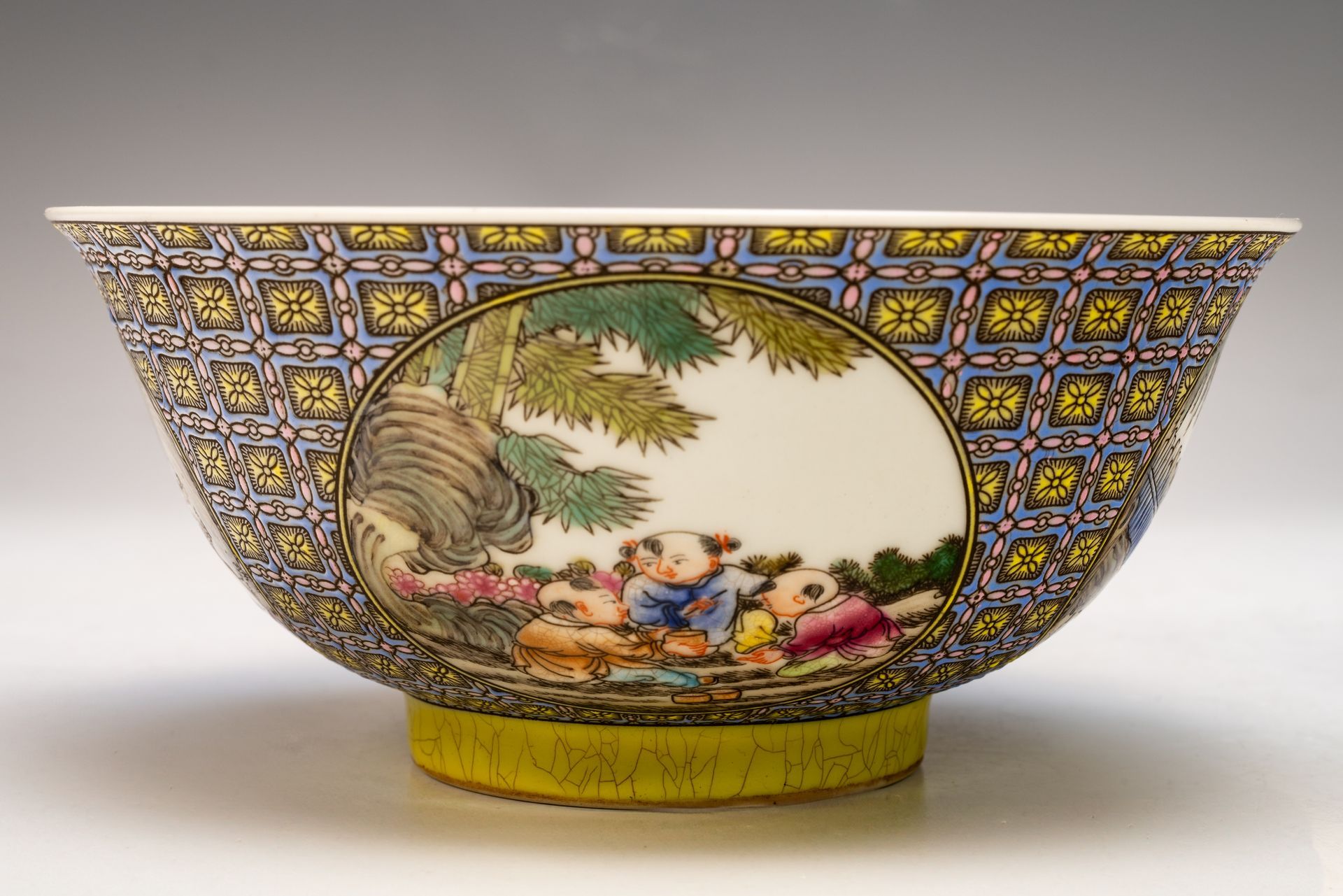 清代雍正时期御用故事碗,饰以法兰彩图案,碗底双方框内有“玉治年款”四字款识。