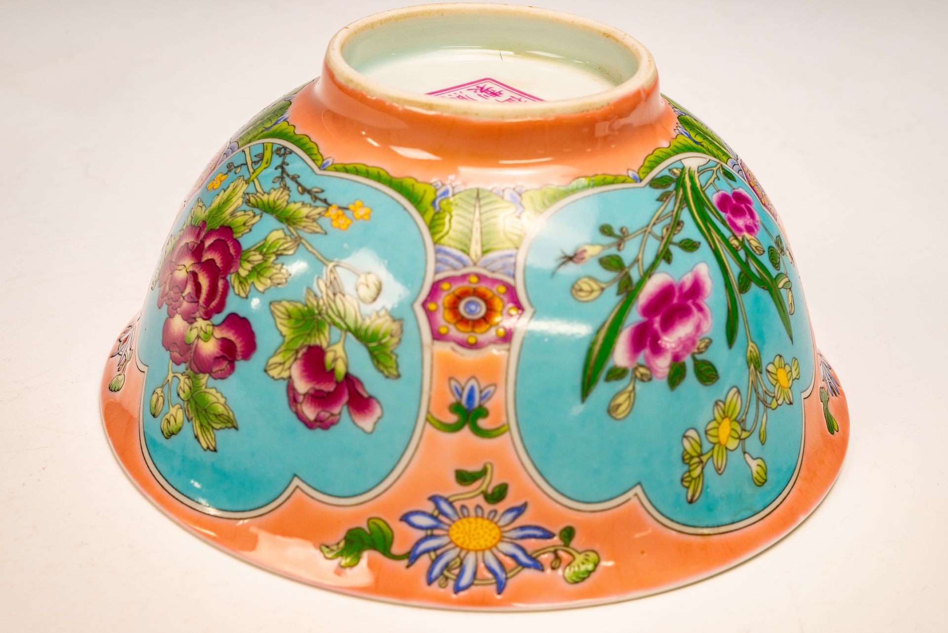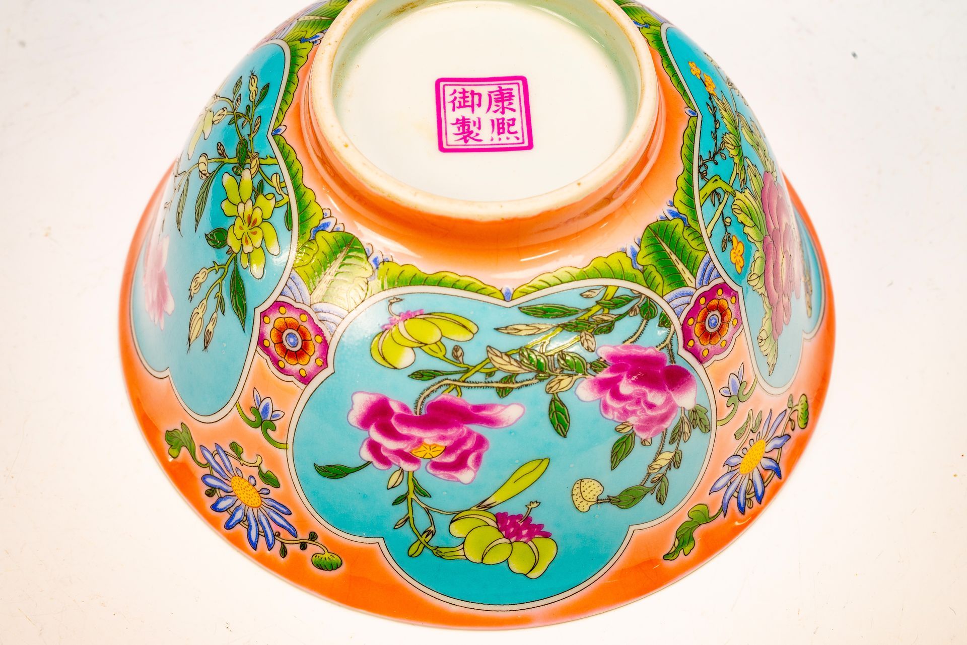 这对清代康熙时期的法兰彩碗工艺精湛。碗身饰以醒目的法兰彩图案,色彩丰富,花卉纹样鲜艳夺目,叶片翠绿细腻,与浅粉色底釉上四面深蓝绿色的釉面相映成趣。值得注意的是,碗底和碗身均有明显的釉裂纹,这是法兰彩珐琅的典型特征,进一步印证了其真品身份和年代。欣赏这对精美的碗时,色彩平衡和明暗处理的细节至关重要。此外,素烧胎面的剥落痕迹也表明了其历史价值。法兰彩的色彩运用尤为引人注目,提升了碗的整体美感。每只碗的底部均饰有康熙时期双方框内“玉治”四字款识,以紫红色珐琅釉绘,彰显其出处。这些做工精湛的康熙碗直径约为5 7/8英寸。.ppjrs