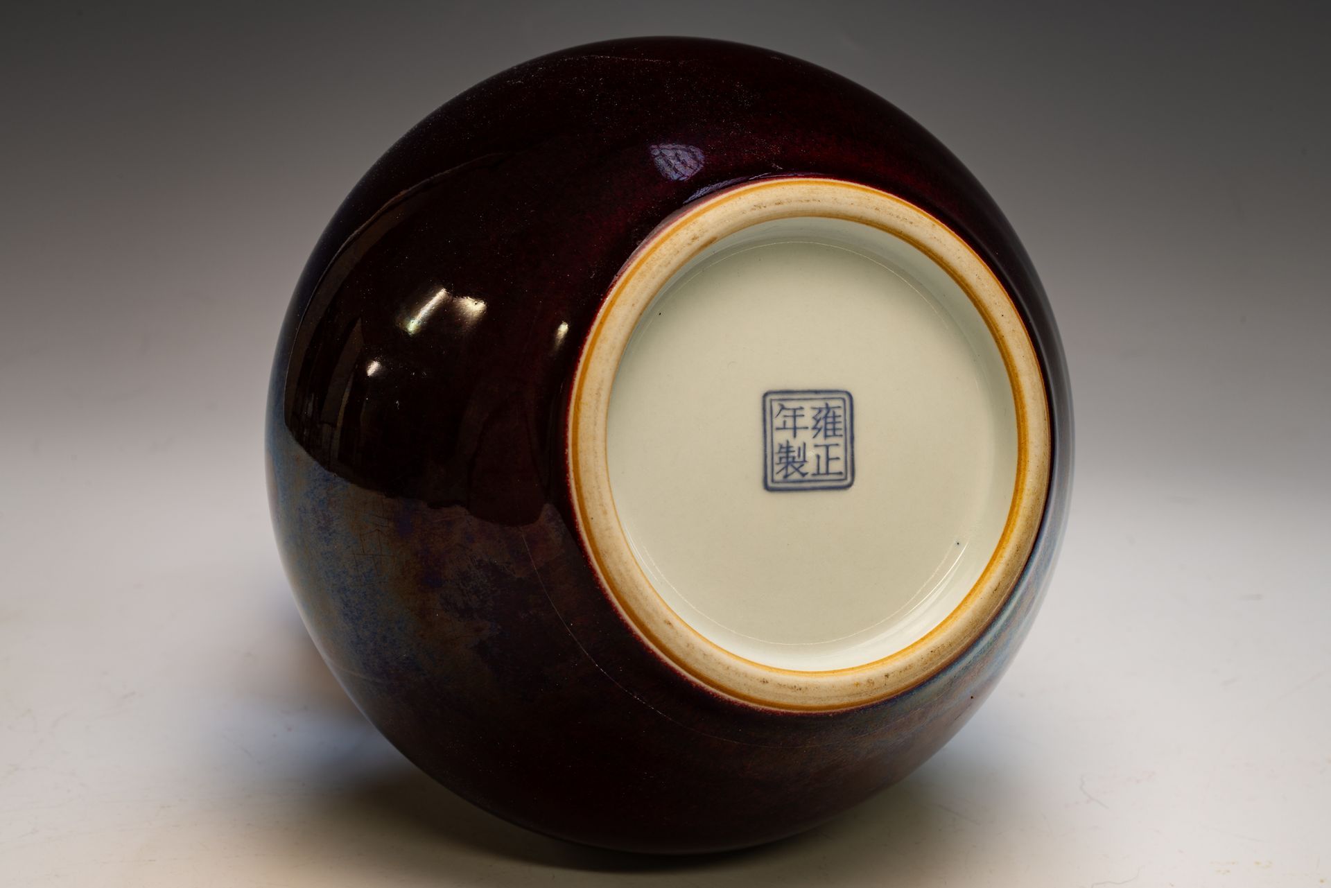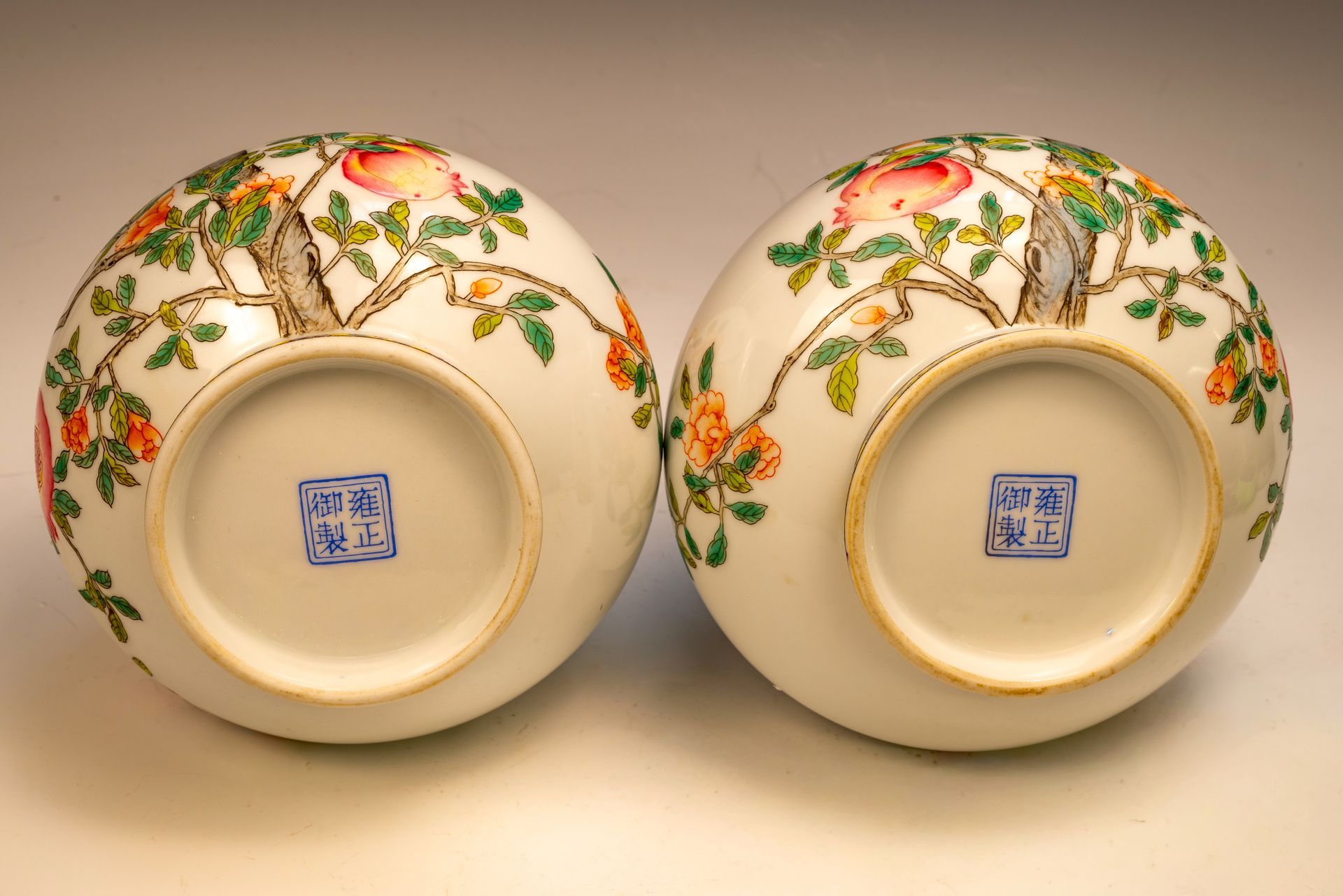 这对精美的清代雍正梨形石榴花瓶,均有款识,确为雍正时期真品。瓶身造型优美,采用珐琅彩彩绘,色彩鲜艳,细节精致。每只花瓶上都绘有一棵石榴树,枝繁叶茂,花朵盛开,果实累累。这对梨形花瓶充分展现了珐琅彩彩绘的艺术魅力。瓶底均饰有“雍正玉治”四字款识,以青花绘于双方框内,是品质和真品的标志。值得注意的是,这两件作品的细节刻画、色彩平衡和明暗处理都十分考究。胎体有轻微剥落,这是年代久远的标志;釉面也可见细密的开片,这是珐琅彩瓷器常见的特征。雍正瓷器的色彩搭配依然美轮美奂。每件雍正瓷器高约8.5英寸。.ppjrs