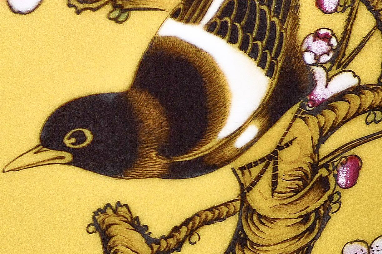 这些精美的法兰嘎彩珐琅瓶薄如蝉翼,瓶口厚度不足一角硬币的一半。它们于雍正时期(1723年至1735年)在北京紫禁城制作,展现了雍正皇帝亲自监督的精湛技艺。瓶身饰以繁复的纹样,包括枝条、梅花和飞鸟,每一处细节都展现了制作者非凡的技艺。雍正法兰嘎彩珐琅独特的色彩赋予了这些器物独特的个性,使其易于被鉴赏家识别。瓶底镌刻有一首诗句和三枚印章,进一步提升了这些器物的历史价值。瓶底双方框内以青花珐琅书写的“雍正年款”证明了这些器物的真伪,这是北京珐琅工匠所添加的。值得注意的是,这对花瓶并非完全相同,这符合雍正时期花瓶的典型特征。这两件花瓶的工艺精湛,瓶口雕琢得极其精细,甚至有人将其比作乳白玻璃。其制作工艺之精湛和精准令人叹为观止。这两件花瓶品质卓越,有意者可查阅拍卖图录、学术出版物和博物馆藏品,以了解此类精美雍正法兰嘎彩花瓶的稀有性和卓越品质。每件花瓶高约9 1/8英寸。