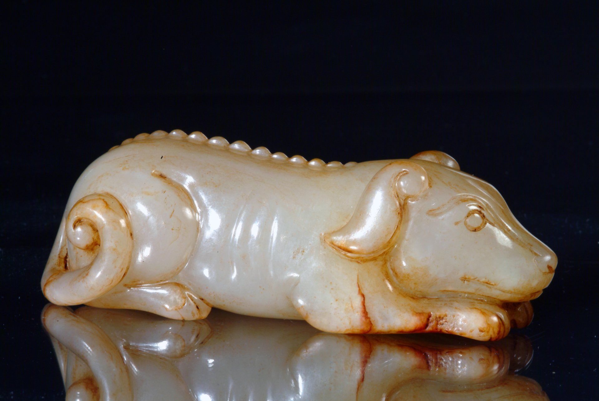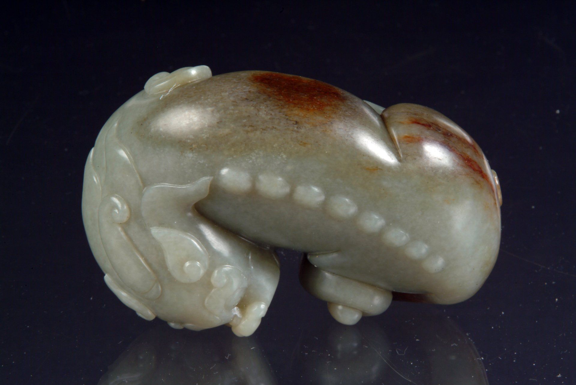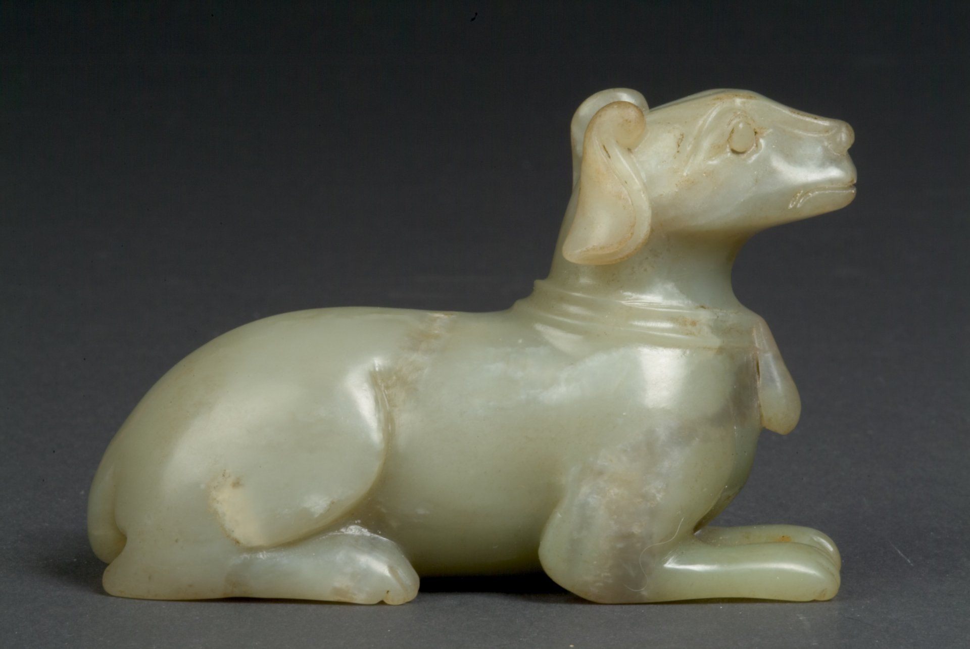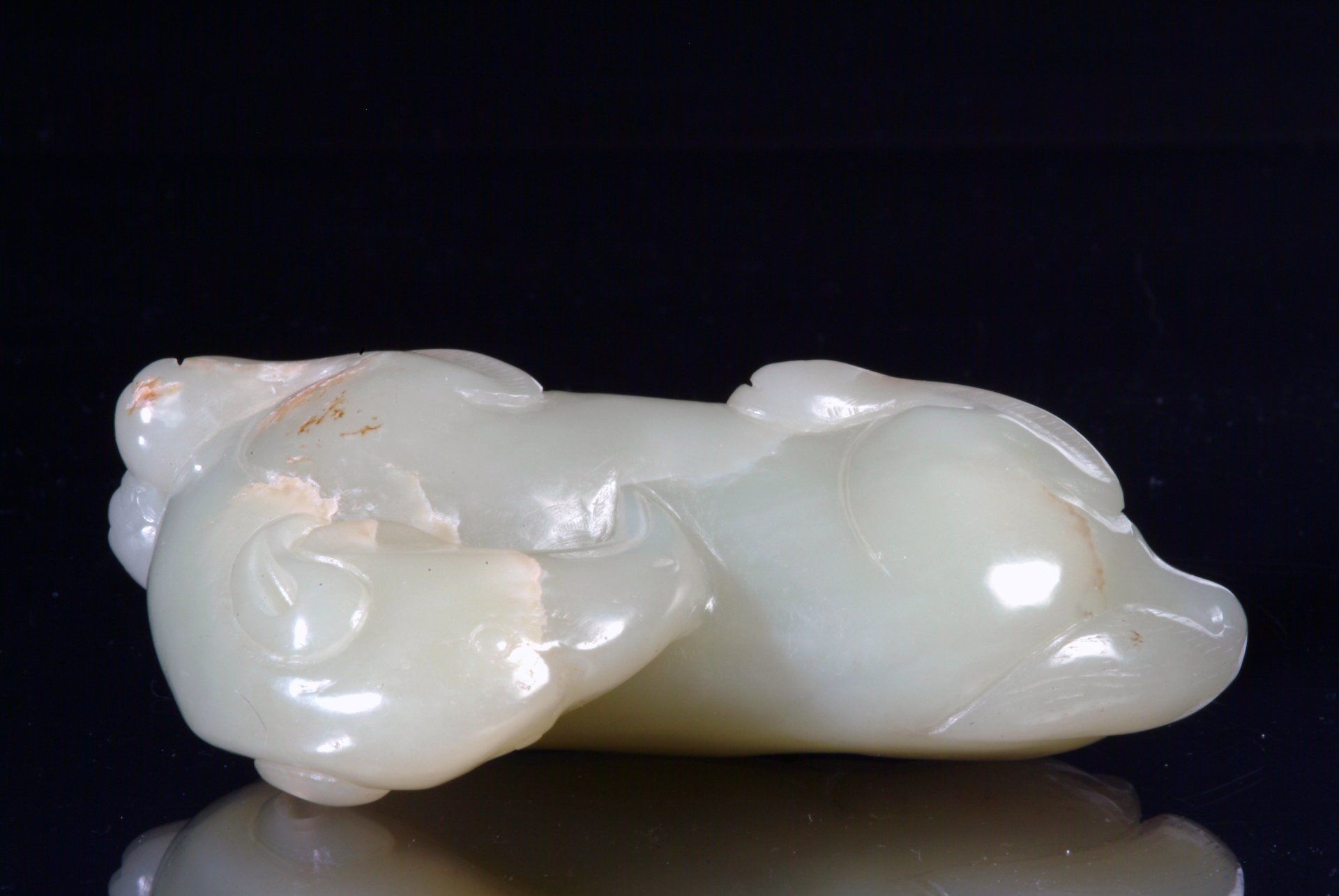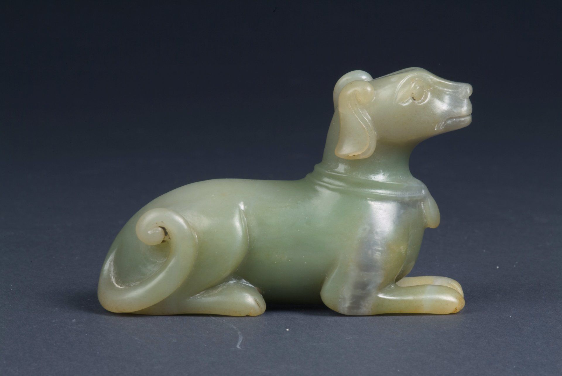 这尊精美的宋代玉雕猎犬坐像,呈灰绿色,并带有明显的棕色和白色内含物,印证了其历史价值。独特的雕刻风格也进一步证实了其年代。雕像高约4¾英寸。