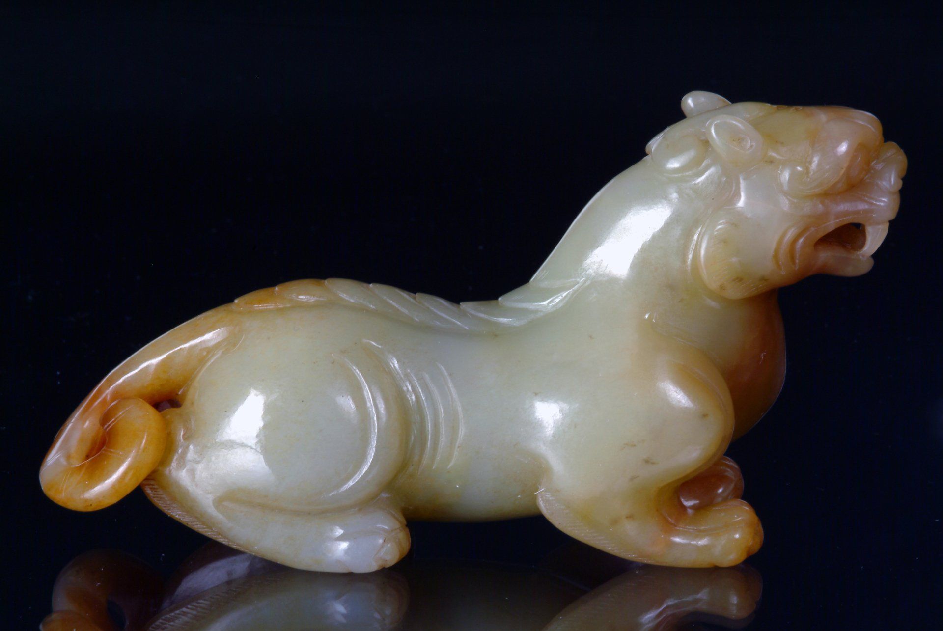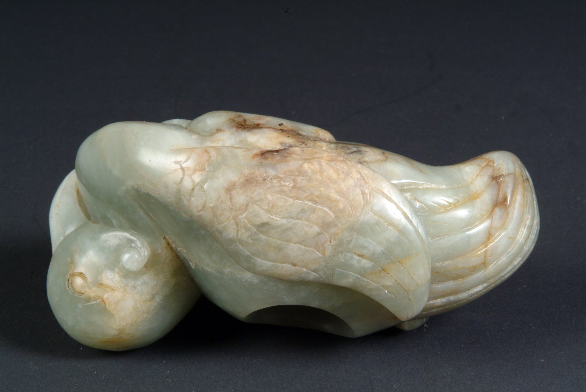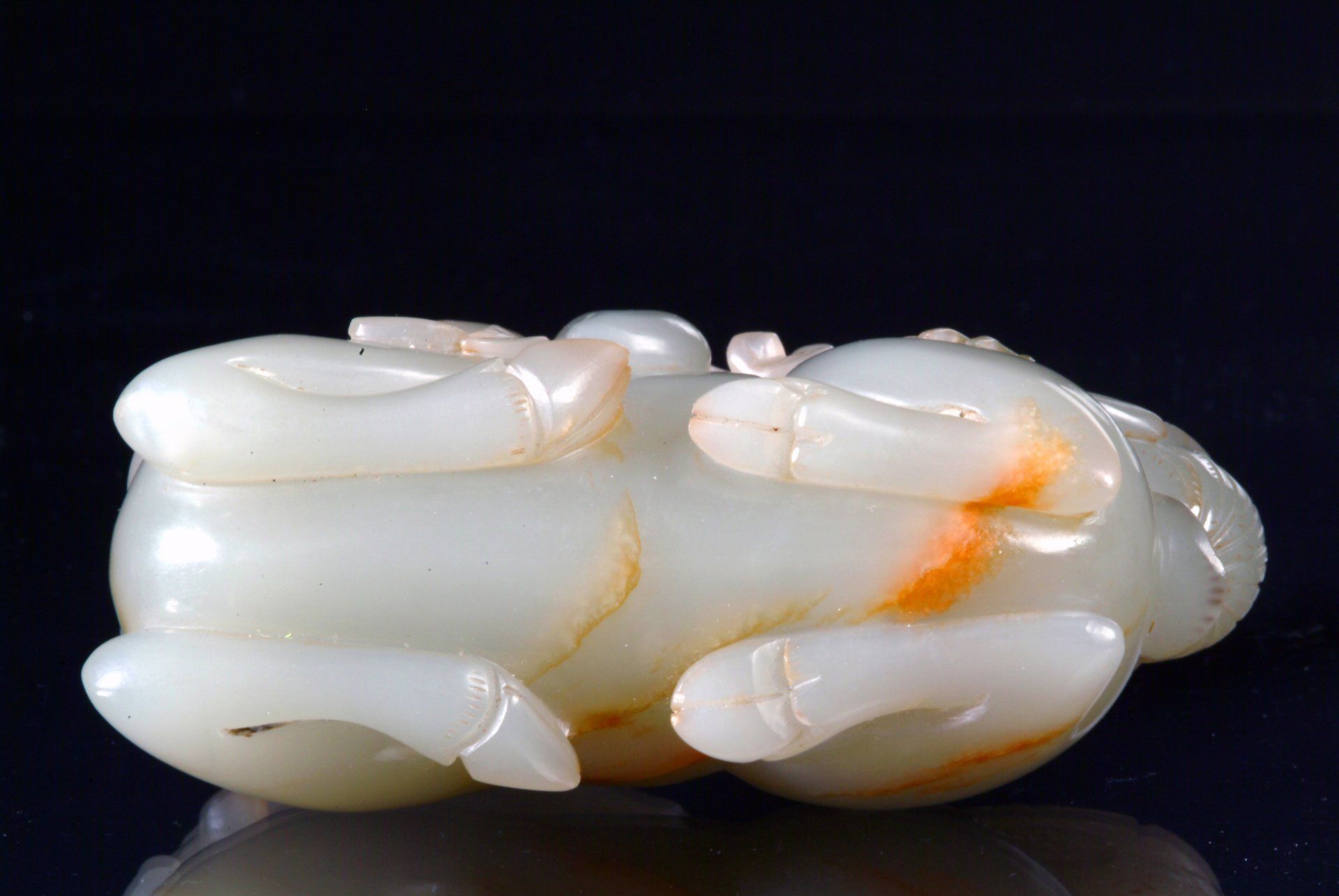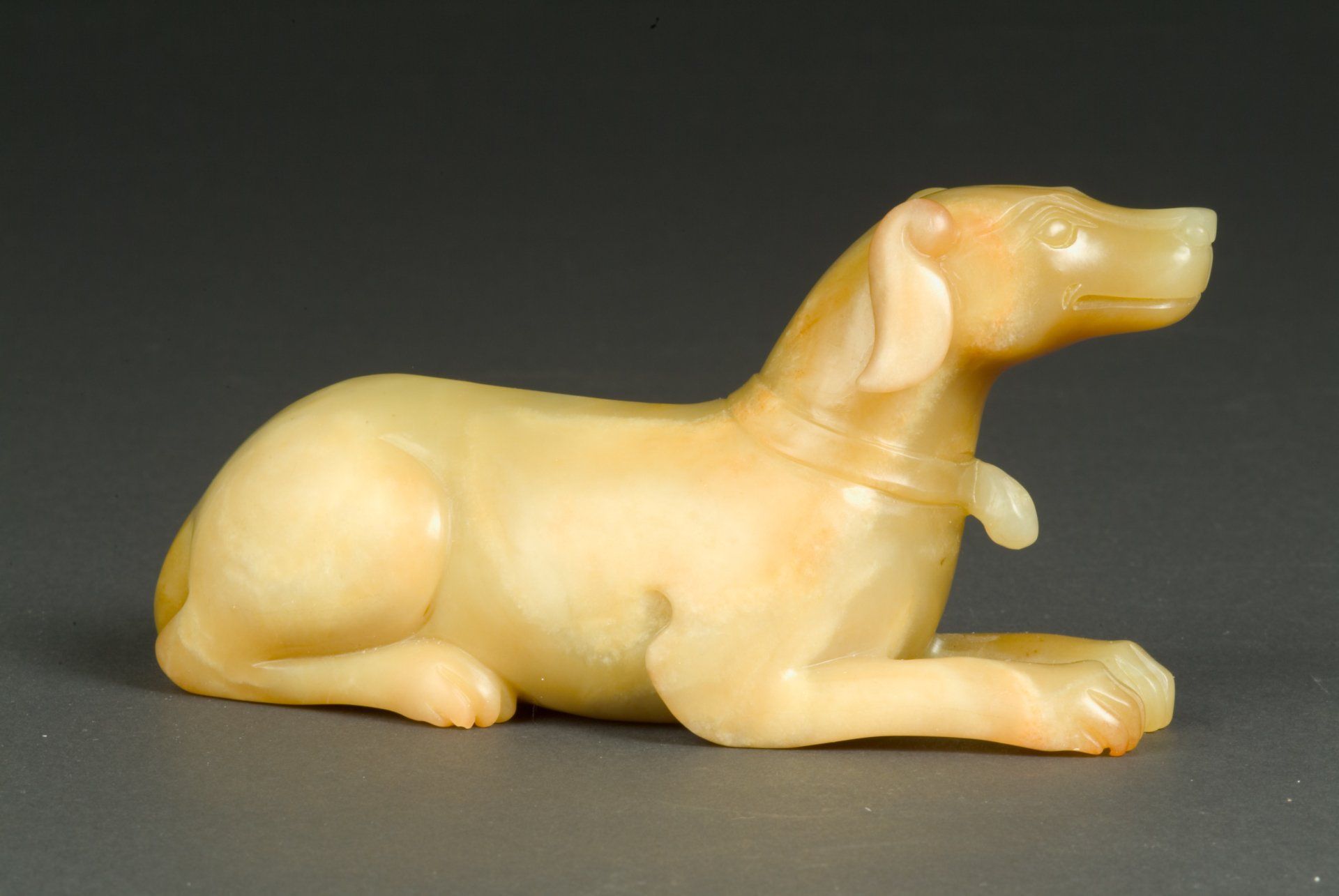 这尊精美的宋代玉雕猎犬坐像,呈灰绿色,并带有明显的棕色和白色内含物,印证了其历史价值。独特的雕刻风格也进一步证实了其年代。雕像高约4¾英寸。