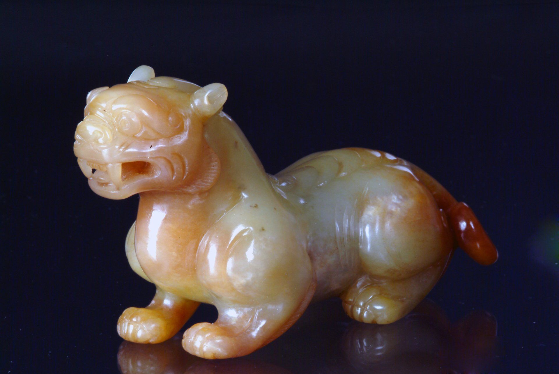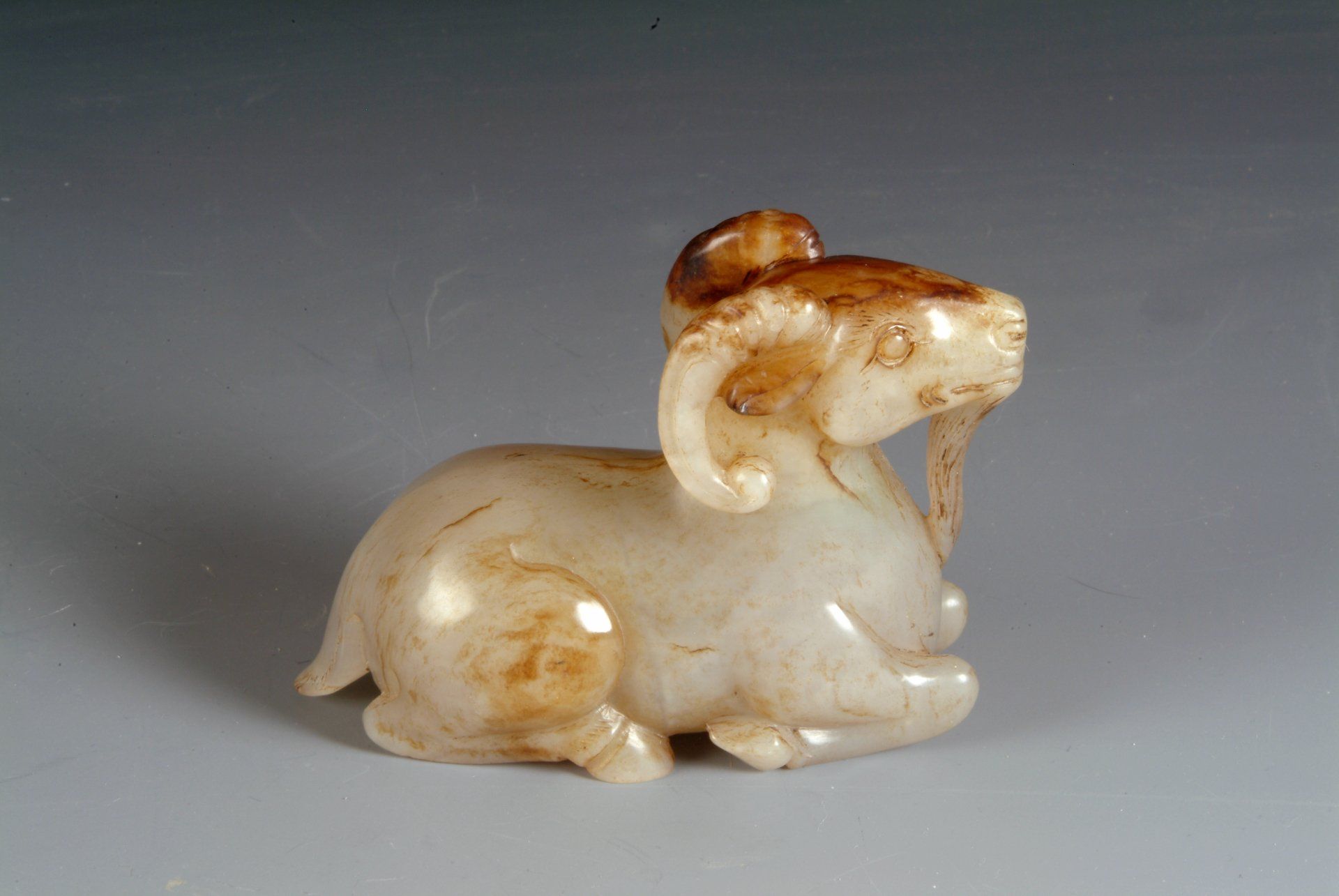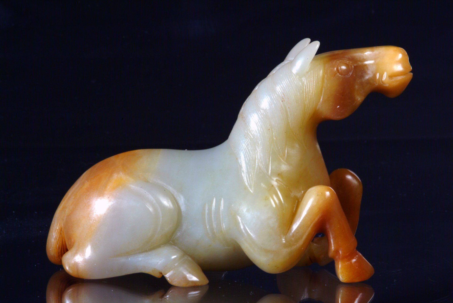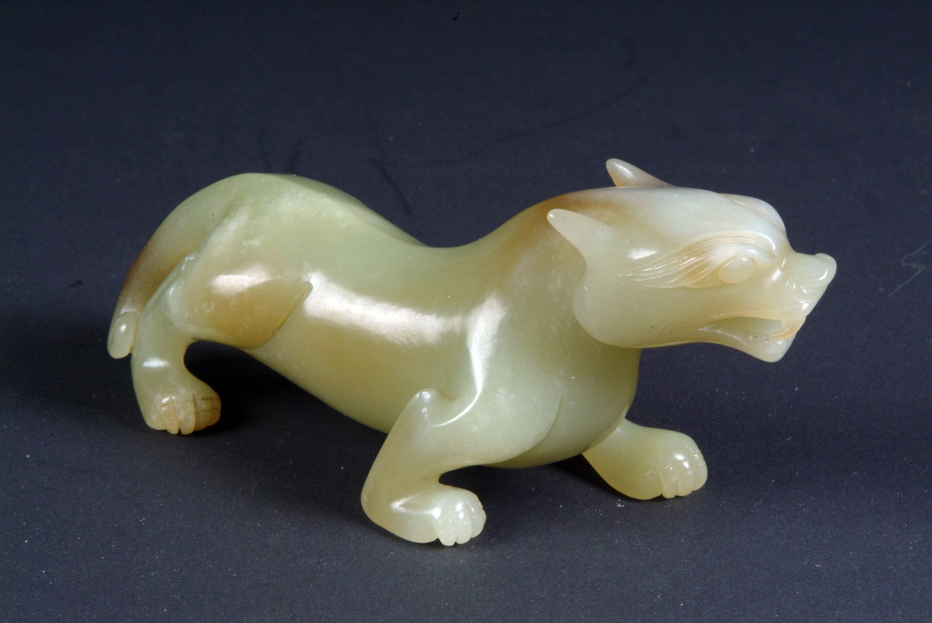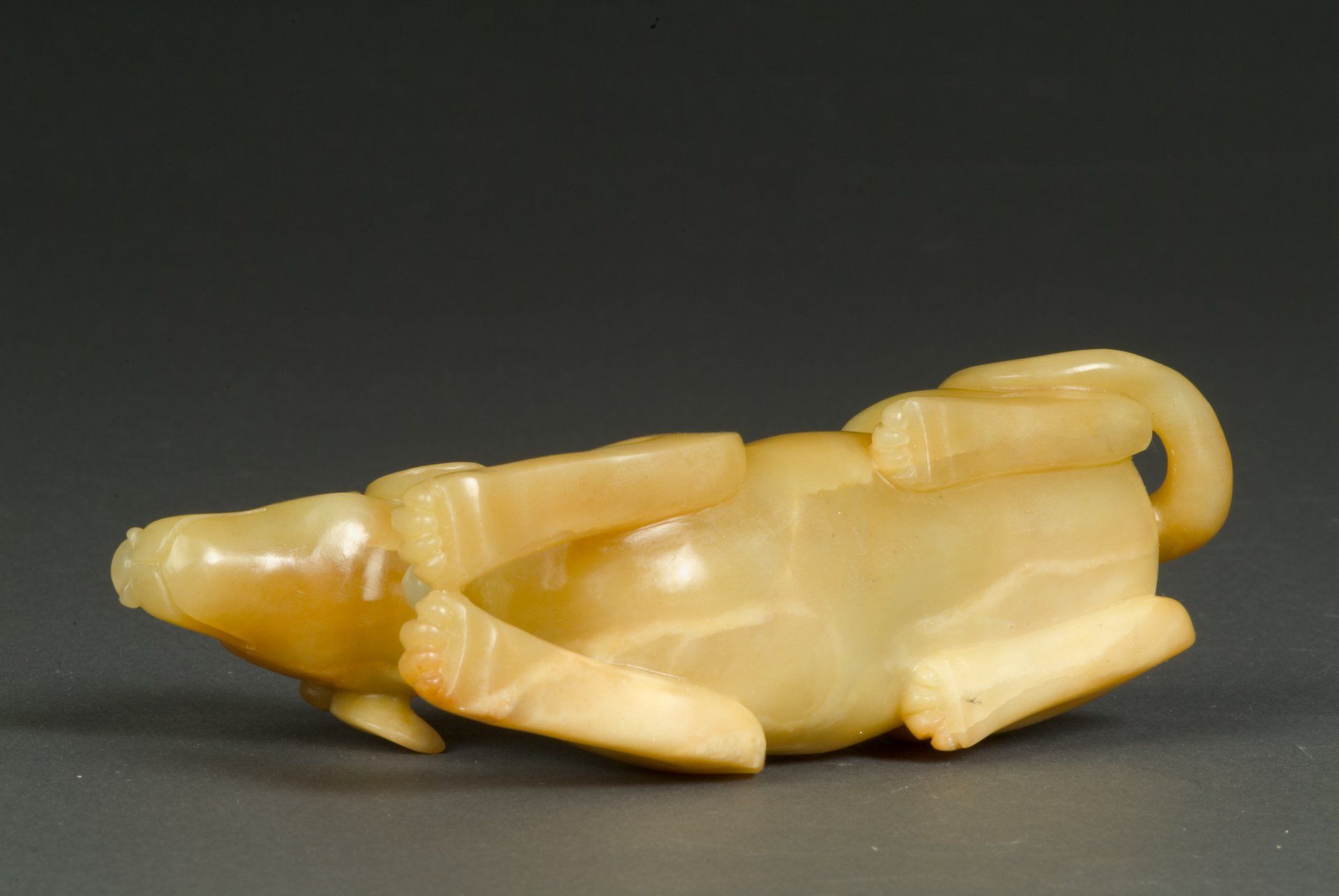 这尊精美的宋代玉雕猎犬坐像,呈灰绿色,并带有明显的棕色和白色内含物,印证了其历史价值。独特的雕刻风格也进一步证实了其年代。雕像高约4¾英寸。