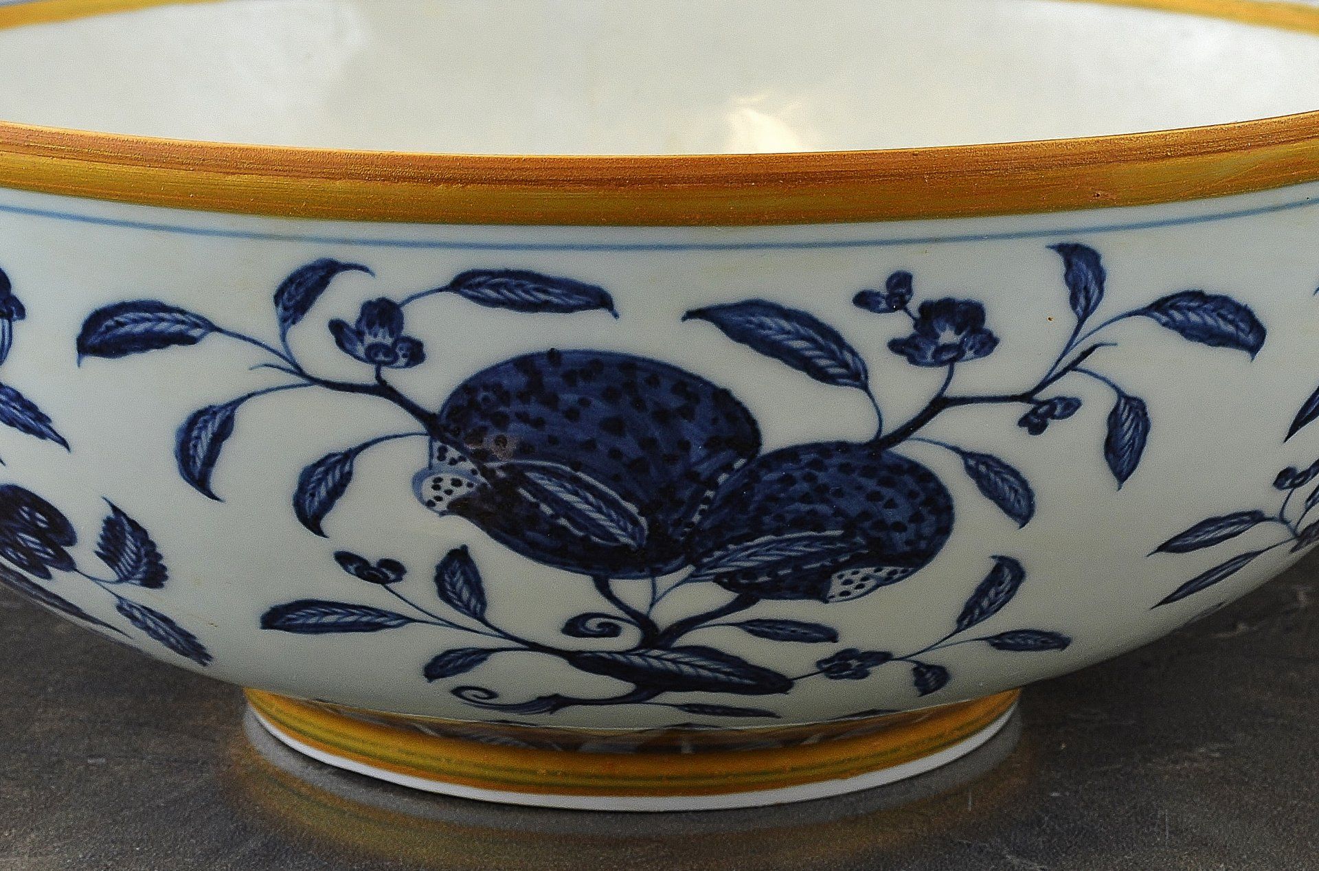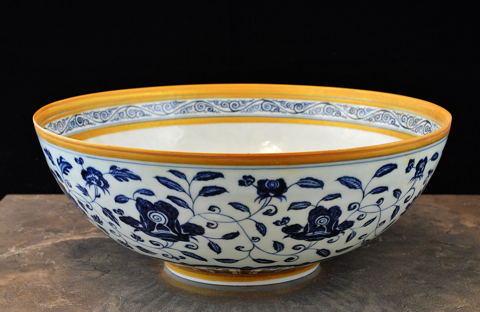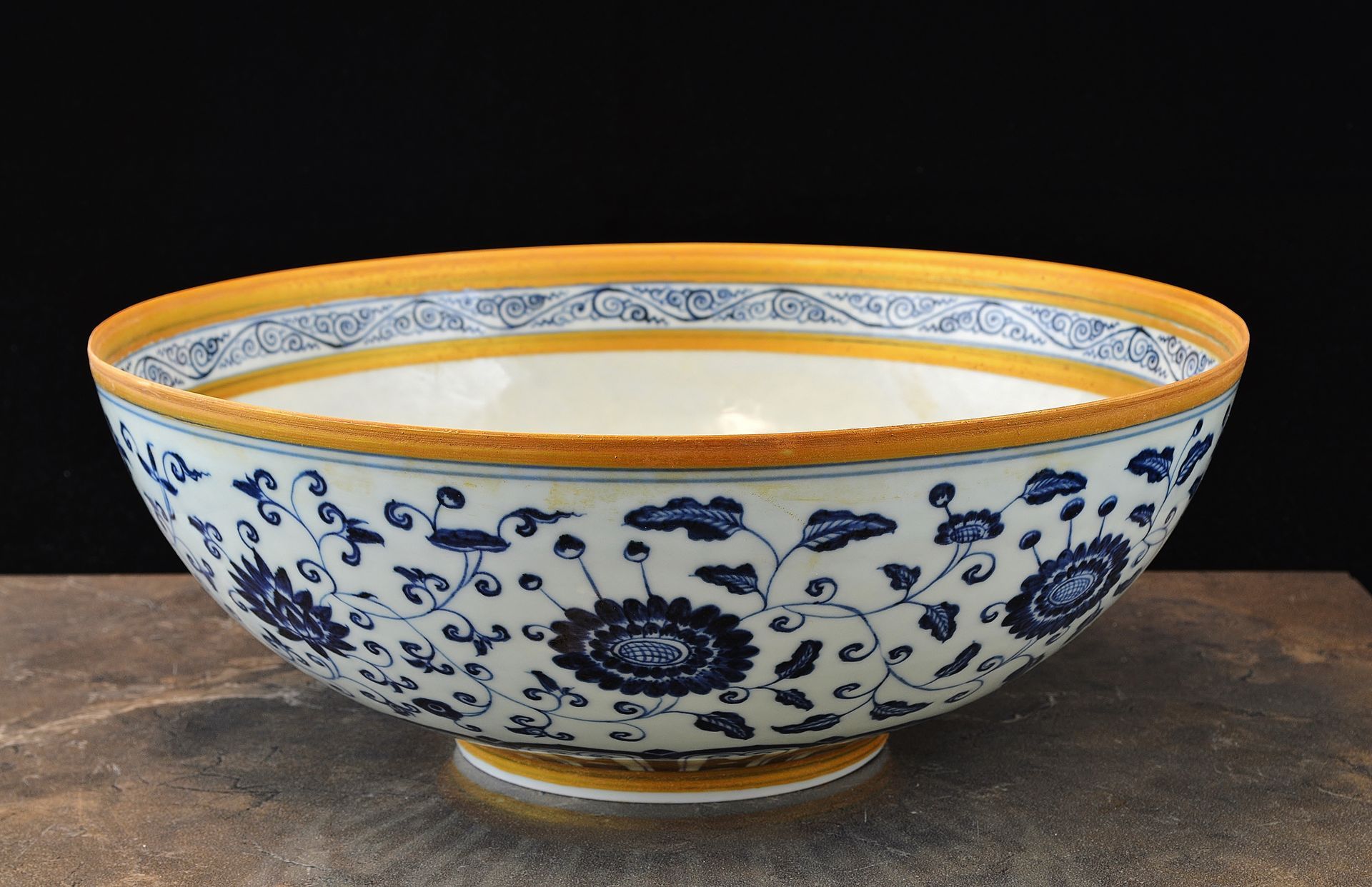This exquisite blue and white bowl, originating from the Xuande period of the 15th century Ming Dynasty, displays the artistry and craftsmanship of its time. The bowl features a delicate eggshell-thin construction, adorned with intricate depictions of flowers, vines, and leaves. It is further enhanced by gilt trim, adding a touch of elegance to its overall design. The bowl is painted with imported Samali blue cobalt, notable for its distinctive blackish tone. This characteristic is particularly evident where the heaping and piling effects disrupt the glaze, revealing black spots or a silvery reflection, rather than the brown associated with locally sourced Chinese cobalt. This specific type of cobalt has not been available for over 500 years, serving as a critical indicator of the bowl's authenticity and age. Additionally, observations of flaking in the biscuit layer further substantiate its historical significance. The bowl has an approximate diameter of 11 3/4 inches, making it a striking centerpiece for any collection. Its combination of age, materials, and craftsmanship exemplifies the sophistication of Ming Dynasty porcelain. ppjrs