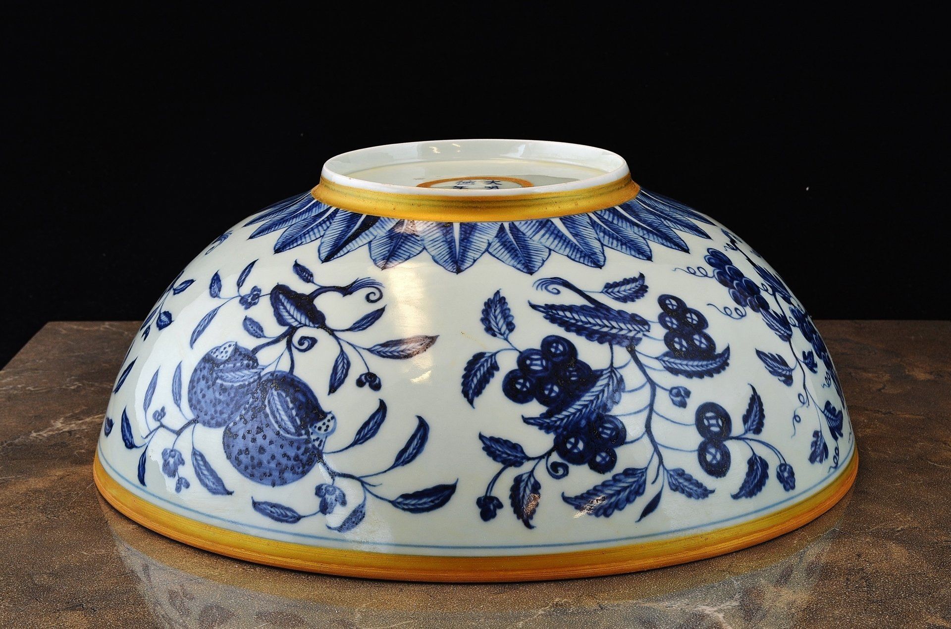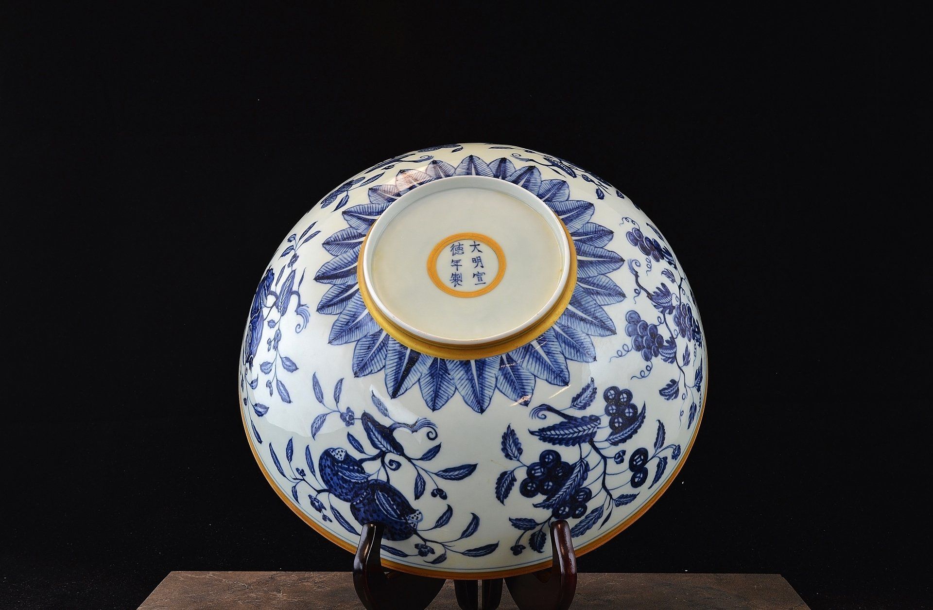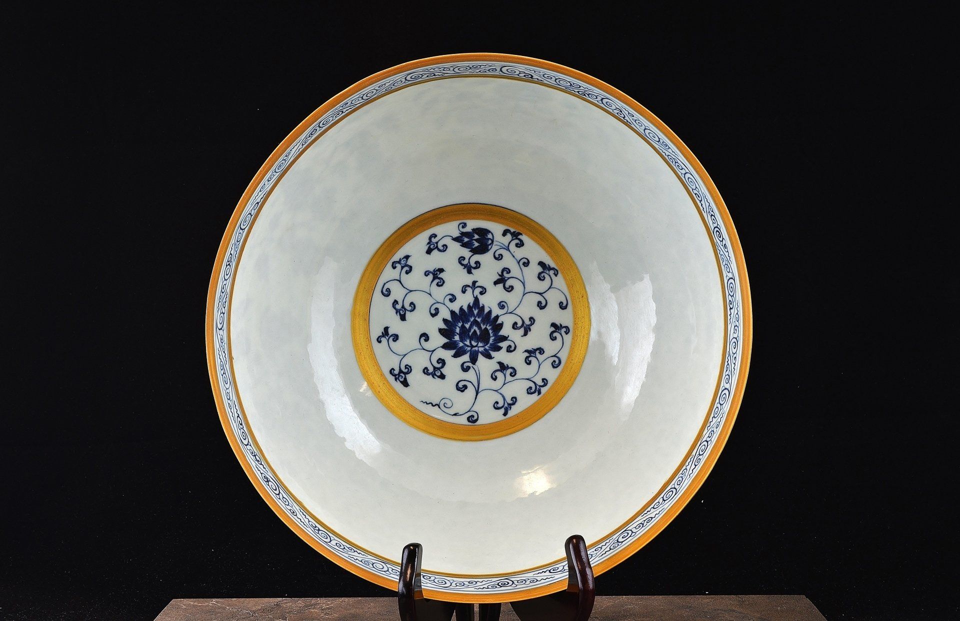 This exquisite blue and white bowl, originating from the Xuande period of the 15th century Ming Dynasty, displays the artistry and craftsmanship of its time. The bowl features a delicate eggshell-thin construction, adorned with intricate depictions of flowers, vines, and leaves. It is further enhanced by gilt trim, adding a touch of elegance to its overall design. The bowl is painted with imported Samali blue cobalt, notable for its distinctive blackish tone. This characteristic is particularly evident where the heaping and piling effects disrupt the glaze, revealing black spots or a silvery reflection, rather than the brown associated with locally sourced Chinese cobalt. This specific type of cobalt has not been available for over 500 years, serving as a critical indicator of the bowl's authenticity and age. Additionally, observations of flaking in the biscuit layer further substantiate its historical significance. The bowl has an approximate diameter of 11 3/4 inches, making it a striking centerpiece for any collection. Its combination of age, materials, and craftsmanship exemplifies the sophistication of Ming Dynasty porcelain. ppjrs