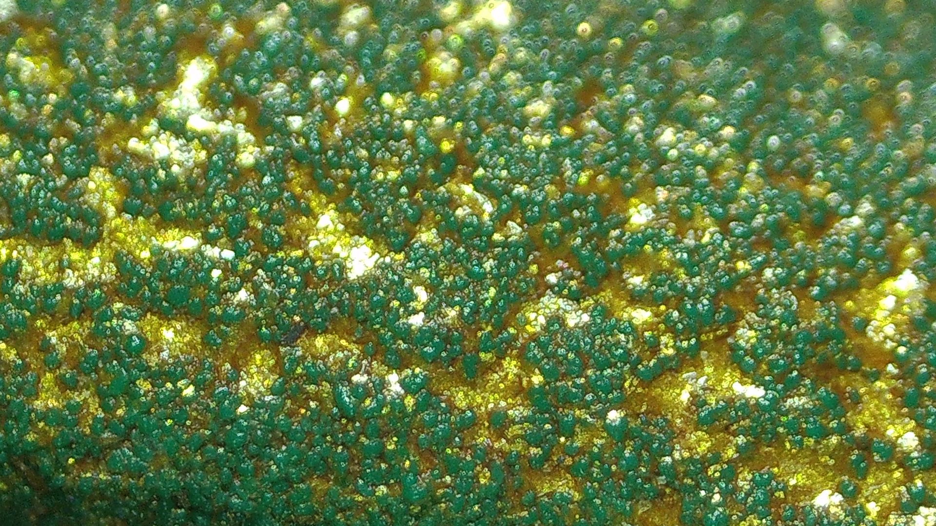 The fanlike malachite needles grow into tightly bonded spherules, which crowd together and bond, forming a solid mass. When the spherules stop growing and terminate, the top surface is rounded to some degree. The terms “botryoidal” (resembling a cluster of grapes) and “reniform” (kidney-shaped) are used to describe large to small undulating masses of spherules.
