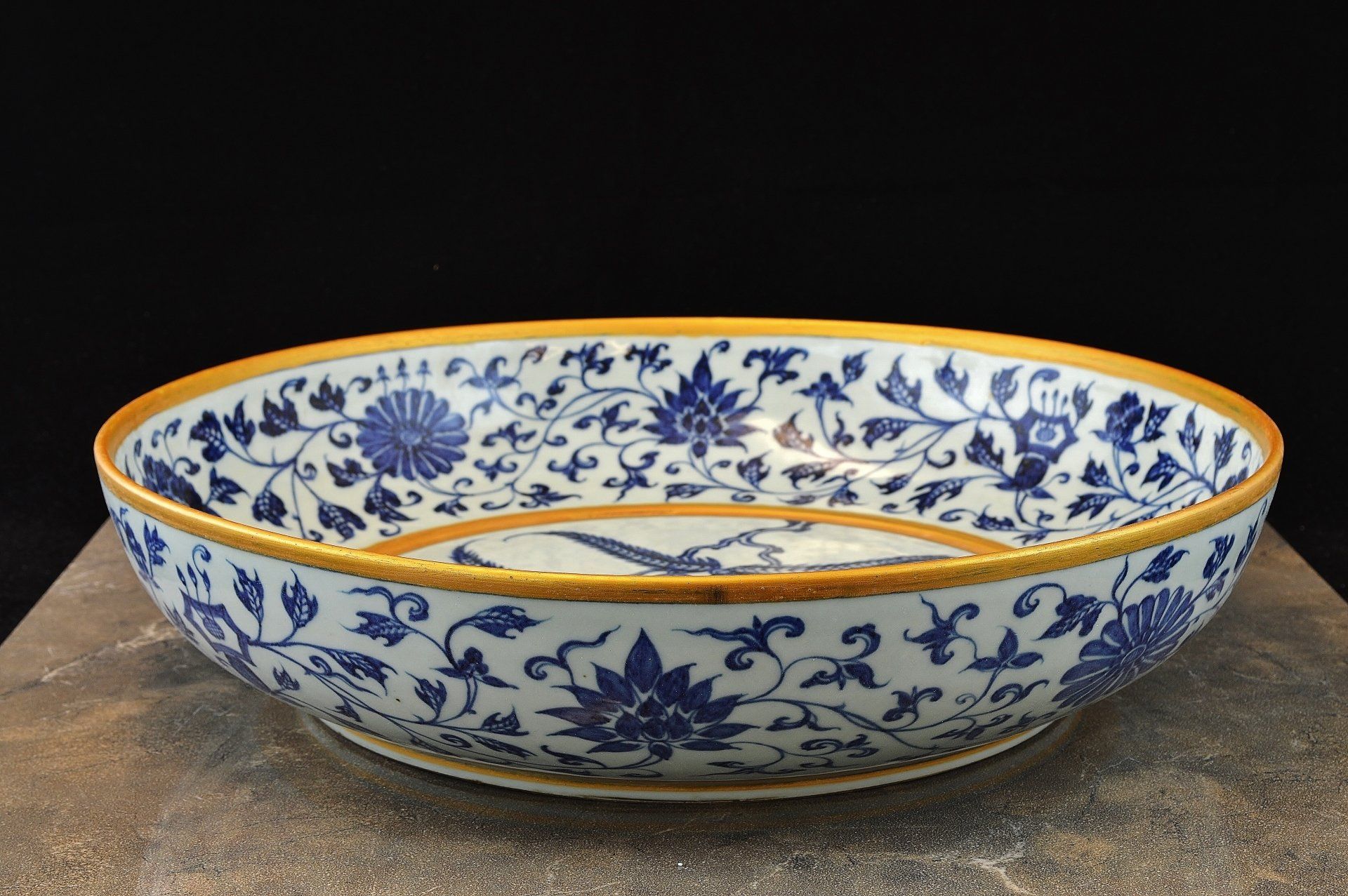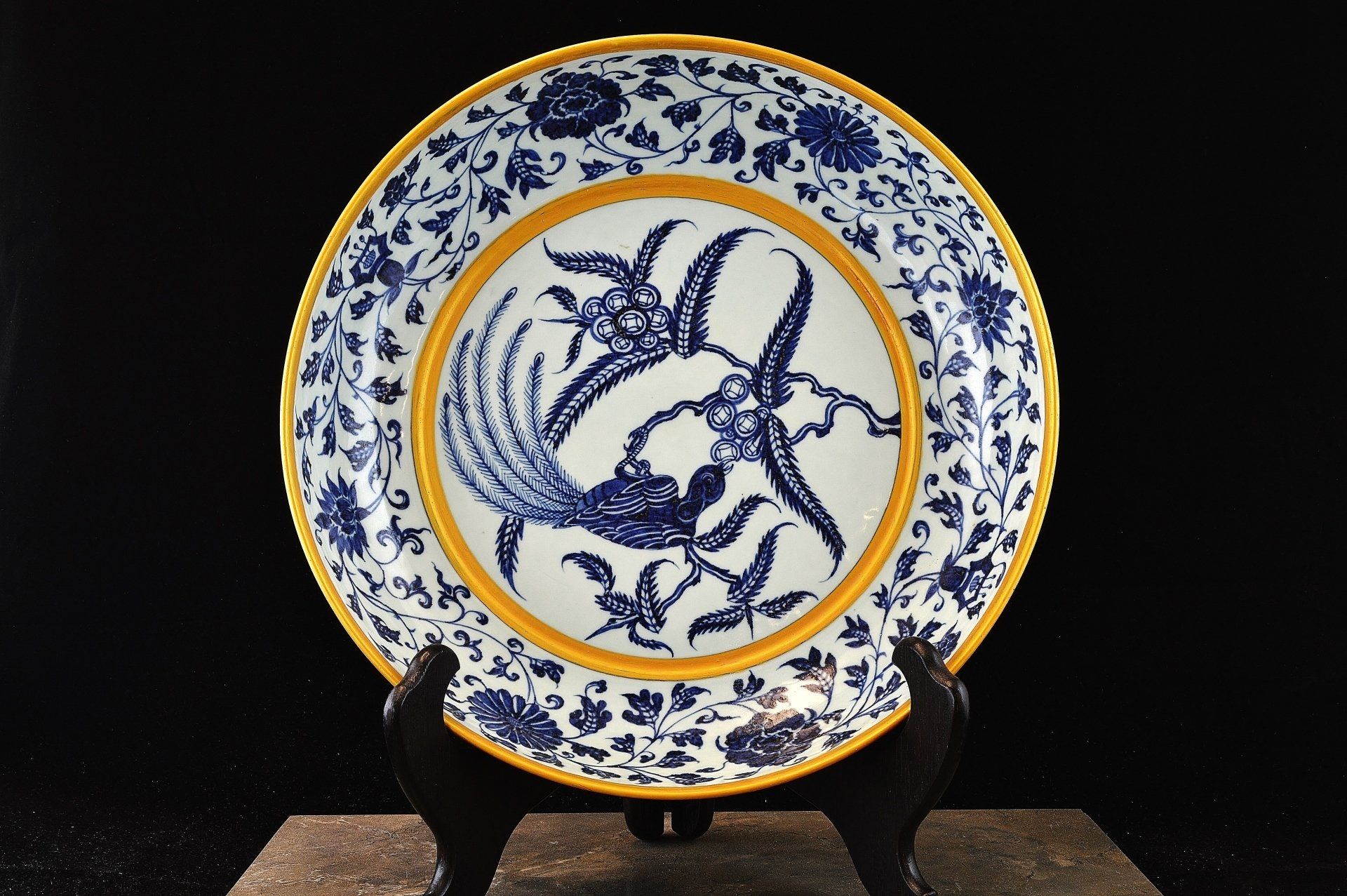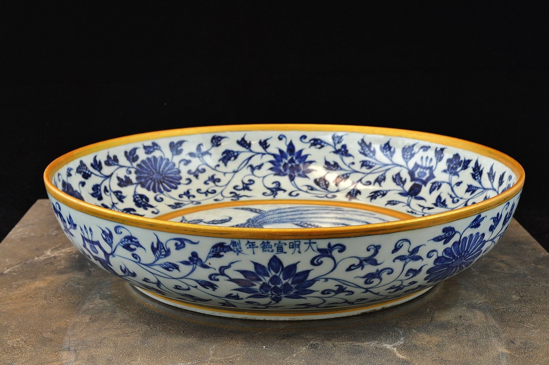 This exquisite 15th Century Ming Dynasty dish, designated with the Xuande mark and period, is elegantly crafted in a blue and white palette. It features a meticulously painted design that includes phoenixes, floral motifs, foliage, and fruit. This remarkable artifact is further enhanced by gilt trim accents, which underscore its artistic value. The dish is embellished with imported Samali blue cobalt, which is noted for its distinctive blackish hue. The unique piling effect on the surface glaze reveals dark spots or a silvery sheen, elements that authenticate the piece and differentiate it from the brown undertones associated with locally produced Chinese cobalt. Such characteristics affirm the dish's historical provenance, as this specific type of cobalt has not been utilized for over five centuries. Furthermore, noticeable flaking in the biscuit layer adds to the dish's historical significance, confirming its age and authenticity. The dish measures approximately 14 1/8 inches in diameter, making it a substantial specimen for collectors and connoisseurs alike. ppjrs