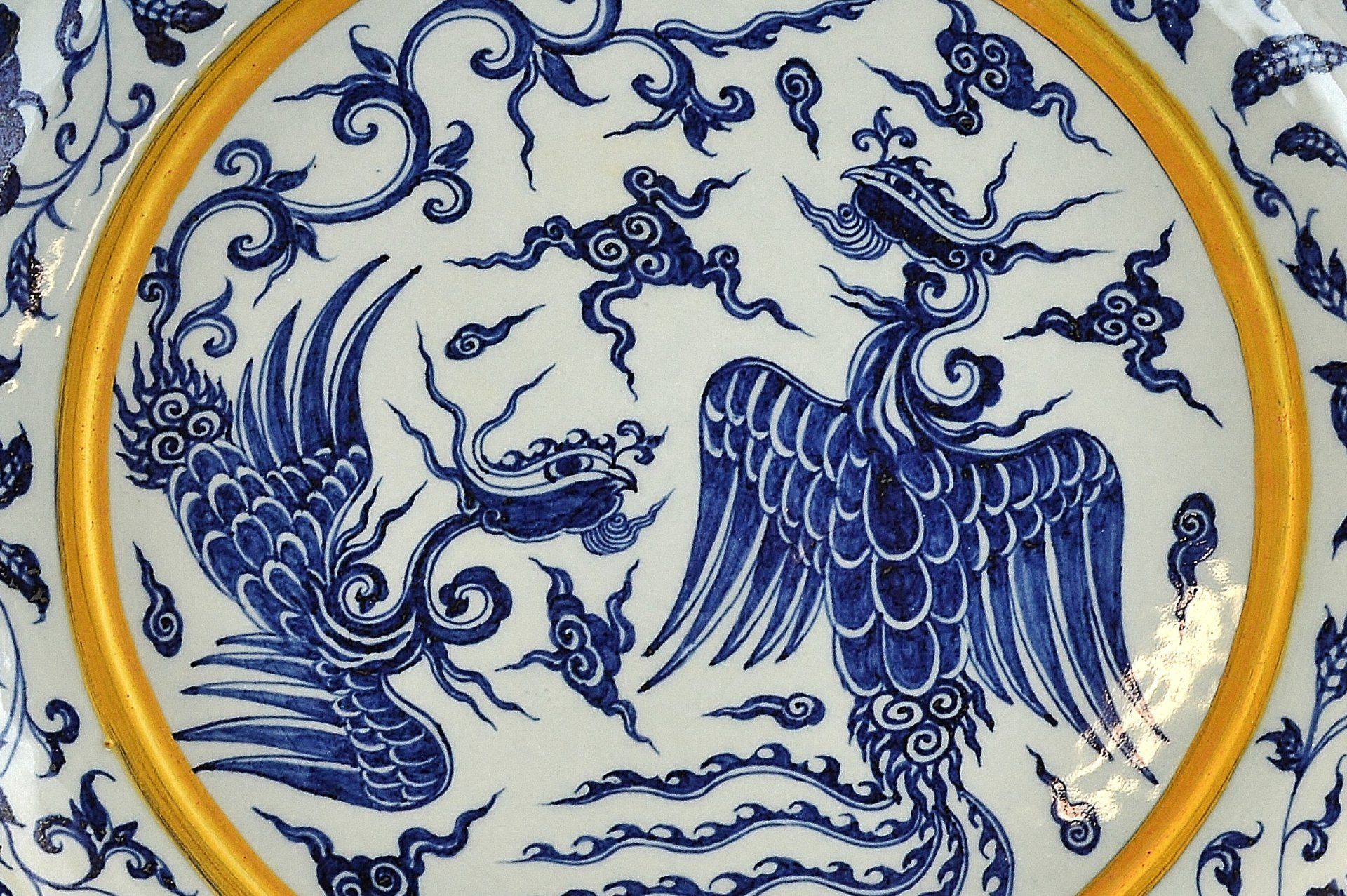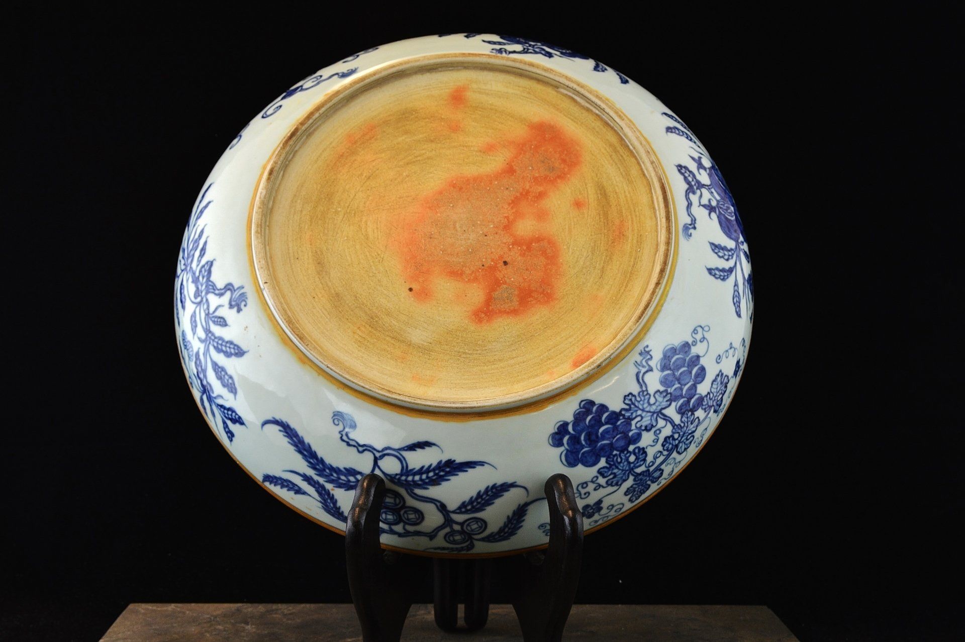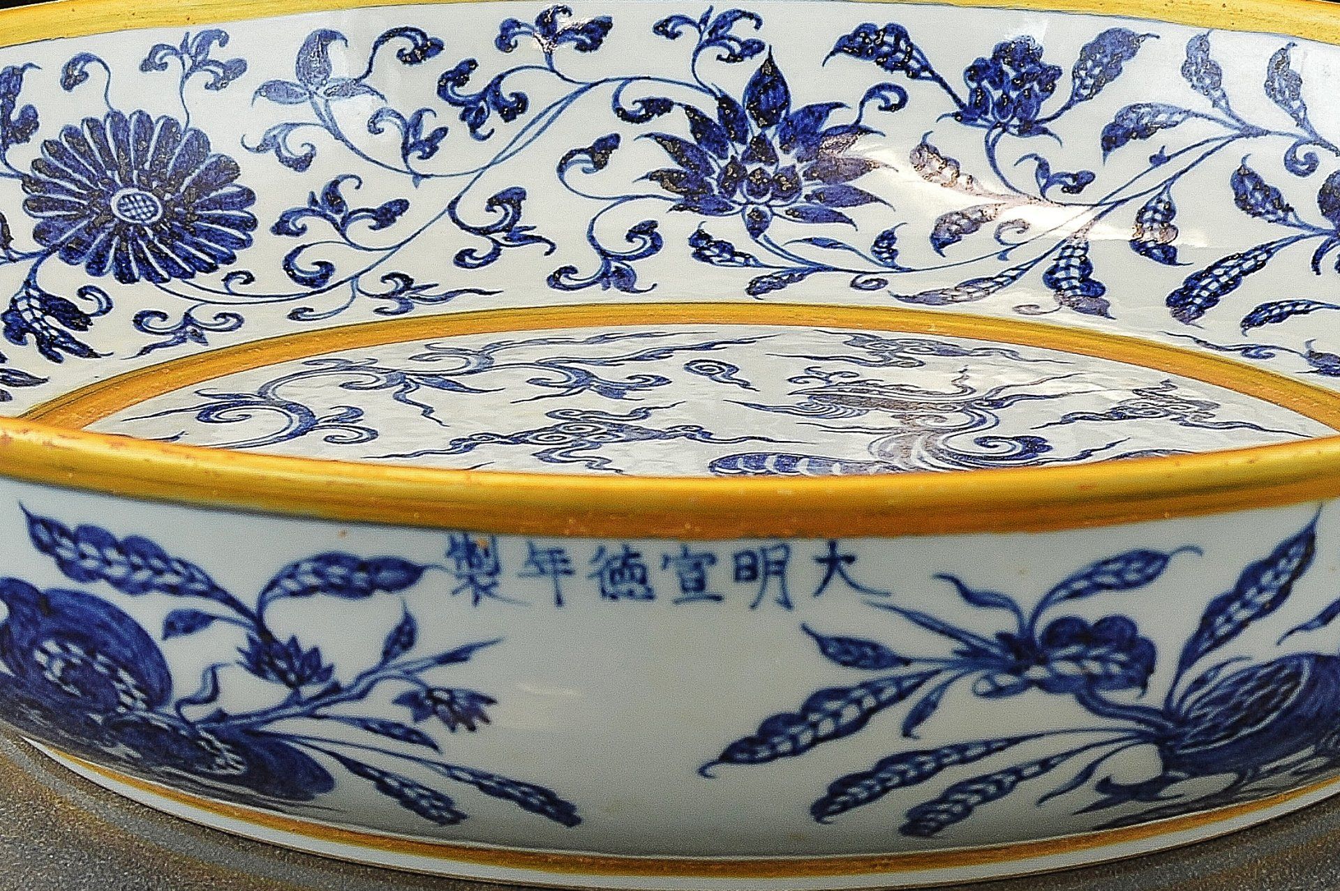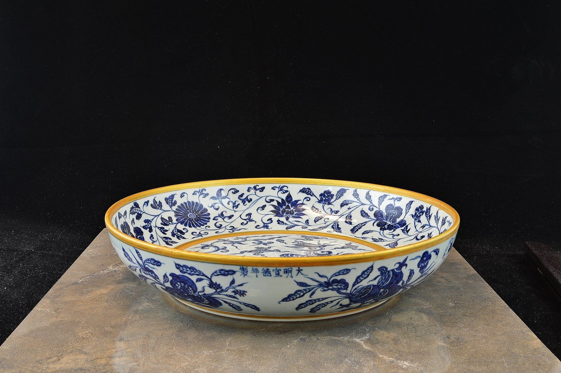 This exquisite 15th Century Ming Dynasty dish, designated with the Xuande mark and period, is elegantly crafted in a blue and white palette. It features a meticulously painted design that includes phoenixes, floral motifs, foliage, and fruit. This remarkable artifact is further enhanced by gilt trim accents, which underscore its artistic value. The dish is embellished with imported Samali blue cobalt, which is noted for its distinctive blackish hue. The unique piling effect on the surface glaze reveals dark spots or a silvery sheen, elements that authenticate the piece and differentiate it from the brown undertones associated with locally produced Chinese cobalt. Such characteristics affirm the dish's historical provenance, as this specific type of cobalt has not been utilized for over five centuries. Furthermore, noticeable flaking in the biscuit layer adds to the dish's historical significance, confirming its age and authenticity. The dish measures approximately 14 1/8 inches in diameter, making it a substantial specimen for collectors and connoisseurs alike. ppjrs