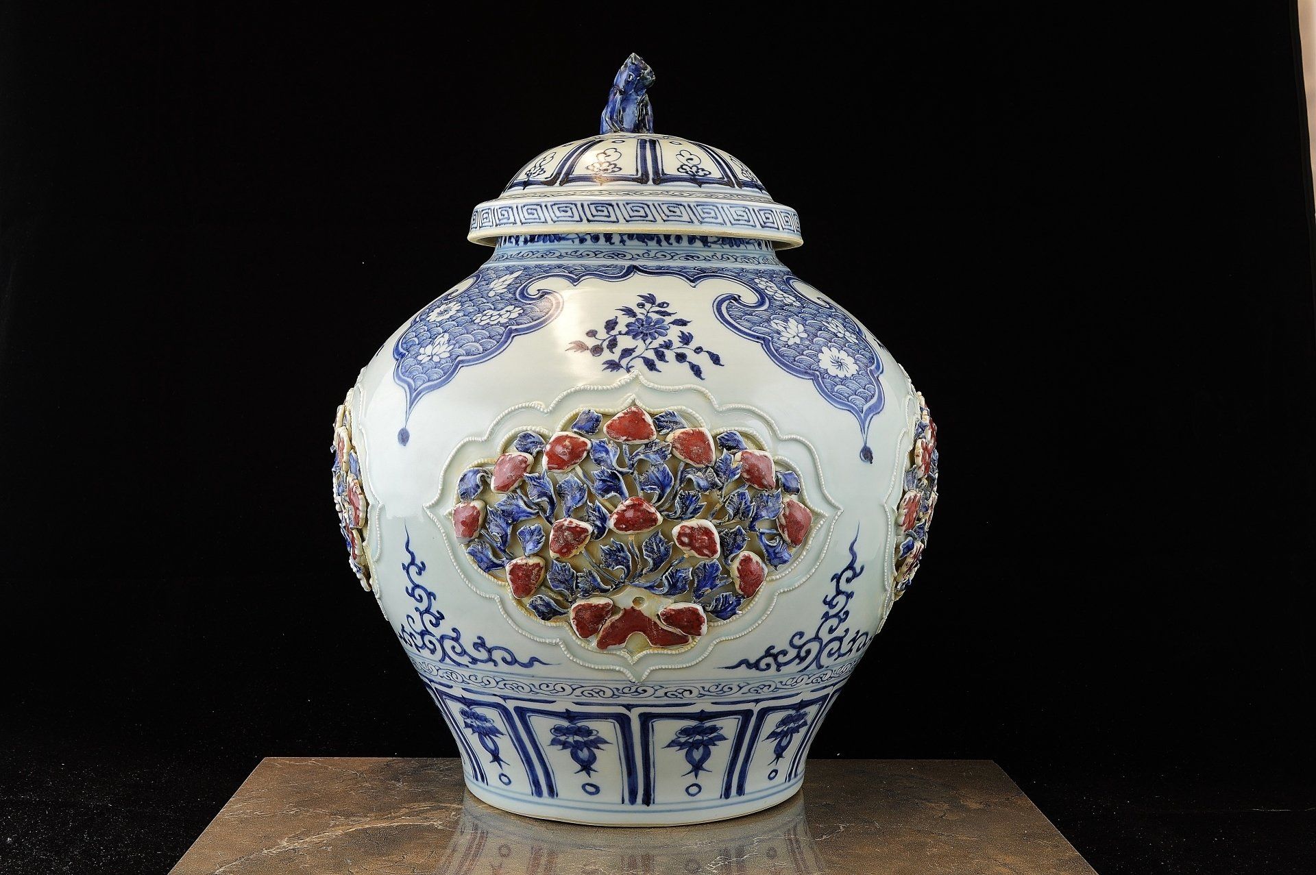 The Blue, White, and Red Yuan Dynasty Jar, adorned with meticulously applied floral and foliage motifs, features a distinctive cat finial. This piece is part of a pair of jars. Crafted with imported samali blue cobalt, the cobalt exhibits a unique blackish hue. The heaping and piling effect present on the glaze surface reveals not brown, indicative of local Chinese cobalt, but rather black spots or a silvery sheen. This characteristic serves as a testament to its provenance, as this particular imported cobalt has not been accessible for over 500 years. Furthermore, the presence of flaking in the biscuit underscores its considerable age. The jar stands at approximately 16 3/4 inches tall. ppjrs