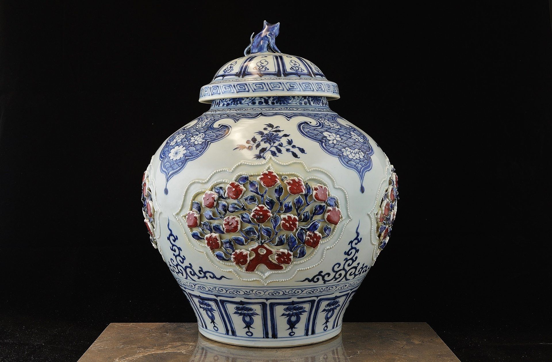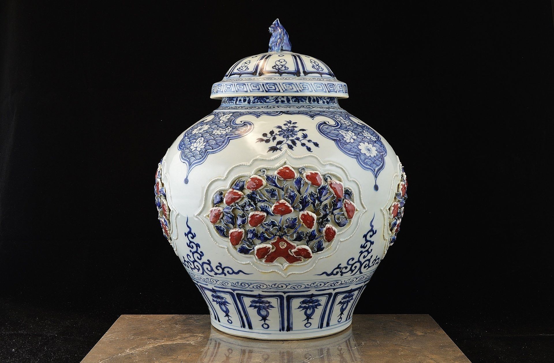 Blue, White, and Red Yuan Dynasty Jar: One of A Pair Featuring Four Panels of Applied Floral and Foliage Designs