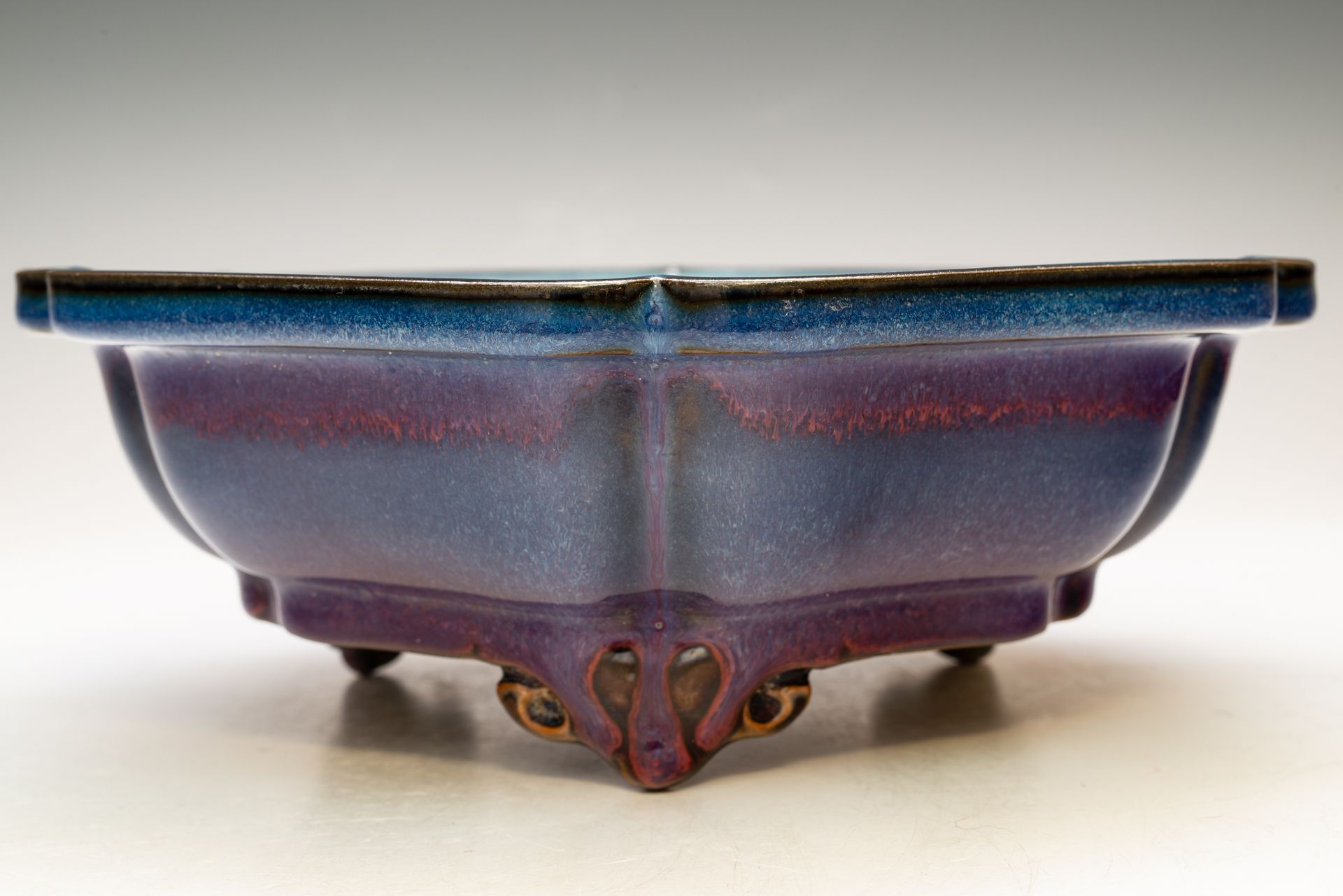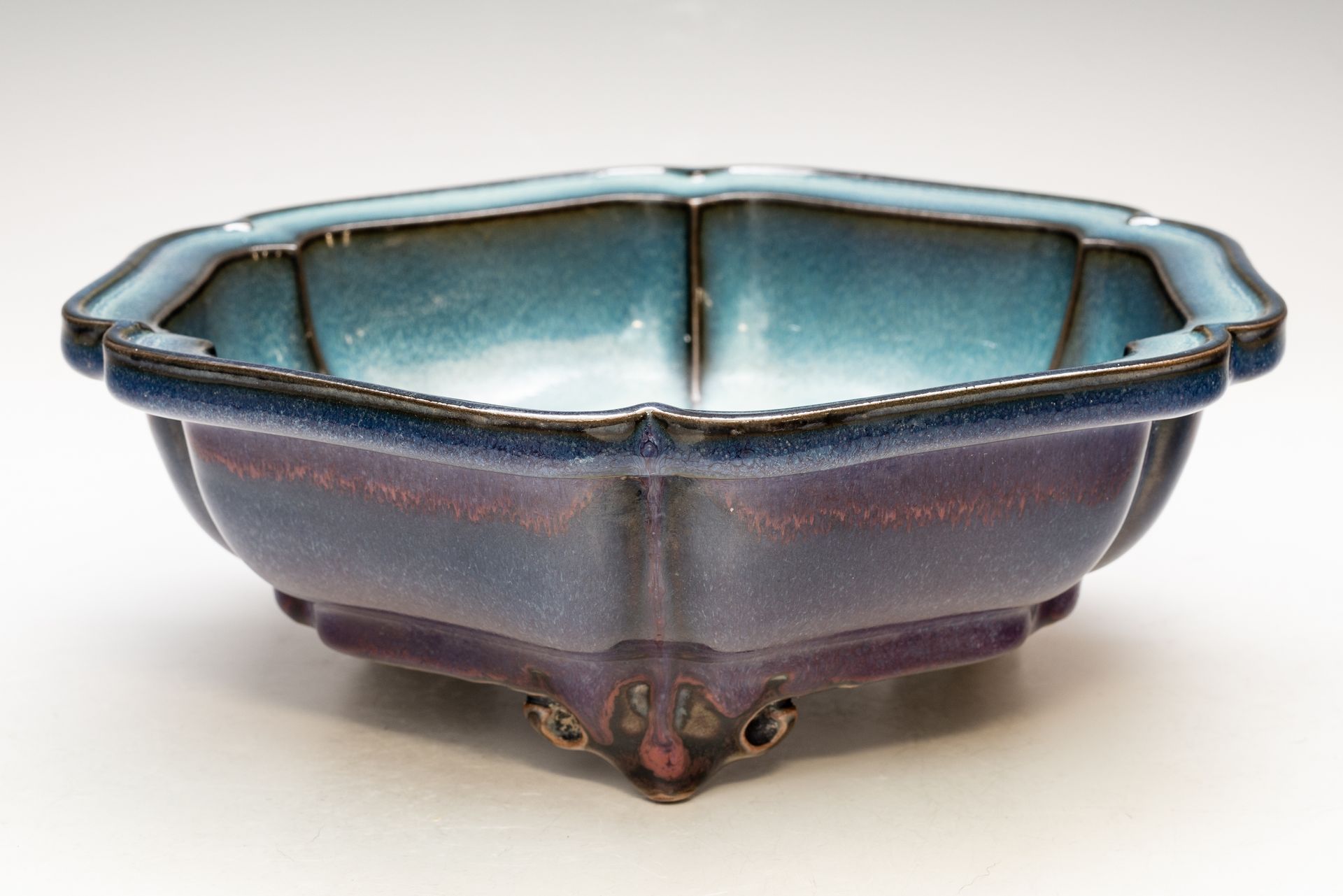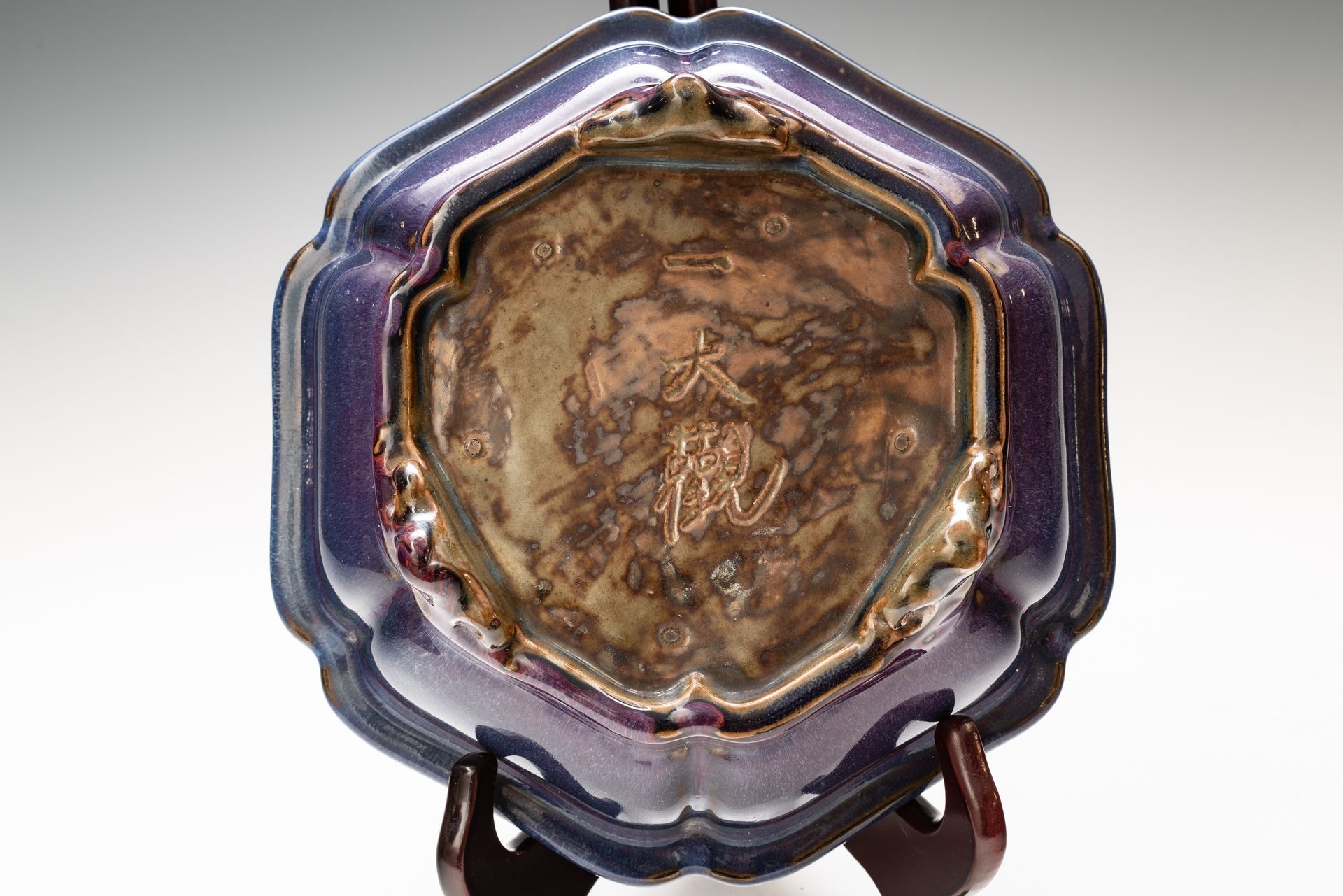This exquisite piece from the Song Dynasty features a Jun octagonal form characterized by a purplish-blue glaze, accented with a reddish area beneath the lip on the exterior. The interior displays a delicate light blue hue, while a dark brown slip has been applied where the glaze thins, including a dark brown rim and edges. Notably, worm tracks are visible on the interior surface. The base is inscribed with two character marks. This vessel measures 9 1/8 inches in diameter. ppjrs