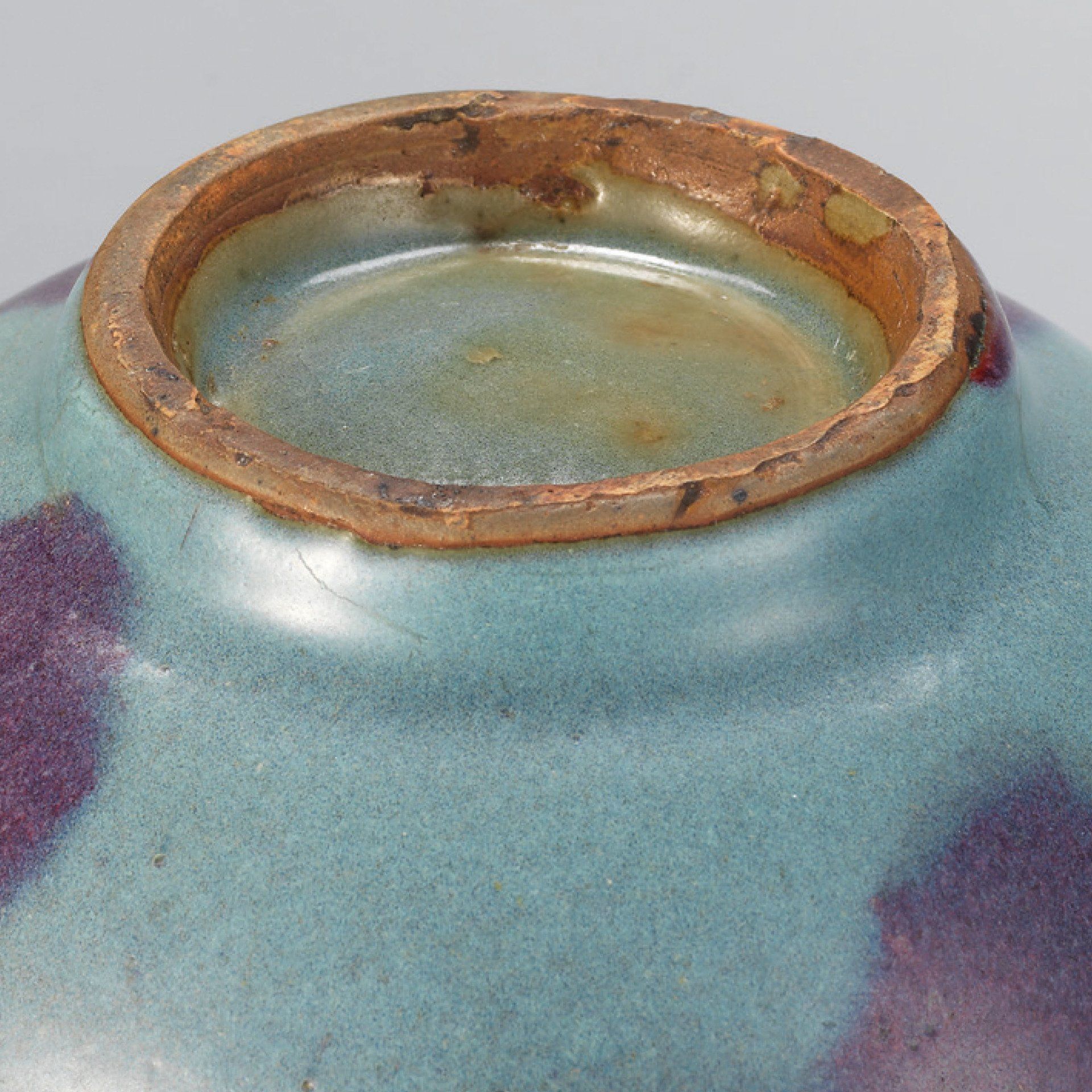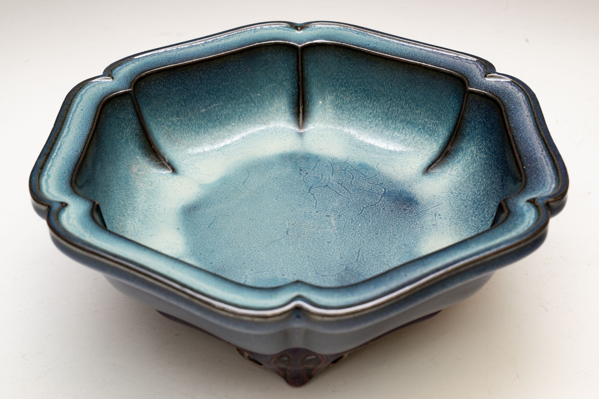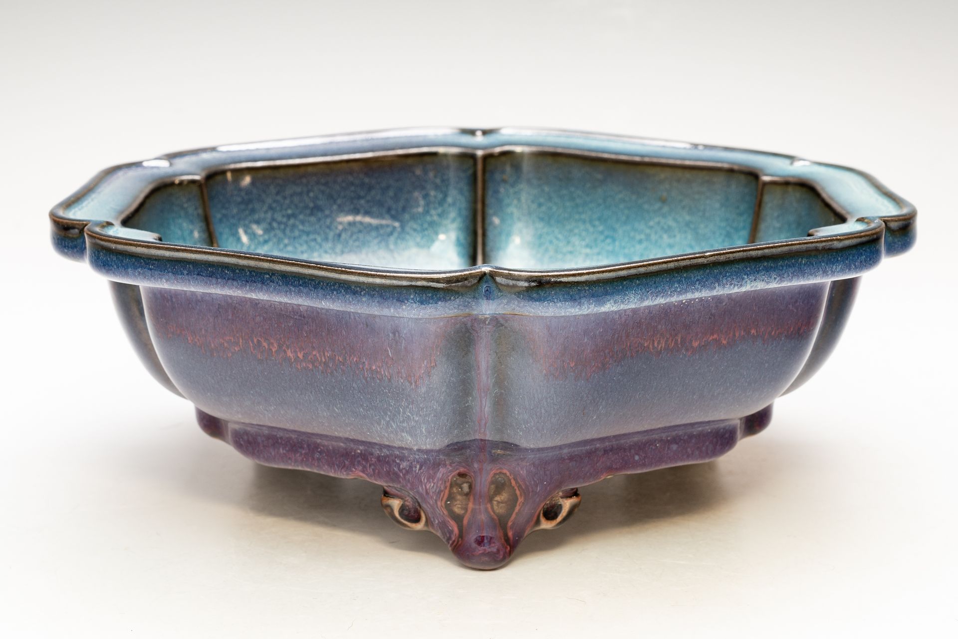 This exquisite piece from the Song Dynasty features a Jun octagonal form characterized by a purplish-blue glaze, accented with a reddish area beneath the lip on the exterior. The interior displays a delicate light blue hue, while a dark brown slip has been applied where the glaze thins, including a dark brown rim and edges. Notably, worm tracks are visible on the interior surface. The base is inscribed with two character marks. This vessel measures 9 1/8 inches in diameter. ppjrs