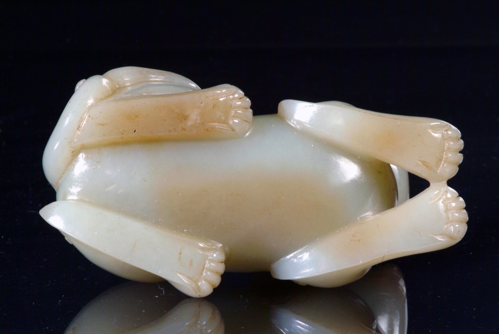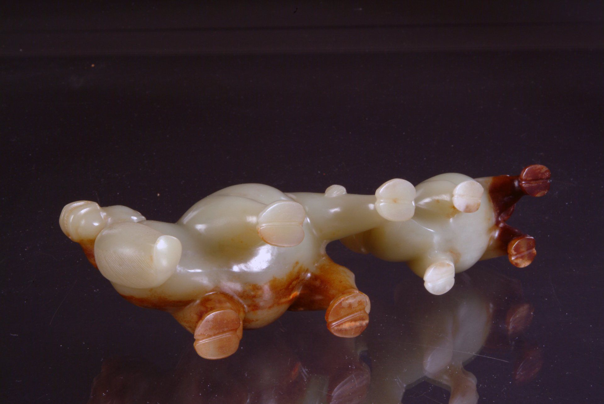 For the discerning Chinese art collector, we present an exceptional white jade carving of a recumbent winged mythical beast. This intricately carved figure displays notable characteristics, including a distinctive triple-puffed tail elegantly arched over its back, along with the depiction of its female genitalia. The meticulous craftsmanship is evident in the fine white jade, which features extensive russet inclusions indicative of its considerable antiquity. This remarkable piece dates back to the Six Dynasties period. The jade carving measures approximately 4 1/8 inches in length.