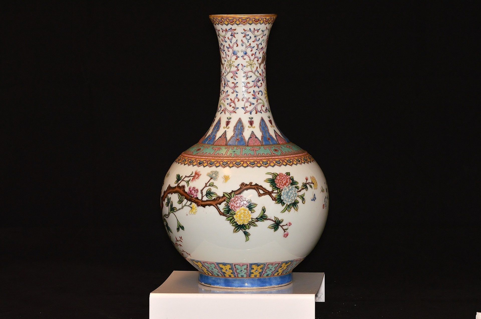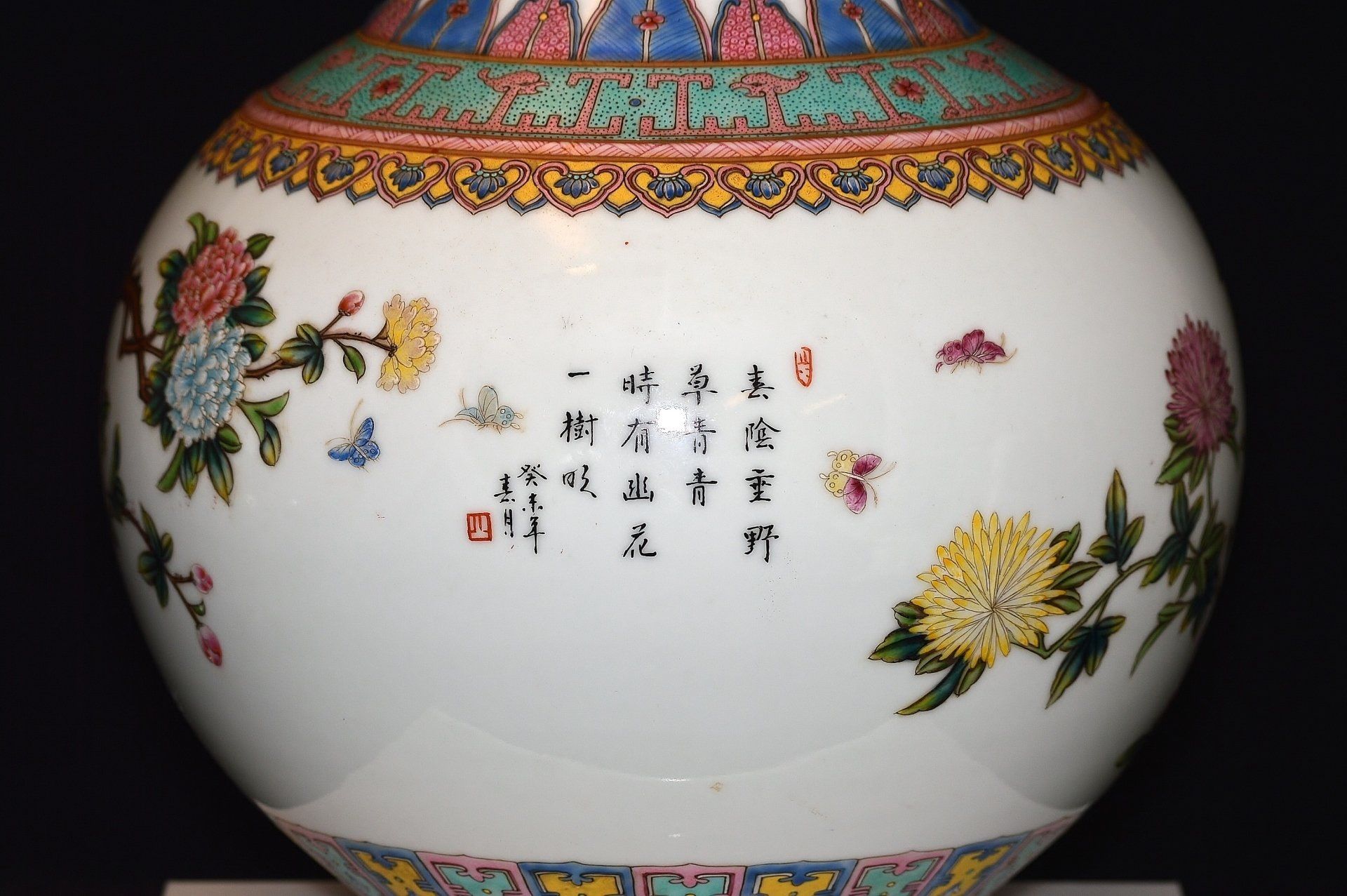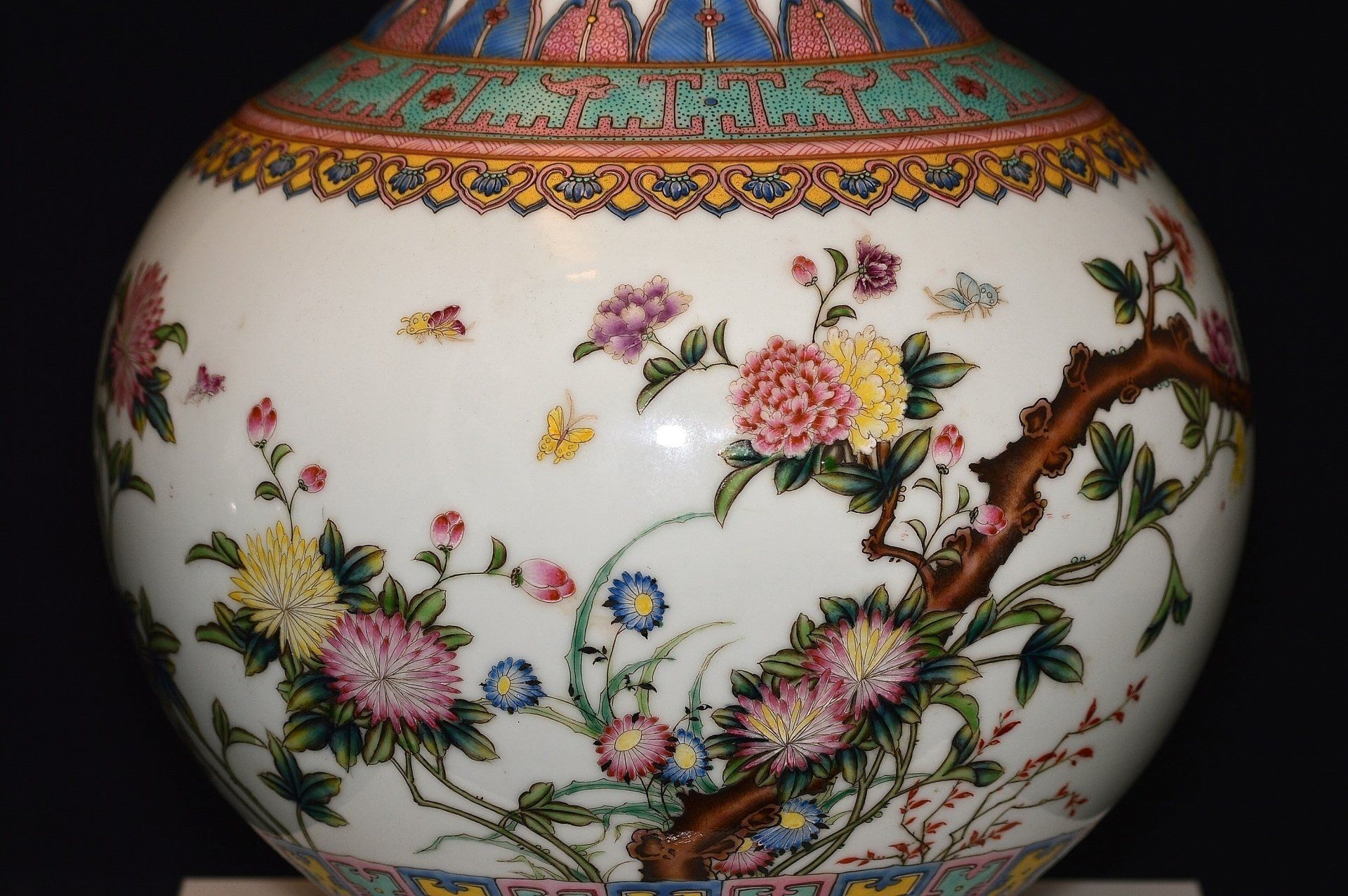 This exquisite piece of Chinese porcelain is a remarkable Fine Art Qing Dynasty Imperial vase, specifically marked and produced during the Qianlong Period, spanning from 1736 to 1795. The craftsmanship displayed in this vase is notable, showcasing multiple bands and layers of intricate decoration that attest to the artist's exceptional skill. The vase features incised elements, while the band encircling the shoulder is adorned with countless meticulously controlled enamel droplets, contributing to its unique visual texture. The foliage, branches, blossoms, and butterflies are rendered with remarkable delicacy. A careful examination—preferably through magnification—of the leaves, flowers, and branches reveals a depth of detail, color vibrancy, and shading that enhance the overall balance and richness of the piece. Collectors must cultivate an understanding of the distinguishing features that elevate a piece from being good to truly exceptional or even a masterpiece. A thorough inspection of many Qing Dynasty artifacts reveals that they were often executed by less skilled artisans, lacking the depth, detail, and balance seen in superior pieces. Attention to detail, color harmony, and shading is crucial for recognizing these differences. The decorations of this vase predominantly utilize fine brushwork, with some details likely rendered using a single hair strand brush. It is noteworthy that there exists a minor firing flaw at the blue base; the blue glaze has contracted slightly, resulting in a couple of small white areas. Additionally, the reverse of the vase features a poem, while the base prominently displays the Qianlong mark, aligned with the center of the primary decoration—a characteristic feature of Imperial Qianlong porcelain. This impressive vase stands at approximately 16 1/8 inches in height, making it a significant addition to any collection.