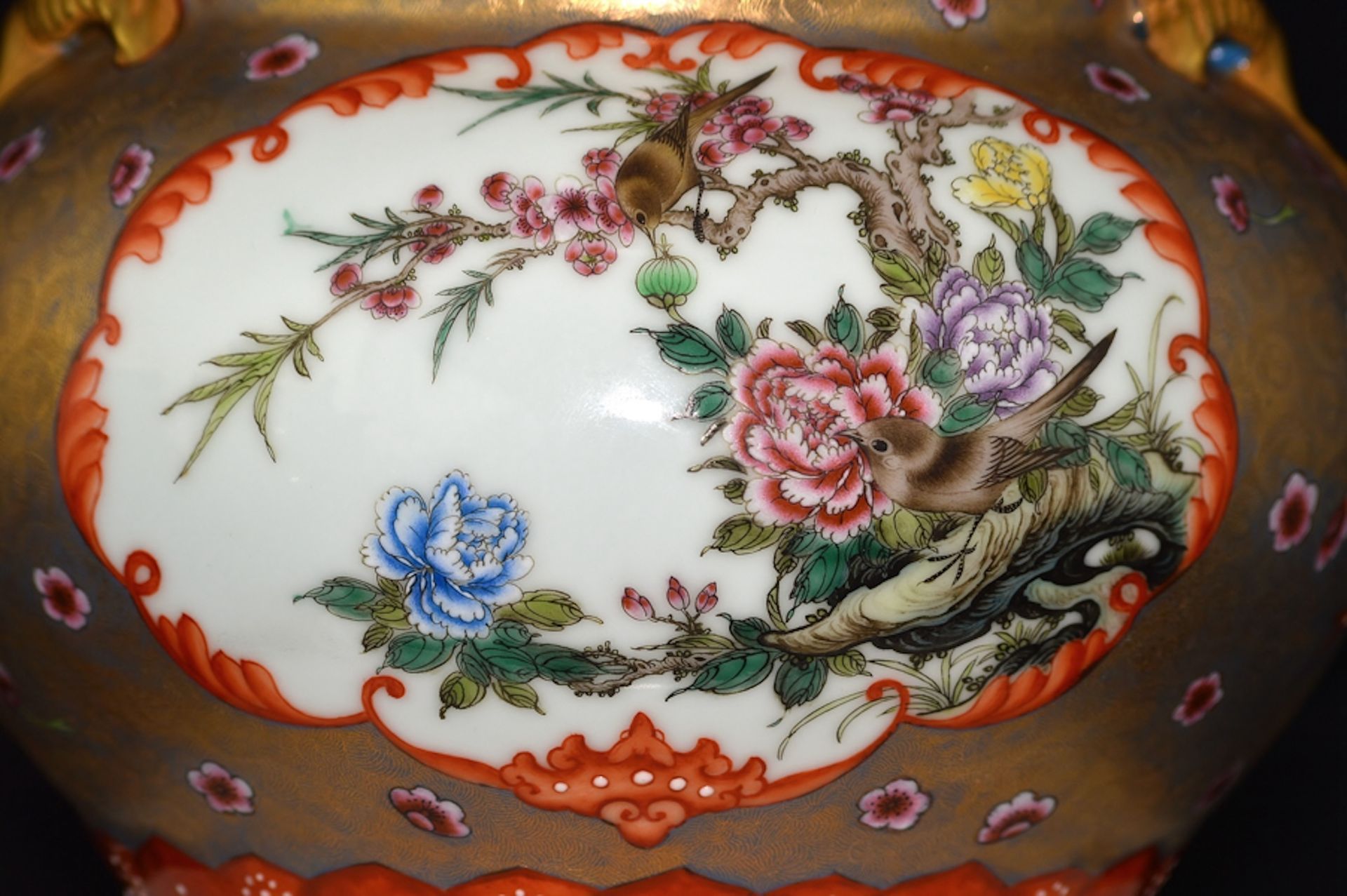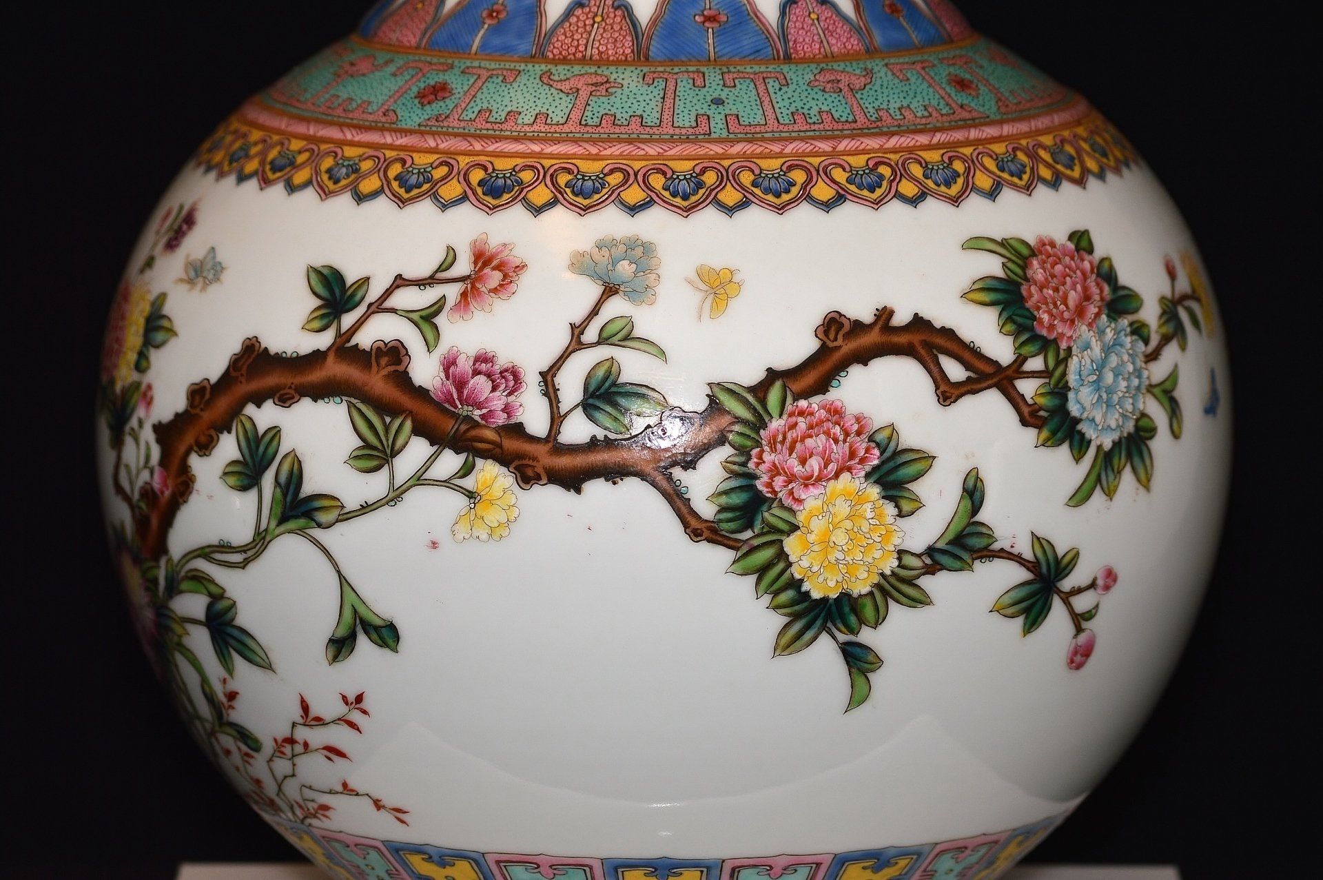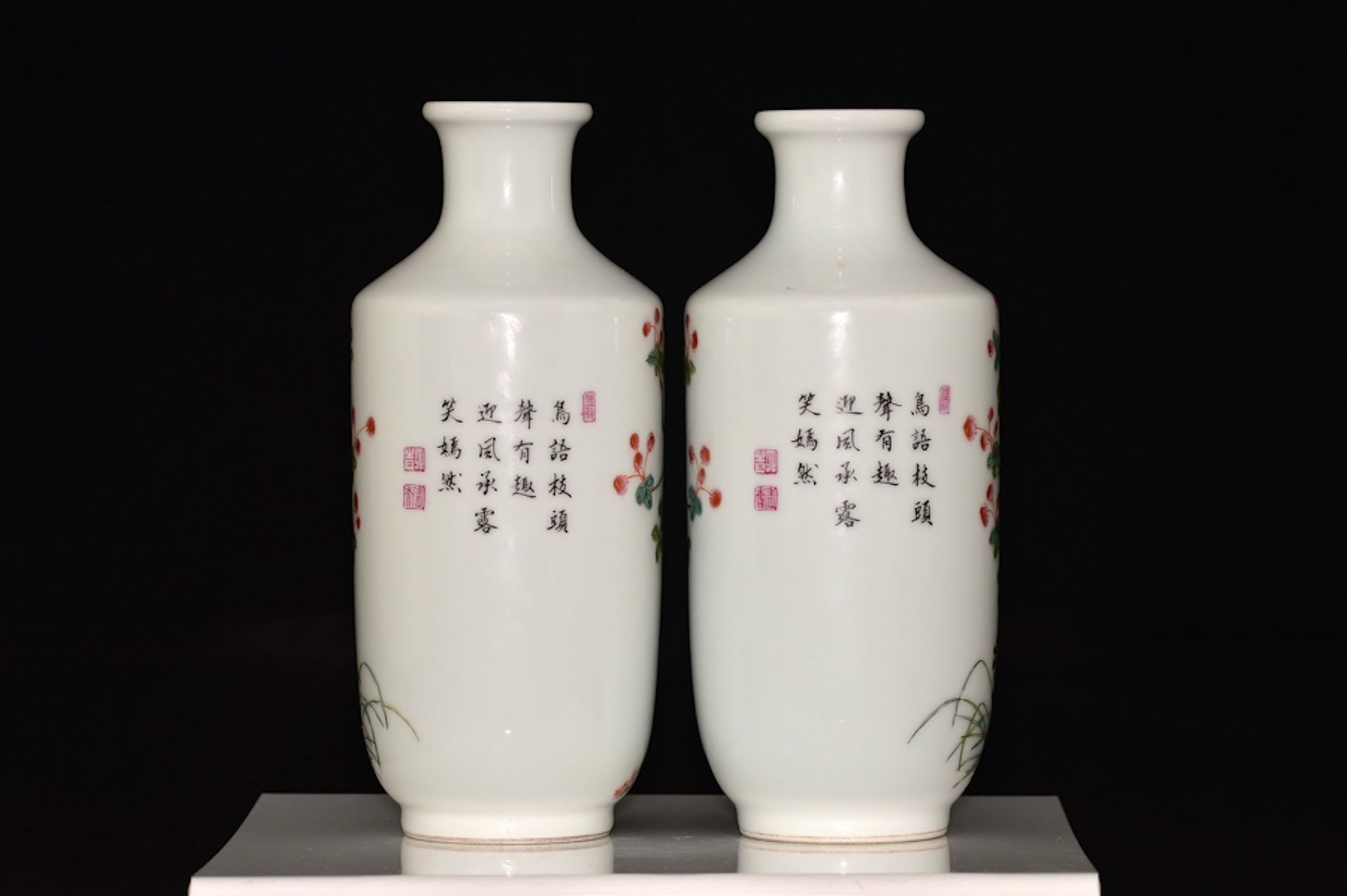 These Exquisite Masterpieces Falangcai Enamels Vases are very thinly potted,and they were decorated in the Forbidden City in Beijing during the Yongzheng period 1723 to 1735. These vases were painted using Falangcai enamels and it is said that the Emperor himself oversaw the manufacture of these wares. It took such skill and control to create these Vases, Look close and you will understand what a true Chinese Ceramic Masterpiece looks like. It's important to look carefully and zoom in on the leaves, flowers, and branches you will see the detail, colors, and shading that gives balance and depth to these Vases. These Vases have flaking in the biscuit which proves they're old. Collectors must learn to recognize the differences of a good piece compared to great piece or masterpieces. Most Qing Pieces if you look close at them you will see and understand they were painted by less skilled artist, they will look flat without balance, detail or depth. Pay attention to the details and color balance and shading this will help you to see and understand the difference. These vases are delicate and decorated with branches, flowering prunus, and birds. The Yongzheng Falangcai color palette is distinct, making these wares easy to distinguish with the powdery soft colors that really shows in the pinks. On the reverse there is a inscribed poem with three seals. The Yongzheng four character mark in blue enamel in double squares on the base was added by the Beijing decorators. This pair of vases are not exact copies of each other which is typical on Yongzheng wares. The Birds on these vases are so finely done the feathers took well over a thousand tiny strokes using a single hair brush to create their bodies this can only be seen using a loop. Zoom in on the photos and you'll be able to see the tiny strokes on the Birds, and there bodies are only about 1/2" wide. The artist skill and control is incredible. The quality of these wares are magnificent, check your auction catalogs, books, museums, and see if you find a better pair of Yongzheng falangcai vases published anywhere. This pair of Vases