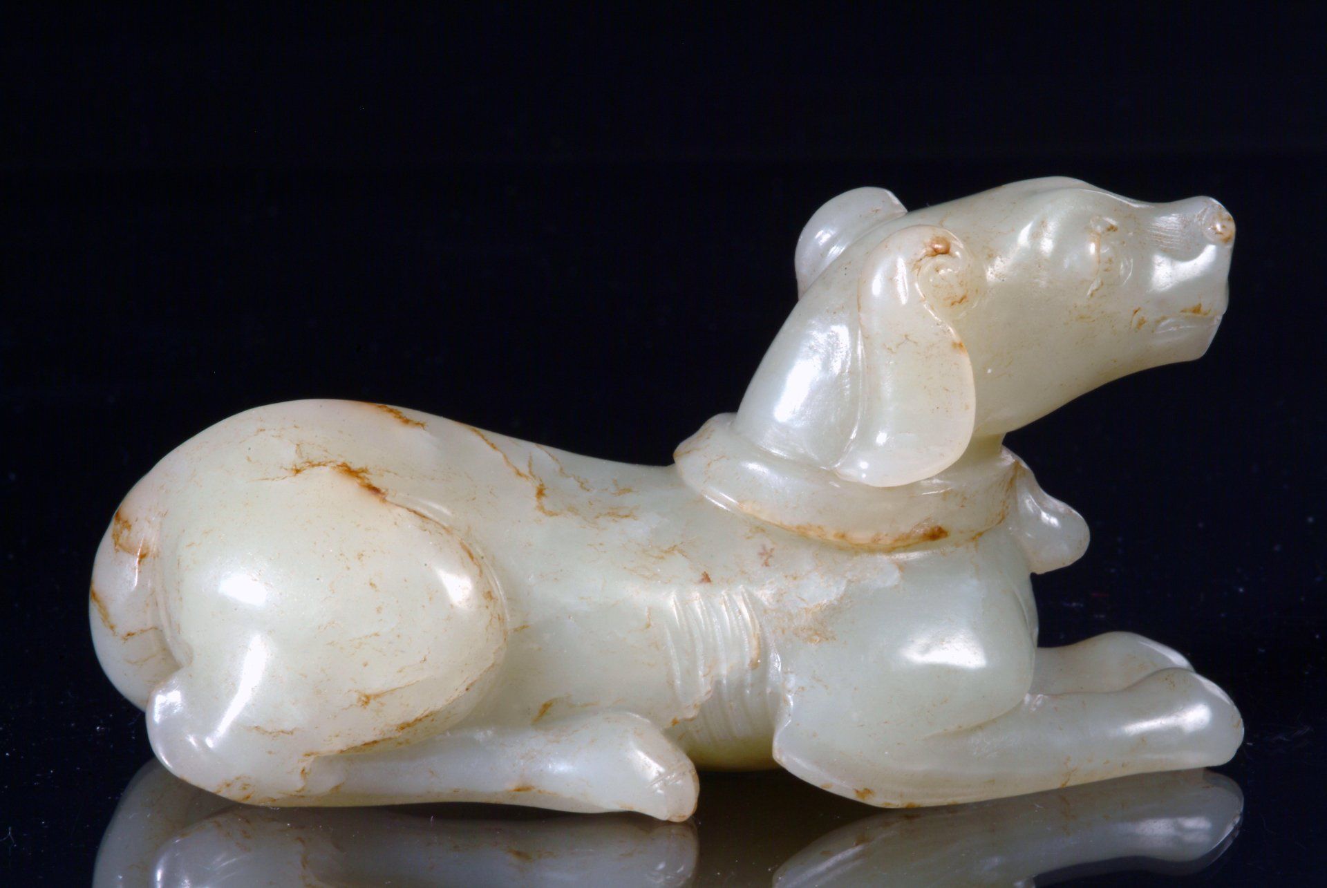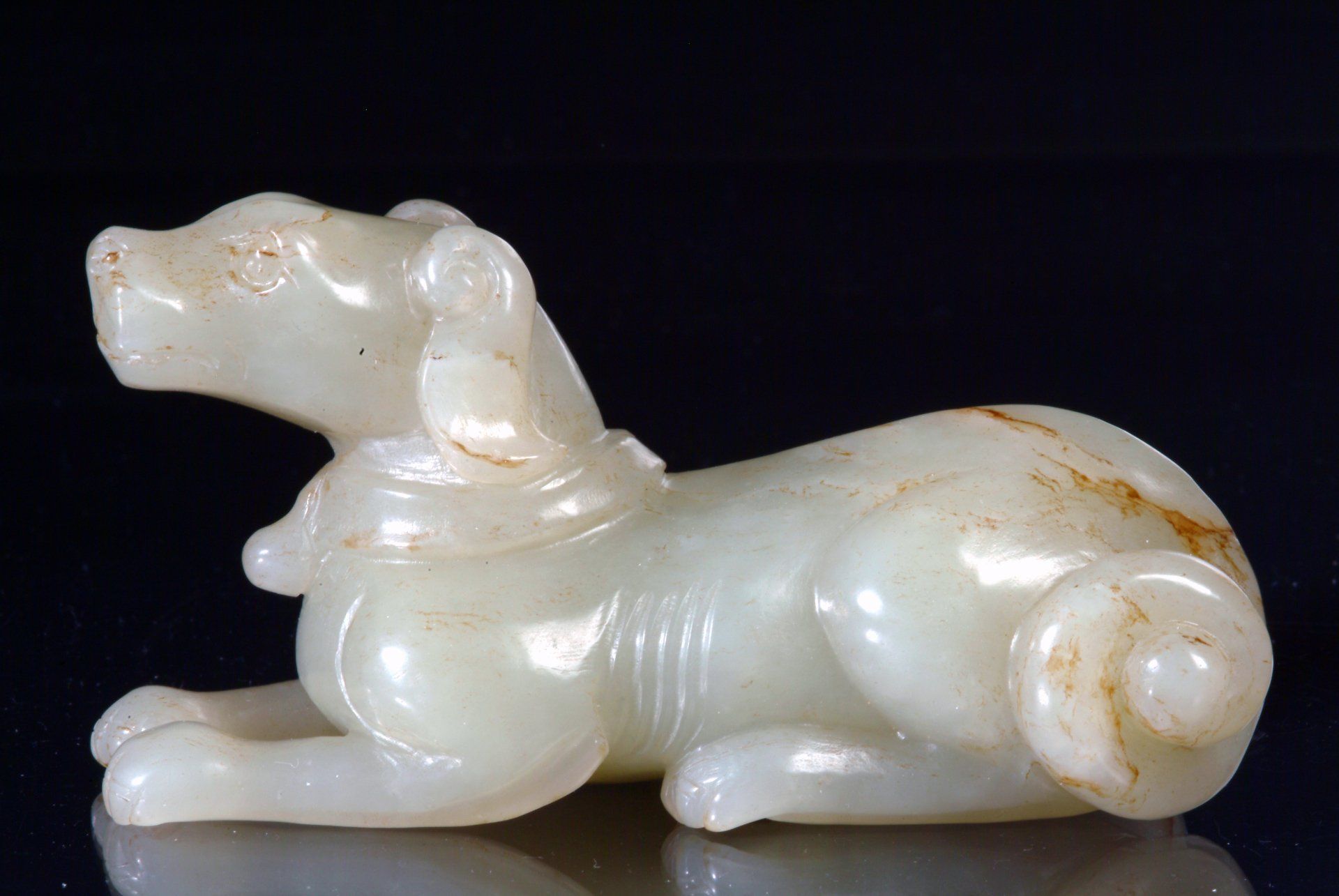 The finely crafted recumbent hound statue, dating from the Song Dynasty, is rendered in grayish-white jade characterized by russet veins and clouding inclusions. The distinctive carving style attests to its historical authenticity. The statue measures approximately 3 ½ inches in length.