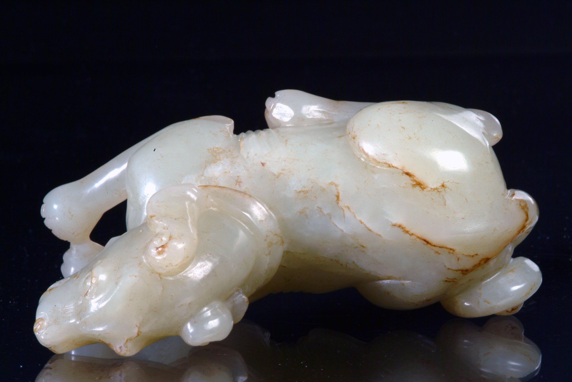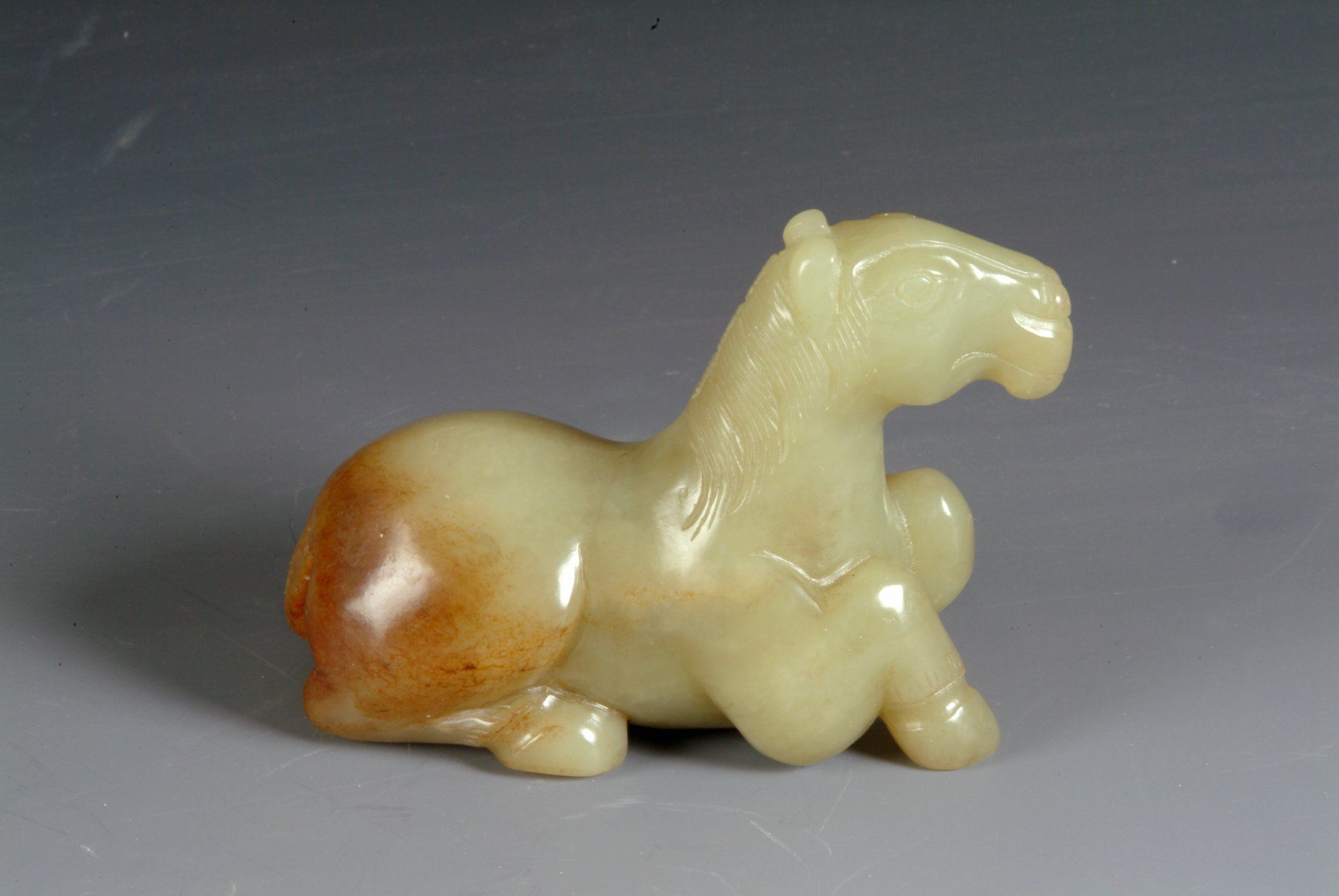 Yuan Dynasty Yellow / Celadon Jade Statue of a Resting Horse with Raised Leg