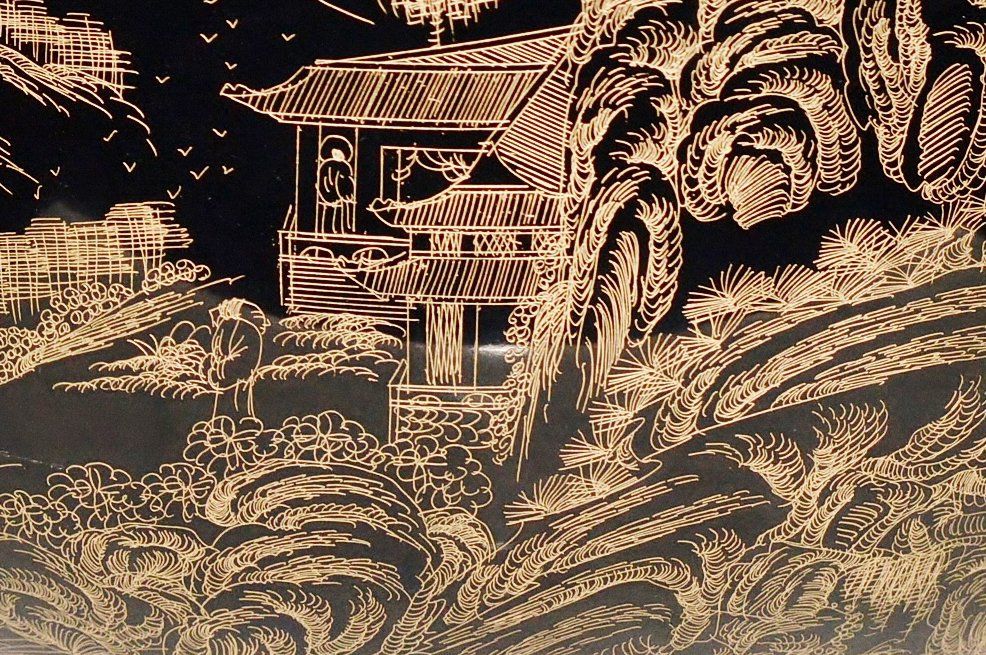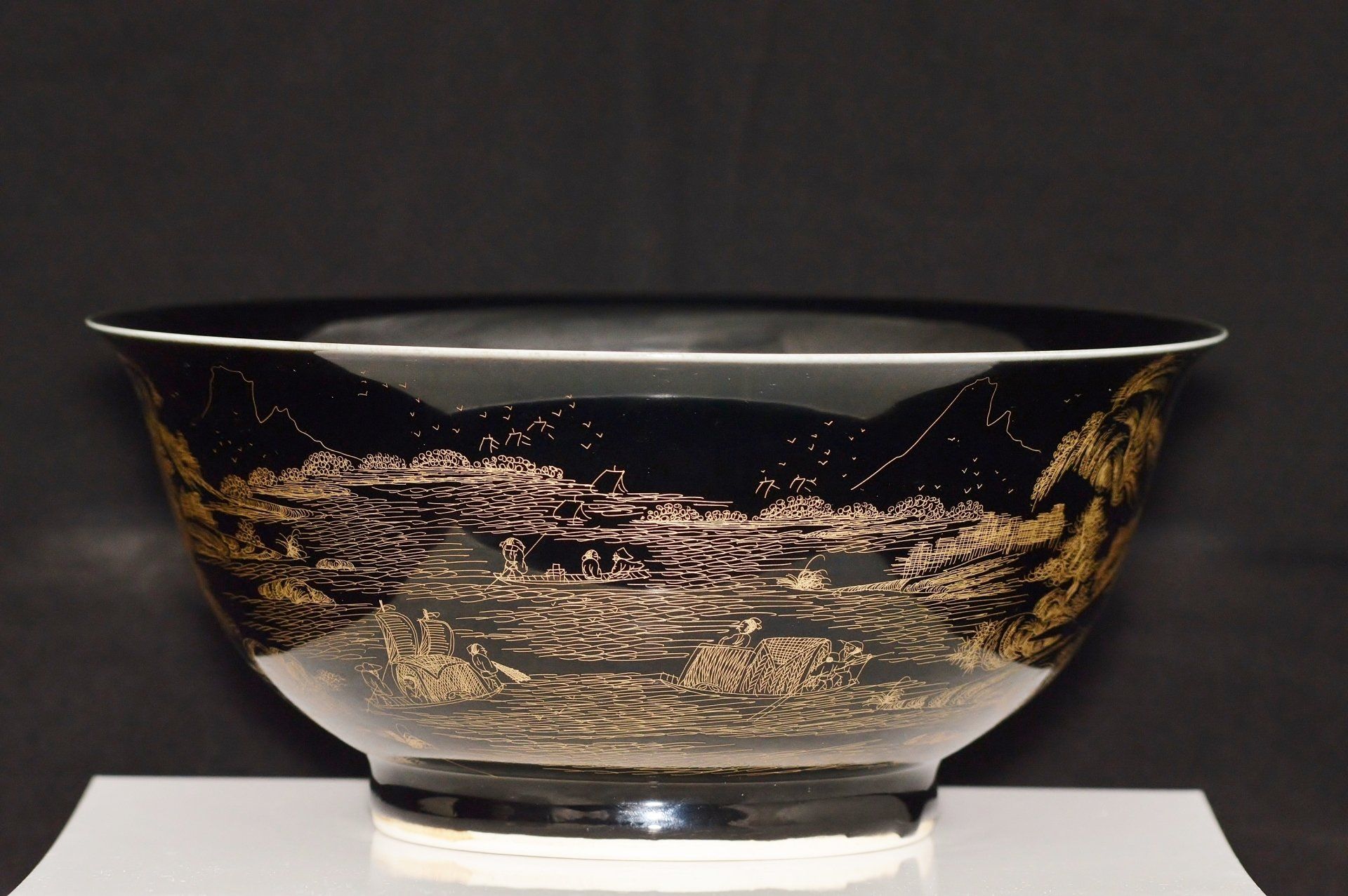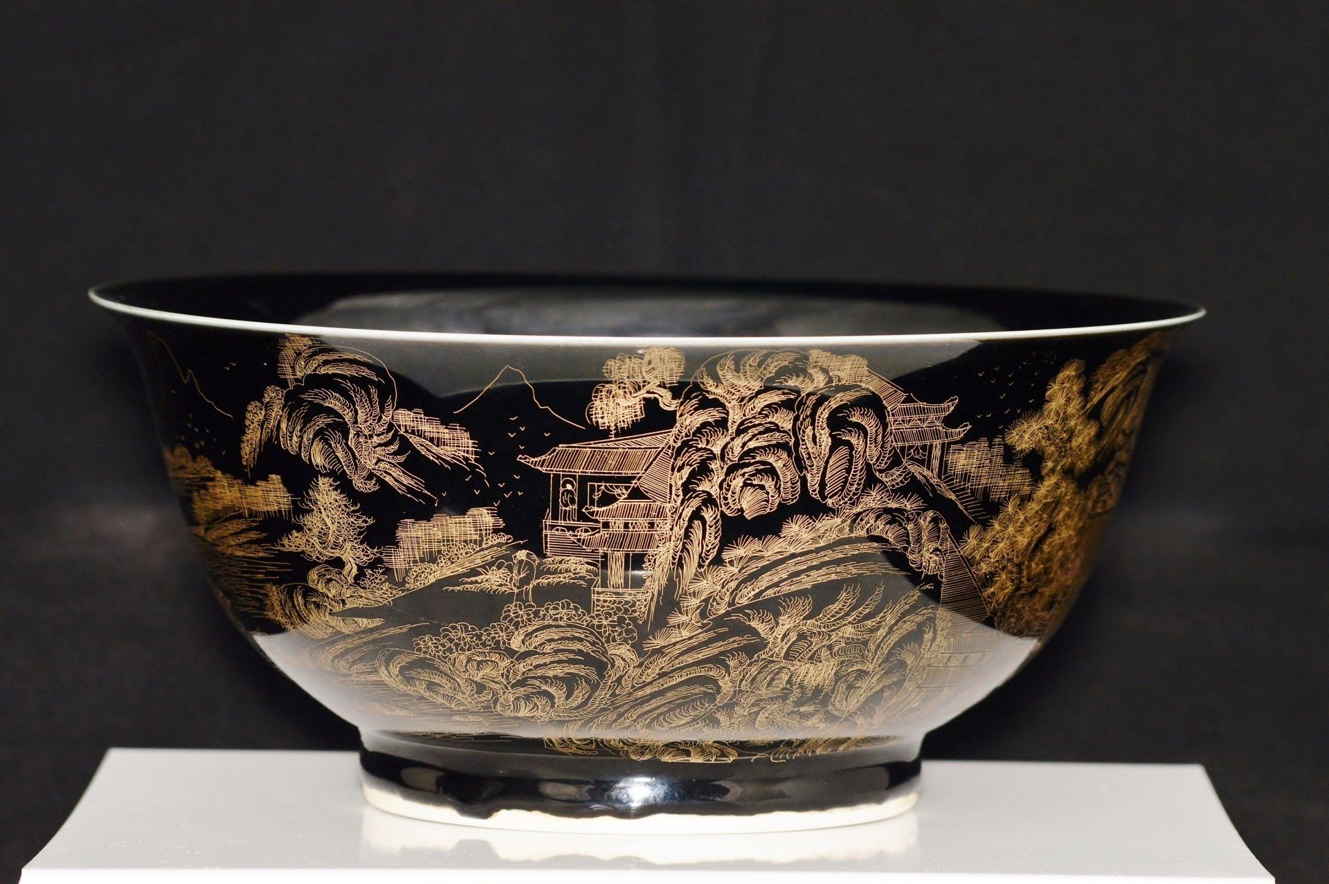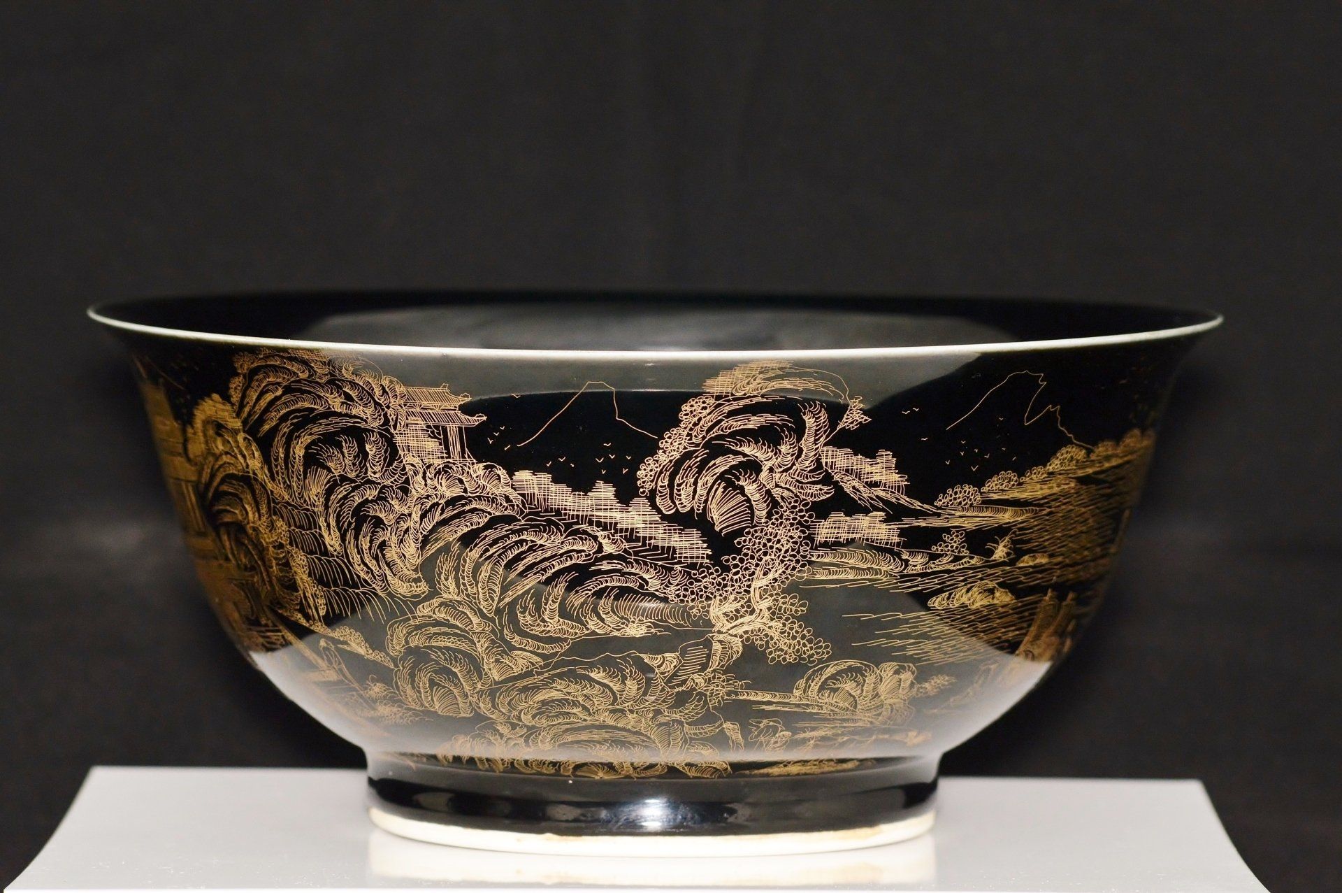 This exceptionally refined Imperial Qianlong marked and period Mirror Black Glazed Bowl, dating from 1736 to 1795, features intricately incised architectural and landscape decorations, which are meticulously highlighted with gold. This piece represents the most outstanding example of its kind currently available on the open market. We encourage you to consult various auction catalogs and reference materials to identify any comparable black glazed items; it is likely you will find none that match this masterpiece. Each incised line is executed with remarkable precision, nearly as fine as a human hair. The true artistry of this bowl cannot be fully appreciated through photographs; it must be experienced in person to grasp the extraordinary skill and control required for its creation. The form of the bowl is exquisite, and one can observe the glaze delicately thinning at the rim, revealing the underlying white biscuit. Aspiring collectors should educate themselves on differentiating between quality pieces and exceptional masterpieces. A closer examination of many Qing Dynasty artifacts often reveals that they were crafted by less proficient artisans, resulting in a lack of balance, detail, and depth. Attention to detail, color balance, and shading is essential for appreciating these nuances. The Qianlong seal mark is aligned with the front of the bowl, a customary practice of the Qianlong period, which is widely acknowledged as the zenith of Chinese porcelain artistry. This bowl measures approximately 9 3/16 inches in diameter.