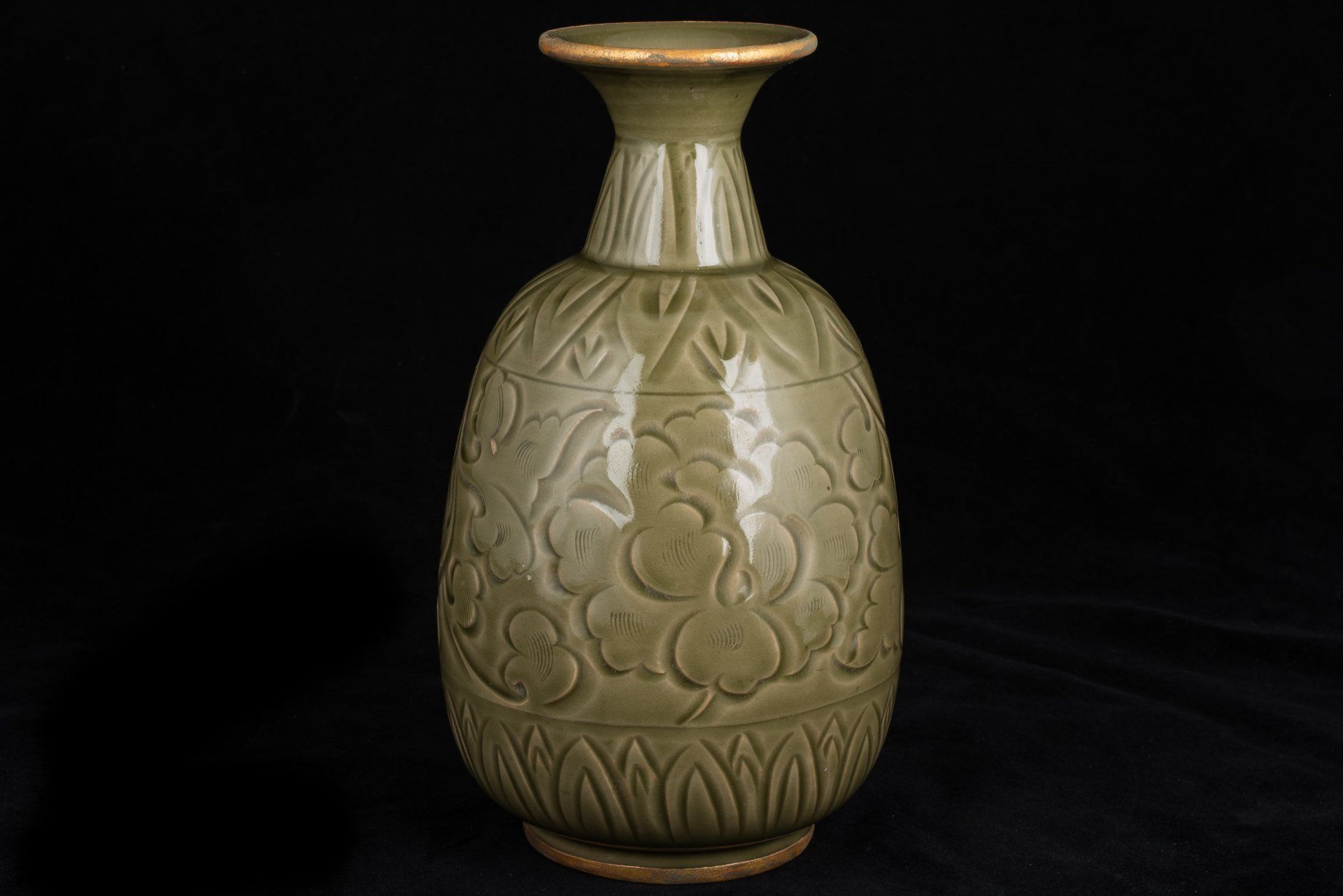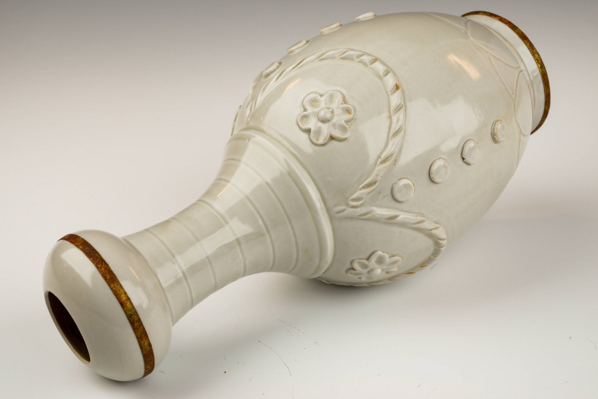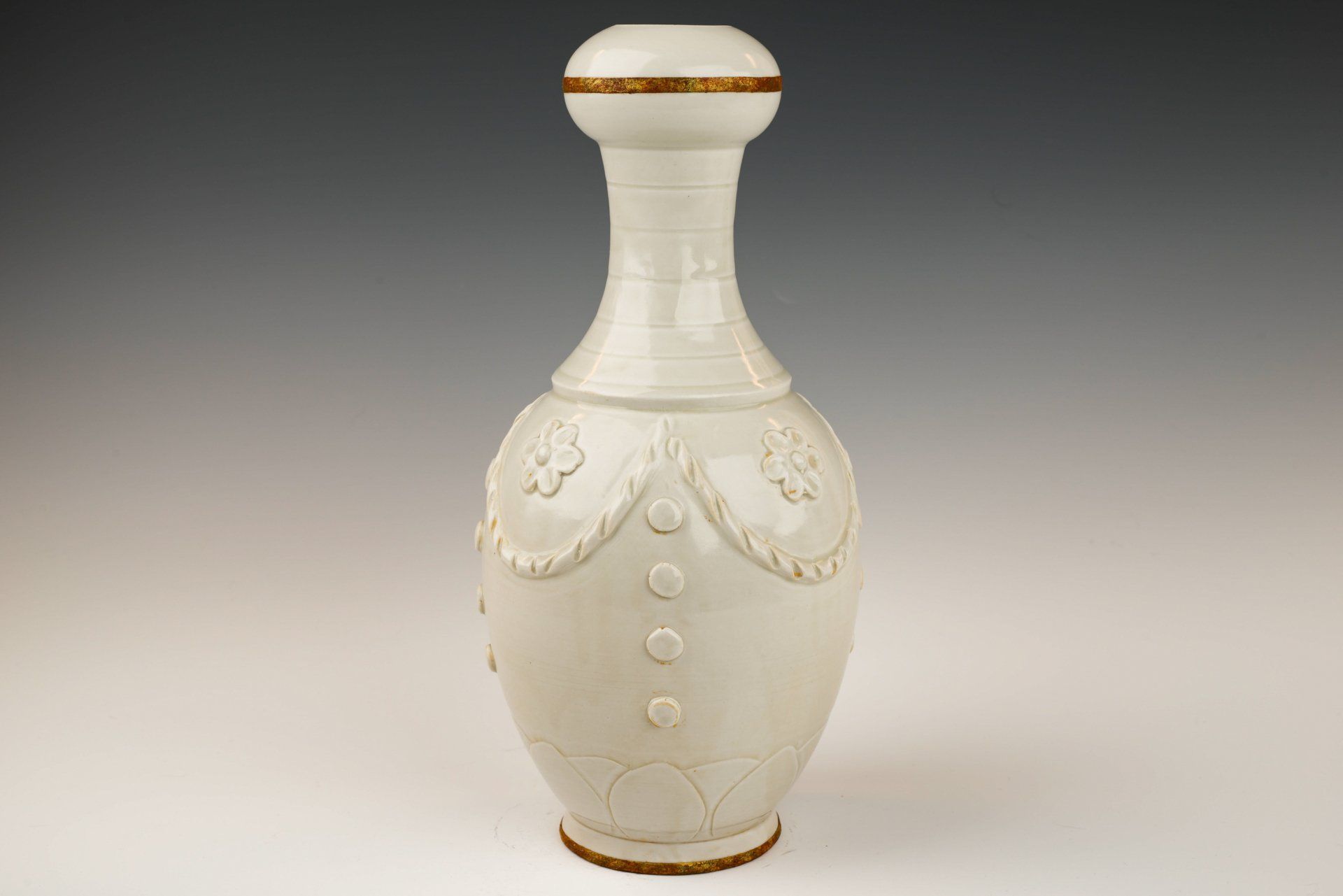 This exquisite specimen of Chinese ancient fine art is an Imperial vase from the Northern Song Dynasty, specifically characterized by its distinguished Ding kiln white ware. The vase showcases an intricate design featuring lotus leaves encircling the foot, draped cord buttons, and floral motifs adorning its body. Notably, it possesses a bowstring neck and a saucer-shaped head. The vase is finished with an ivory-colored transparent glaze that covers an off-white body, exhibiting distinctive tear streaks within the glaze. A hallmark of authenticity, the fire-gilded bands encircling the head and base display a porous nature, adorned with reddish cuprite and greenish botryoidal malachite corrosion, which has developed through the porous surface of the gilt. This corrosion serves as a testament to the vase's age and integrity, providing a more trustworthy means of authentication than thermoluminescence (TL) testing, a view upheld by experts in the field of ancient Chinese artifacts. While the vase is unmarked, its elaborate features suggest that it may be a tribute piece due to the presence of the fire-gilded band. The dimensions of the vase are approximately 11.5 inches in height. ppjrs