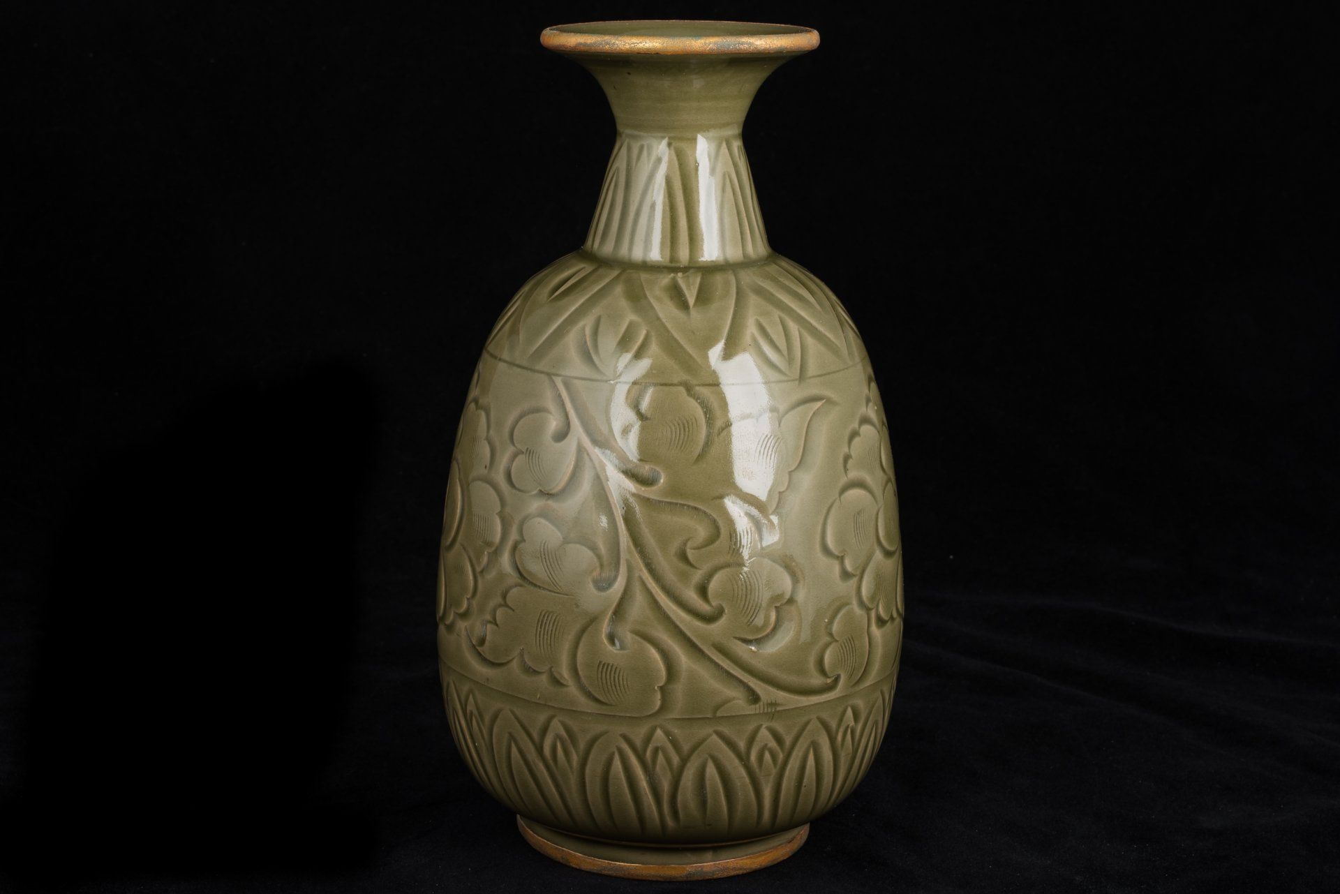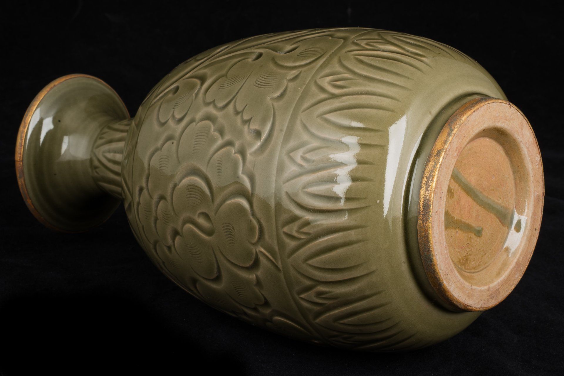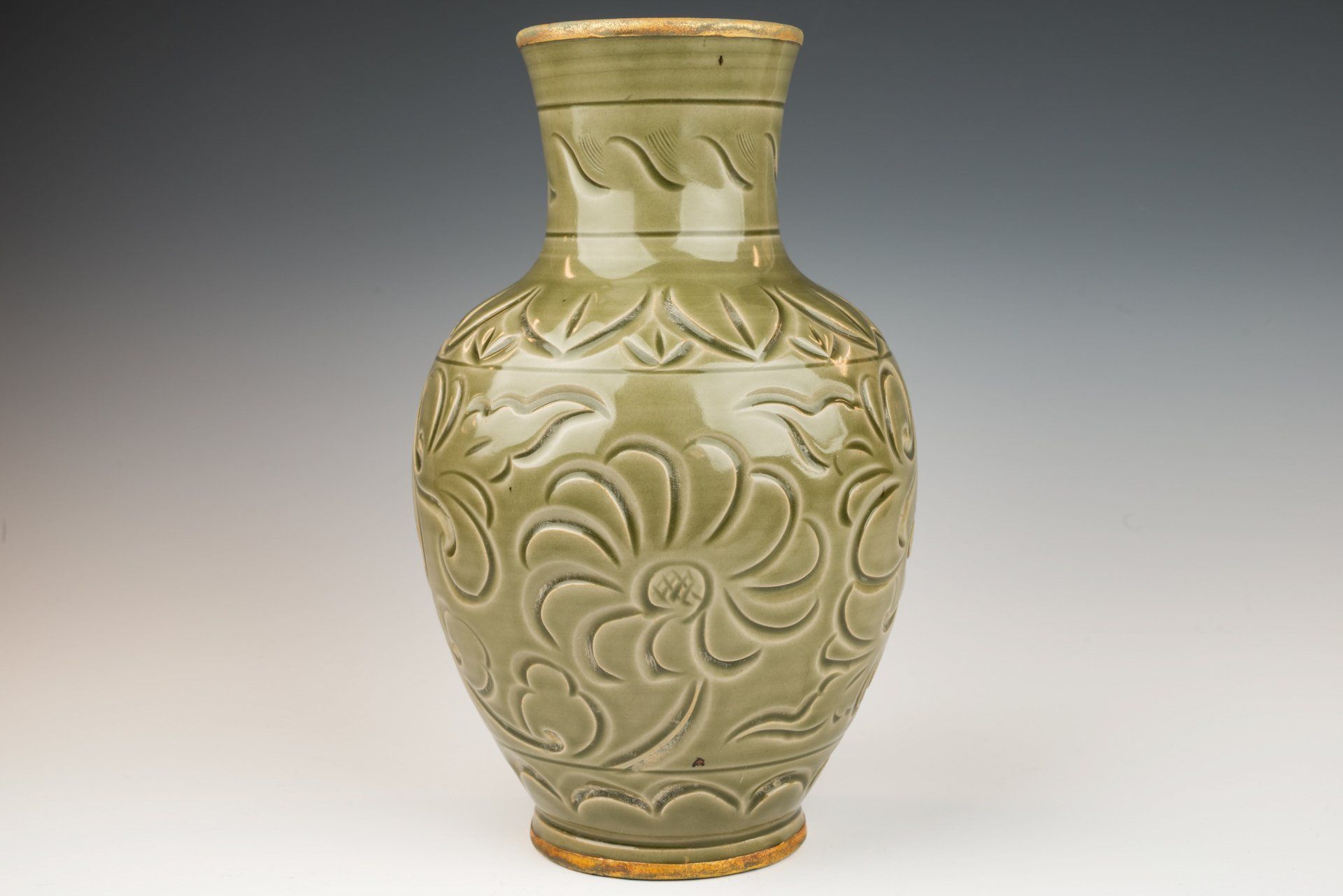 This exquisite specimen of Chinese ancient fine art is an Imperial vase from the Northern Song Dynasty, specifically characterized by its distinguished Ding kiln white ware. The vase showcases an intricate design featuring lotus leaves encircling the foot, draped cord buttons, and floral motifs adorning its body. Notably, it possesses a bowstring neck and a saucer-shaped head. The vase is finished with an ivory-colored transparent glaze that covers an off-white body, exhibiting distinctive tear streaks within the glaze. A hallmark of authenticity, the fire-gilded bands encircling the head and base display a porous nature, adorned with reddish cuprite and greenish botryoidal malachite corrosion, which has developed through the porous surface of the gilt. This corrosion serves as a testament to the vase's age and integrity, providing a more trustworthy means of authentication than thermoluminescence (TL) testing, a view upheld by experts in the field of ancient Chinese artifacts. While the vase is unmarked, its elaborate features suggest that it may be a tribute piece due to the presence of the fire-gilded band. The dimensions of the vase are approximately 11.5 inches in height. ppjrs