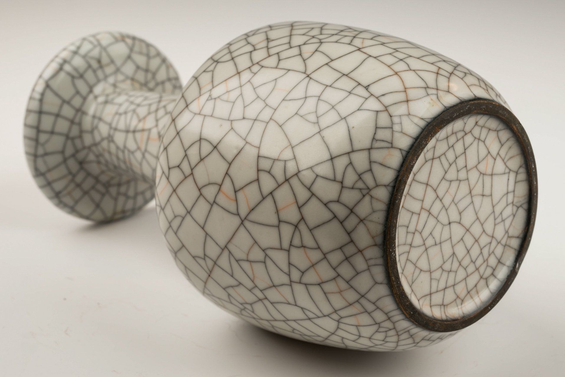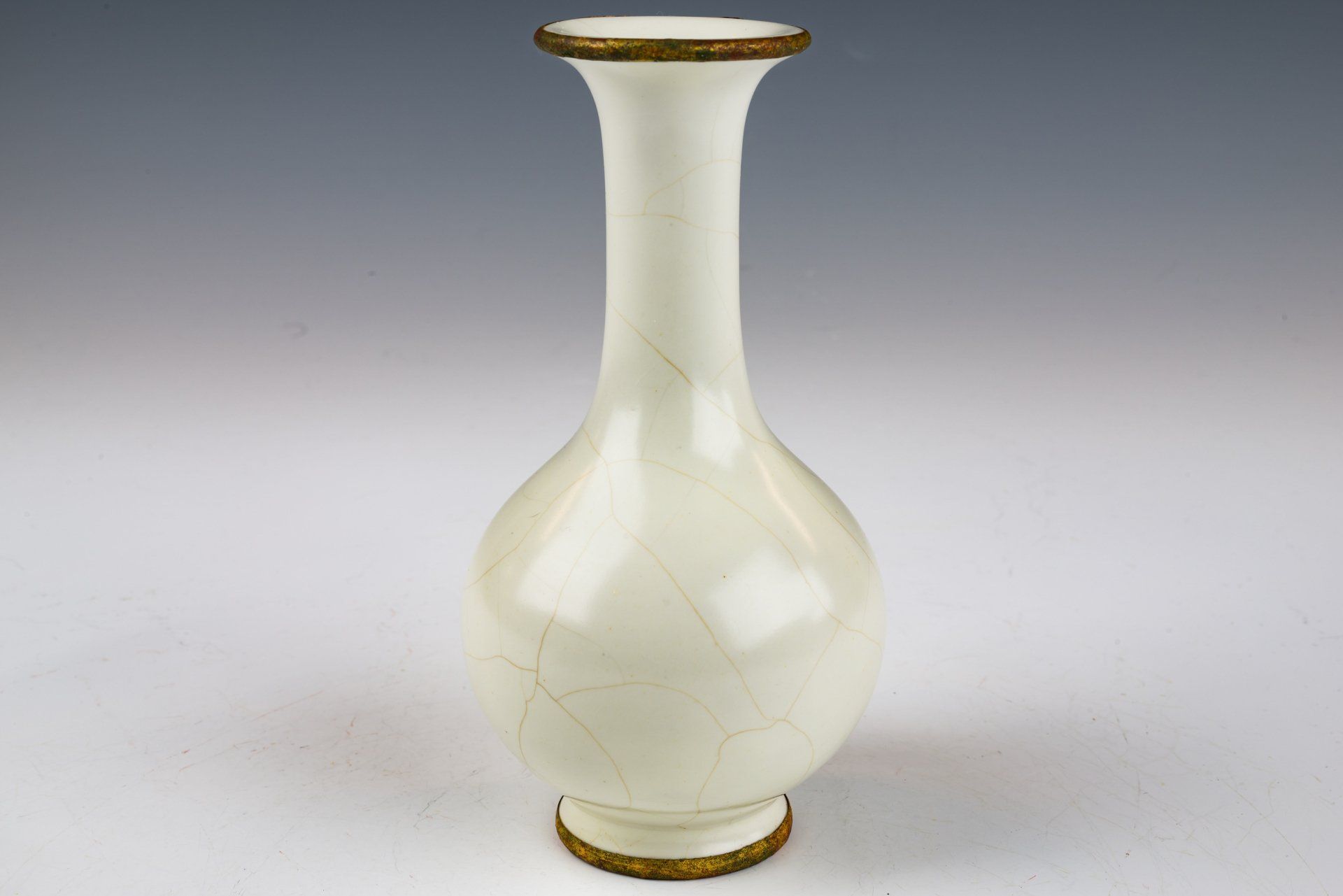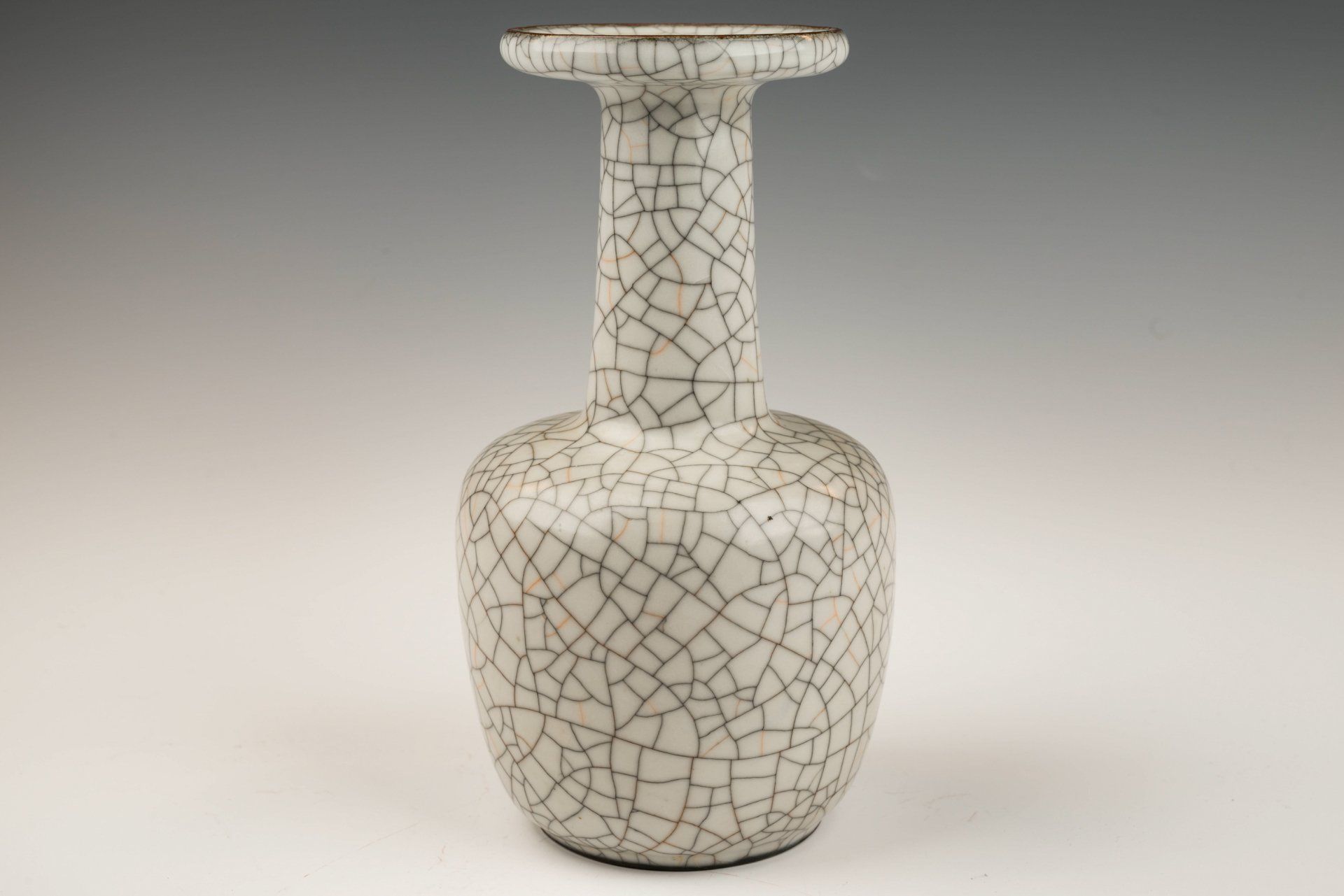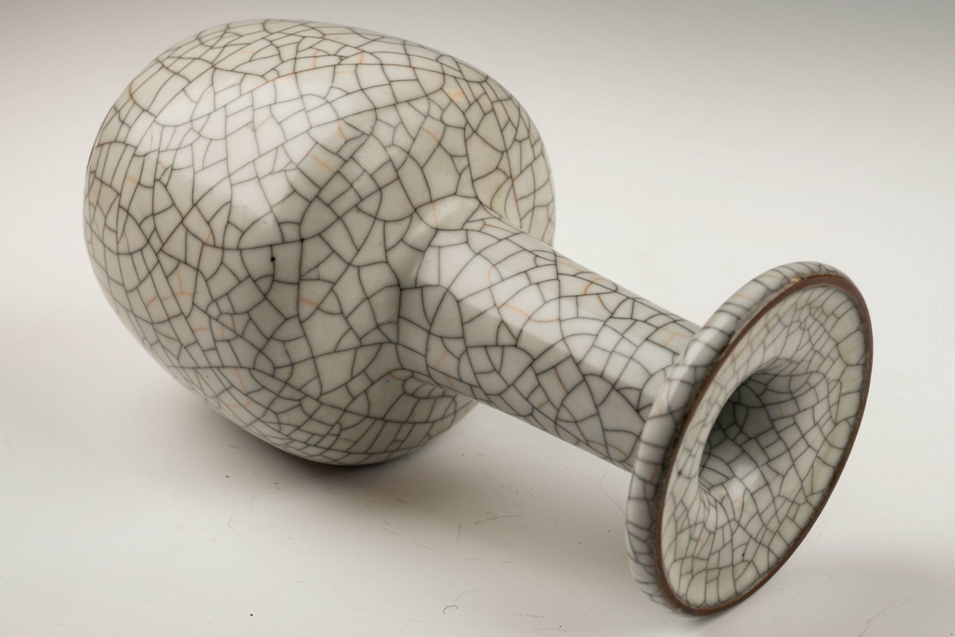 Masterpiece Guan Ware Mallet-Form Vase: This exquisitely crafted vase showcases a distinguished form, characterized by a finely potted structure. The vase features a striking crackled white glaze, interspersed with threads of gold, enhancing its aesthetic appeal. The base reveals the dark brown biscuit associated with Song Dynasty Guan Ware. Following the displacement of the Imperial Court by the Jin armies during the Northern Song Dynasty, the court relocated to Hangzhou in 1127 A.D., establishing the Southern Song Dynasty. The vase stands at a height of 8 1/2 inches. ppjrs