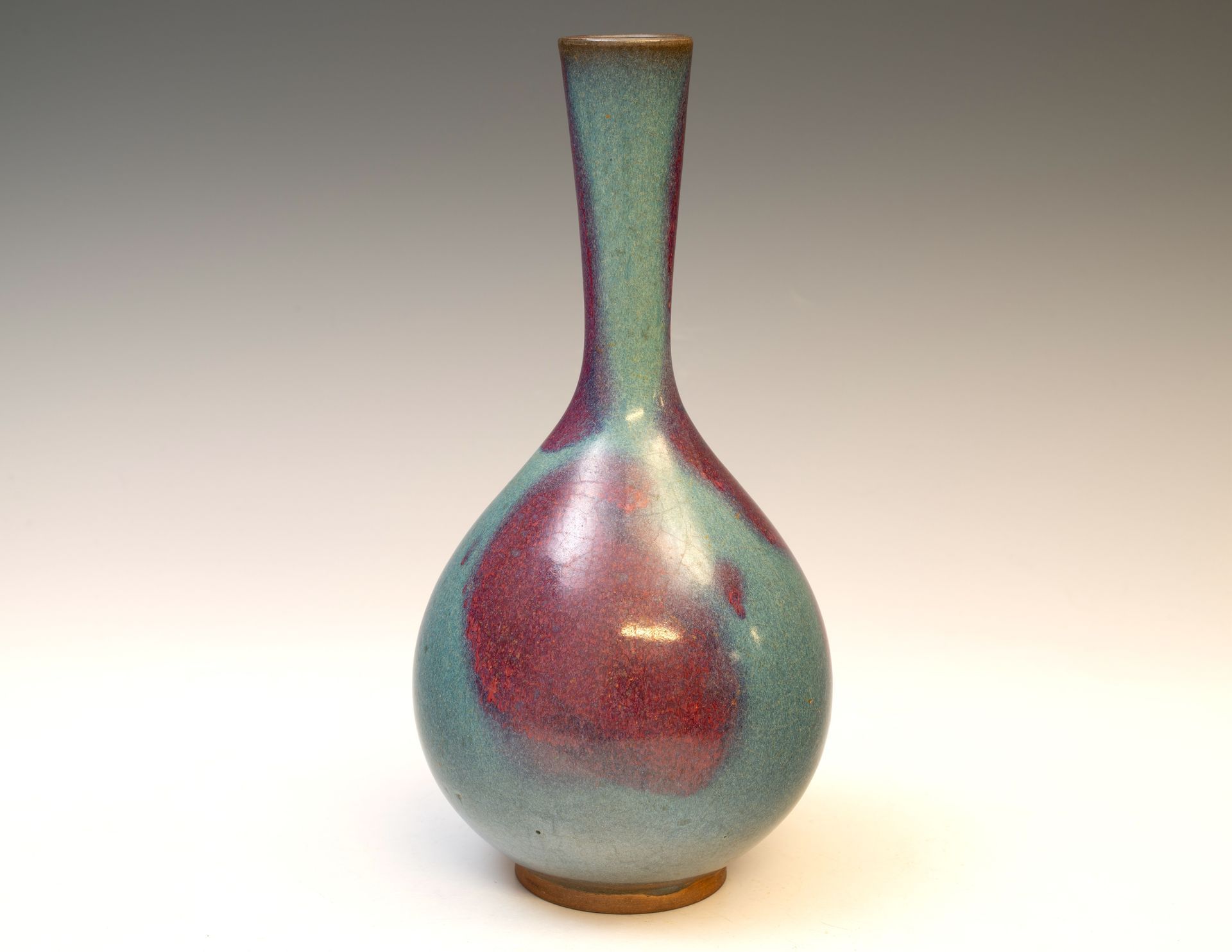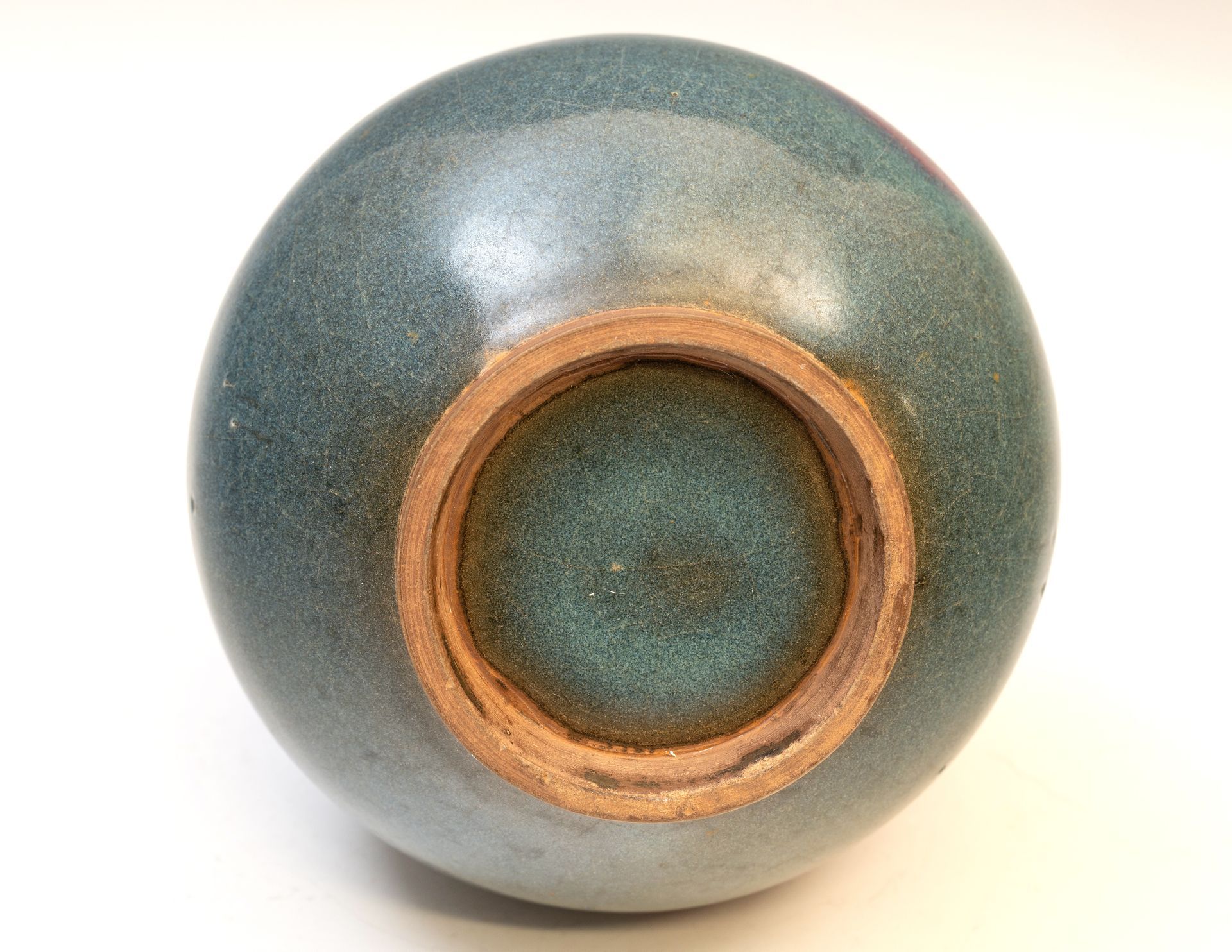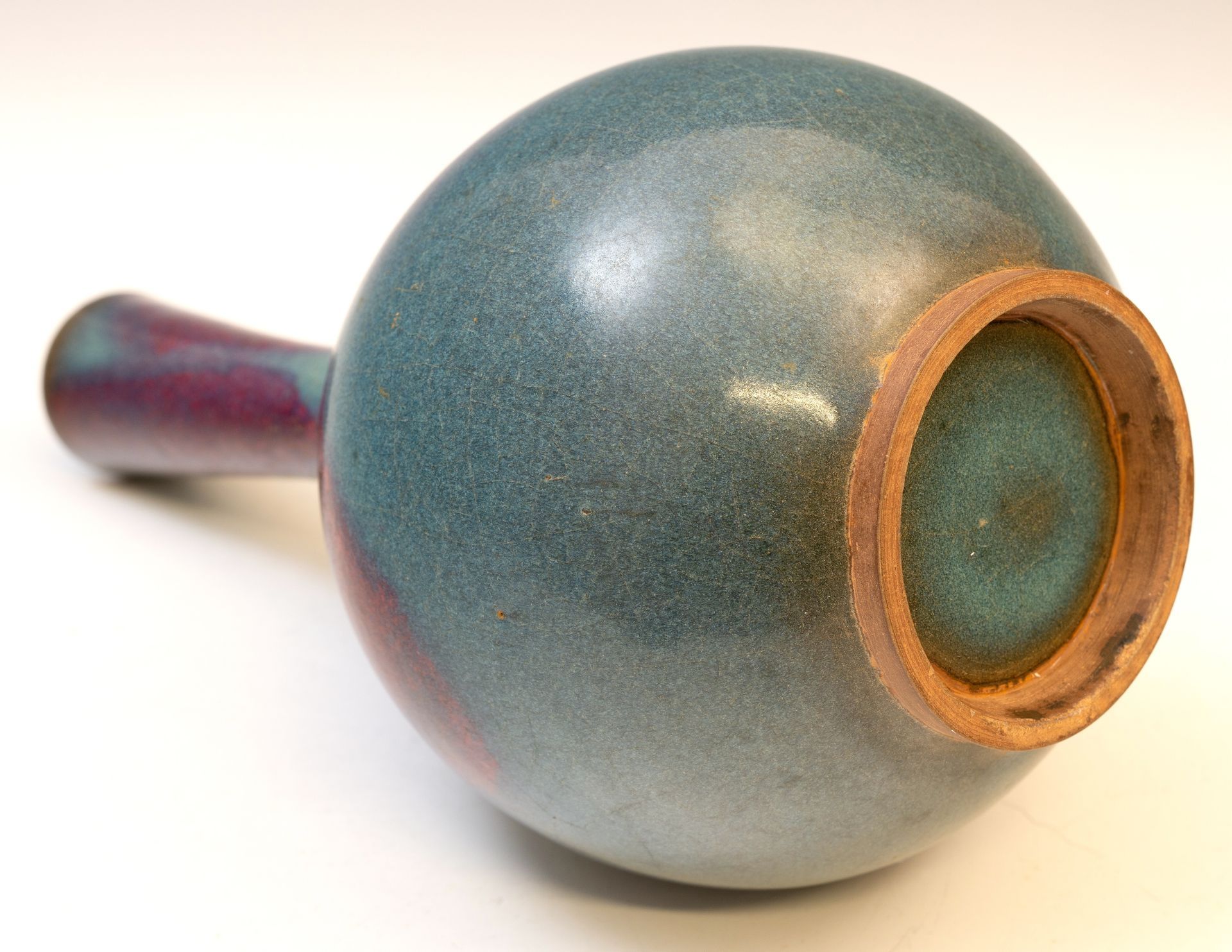 This exquisite vase, originating from the Northern Song Dynasty and attributed to the Jun Kiln, exemplifies the artistry of Jun ware. Characterized by its pear shape and elongated neck, the vase features a captivating blue glaze interspersed with violet splashes across both the neck and the body. Additionally, fine crackling is present throughout the surface, adding to its aesthetic appeal. The vase stands at approximately 9.5 inches in height, showcasing the craftsmanship and cultural significance of this historical period. ppjrs