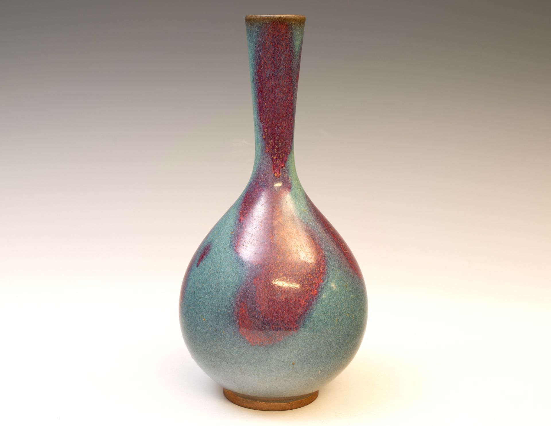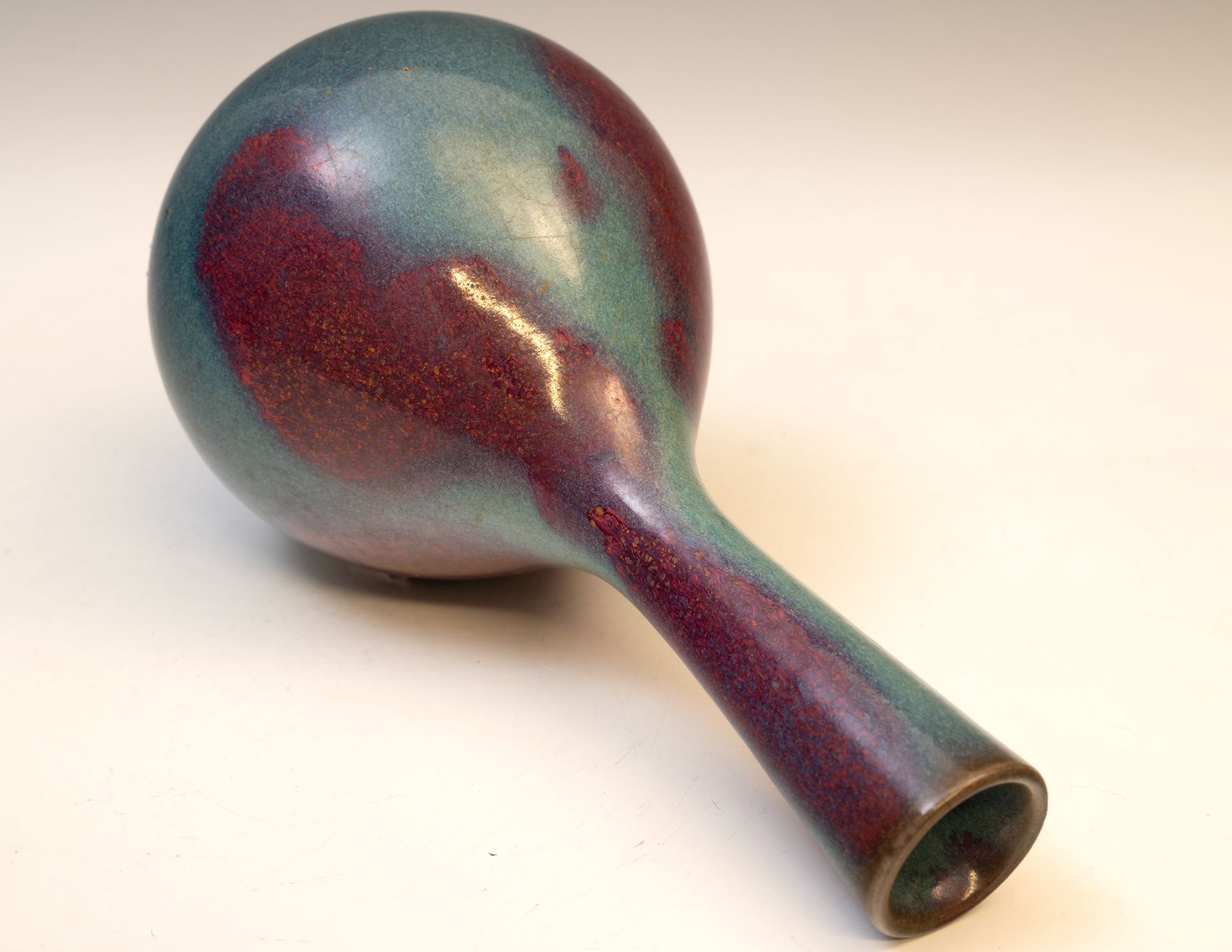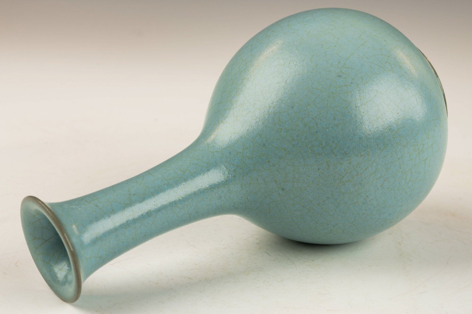 This exquisite vase, originating from the Northern Song Dynasty and attributed to the Jun Kiln, exemplifies the artistry of Jun ware. Characterized by its pear shape and elongated neck, the vase features a captivating blue glaze interspersed with violet splashes across both the neck and the body. Additionally, fine crackling is present throughout the surface, adding to its aesthetic appeal. The vase stands at approximately 9.5 inches in height, showcasing the craftsmanship and cultural significance of this historical period. ppjrs