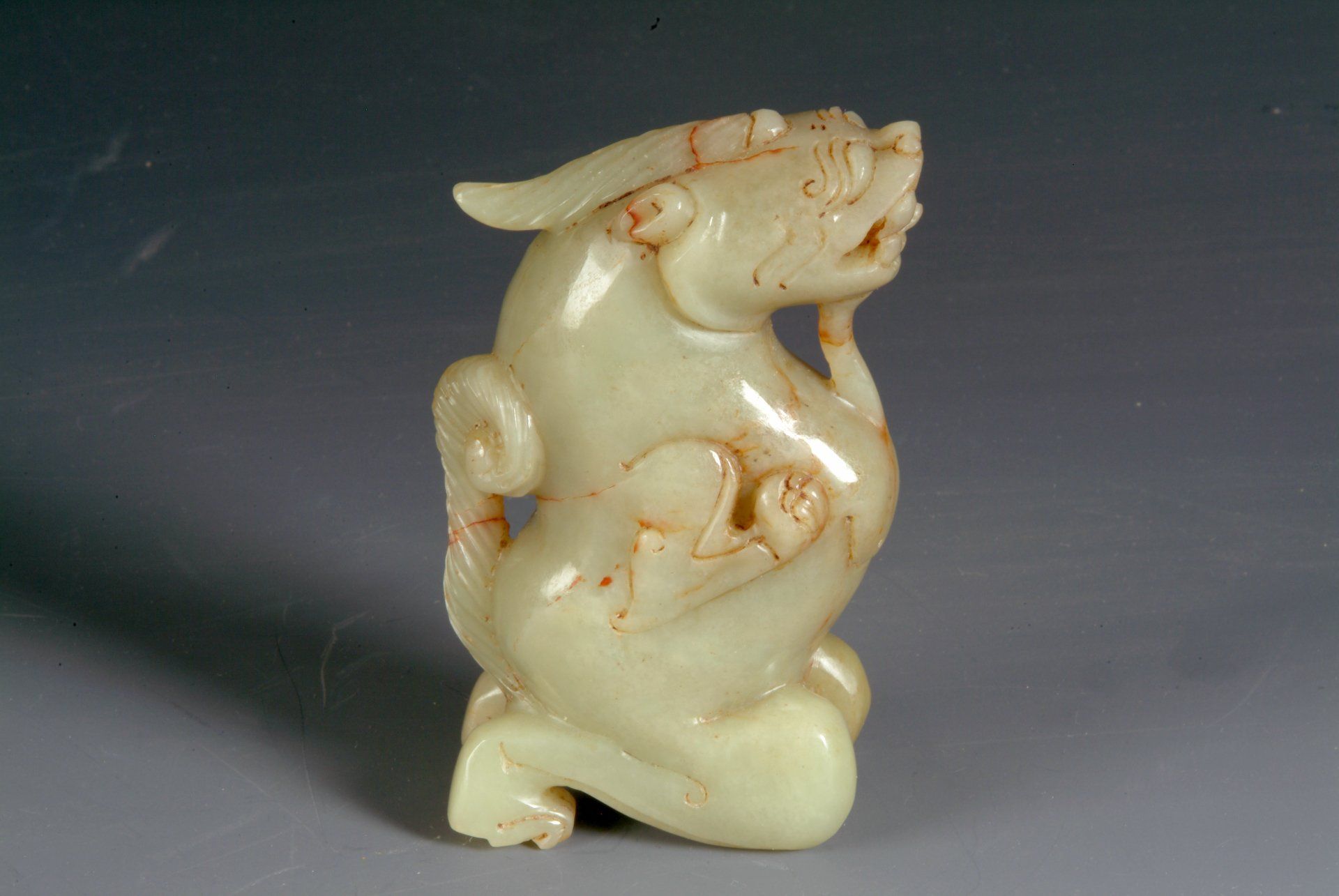 Ming Dynasty Yellow and Celadon Jade Kneeling Mythical Creature Sculpture