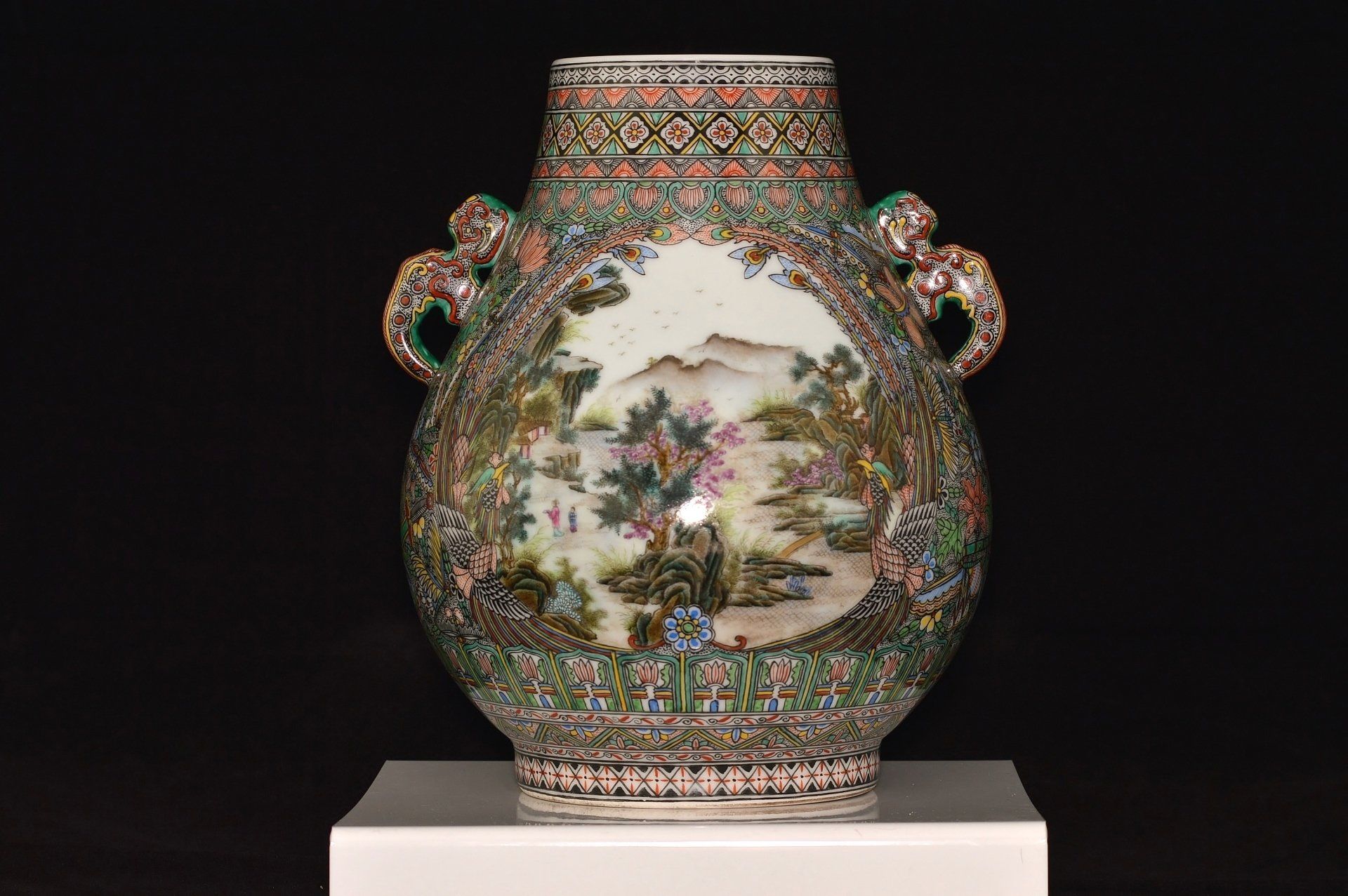 **Chinese Antique Porcelain: Qing Dynasty Qianlong Marked and Period Famille Rose Landscape Vase** We are pleased to present an exceptionally rare and exquisite Famille Rose landscape vase, marked and produced during the Qianlong period (1736-1795). This remarkable piece features a Hu form and showcases motifs reminiscent of Islamic tile artistry, an influence that appeared intermittently in select porcelains during the Qianlong era. This elegantly painted vase exhibits a high level of craftsmanship, adorned with two meticulously detailed landscape panels depicting serene valleys. Each panel is intricately framed by dual phoenix figures, enhancing the overall aesthetic. The mark is strategically aligned with the principal panel, adhering to the characteristics typical of Imperial Qianlong porcelain. Recognized as the zenith of porcelain production in China, the Qianlong period holds significant historical and artistic value, and this vase epitomizes that legacy. The vase stands at approximately 10 1/2 inches tall. Should you have any inquiries regarding this distinguished piece, please do not hesitate to reach out.(click photo to enlarge)